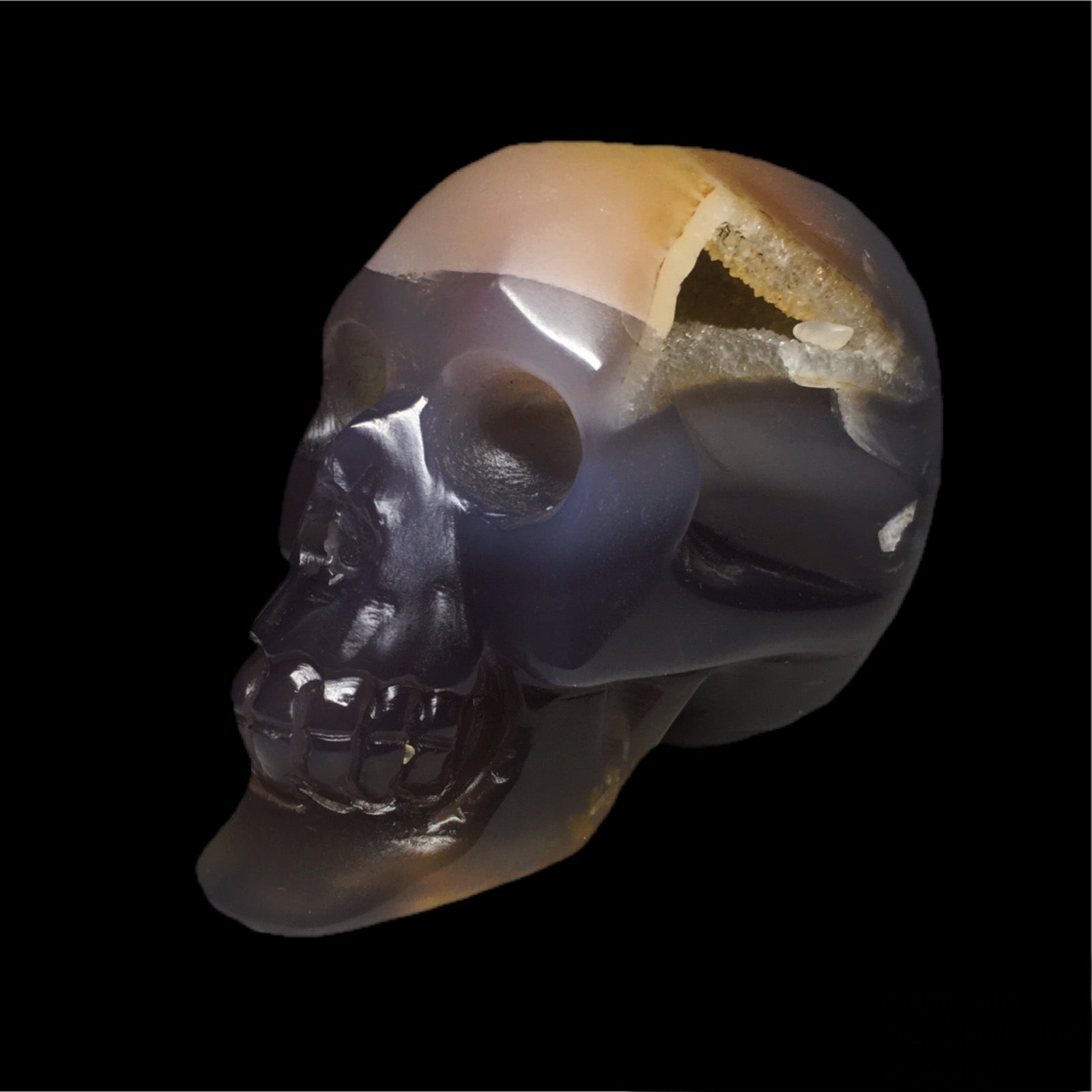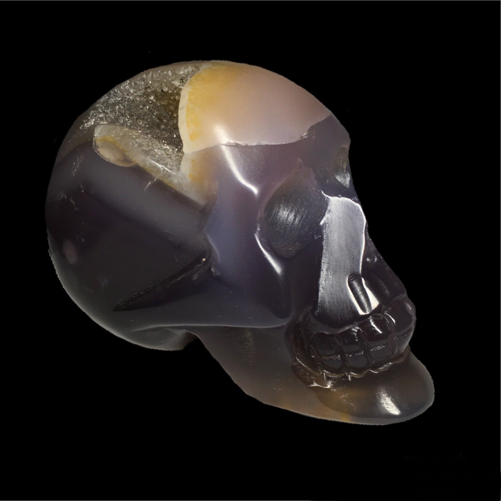 Carved from a natural geode and showing off a "hole in the head" made from crystals, you can see all the way through the skull. The beautiful purples and yellow of the stone emanate a truly mystical feel that you'll just want to show off!