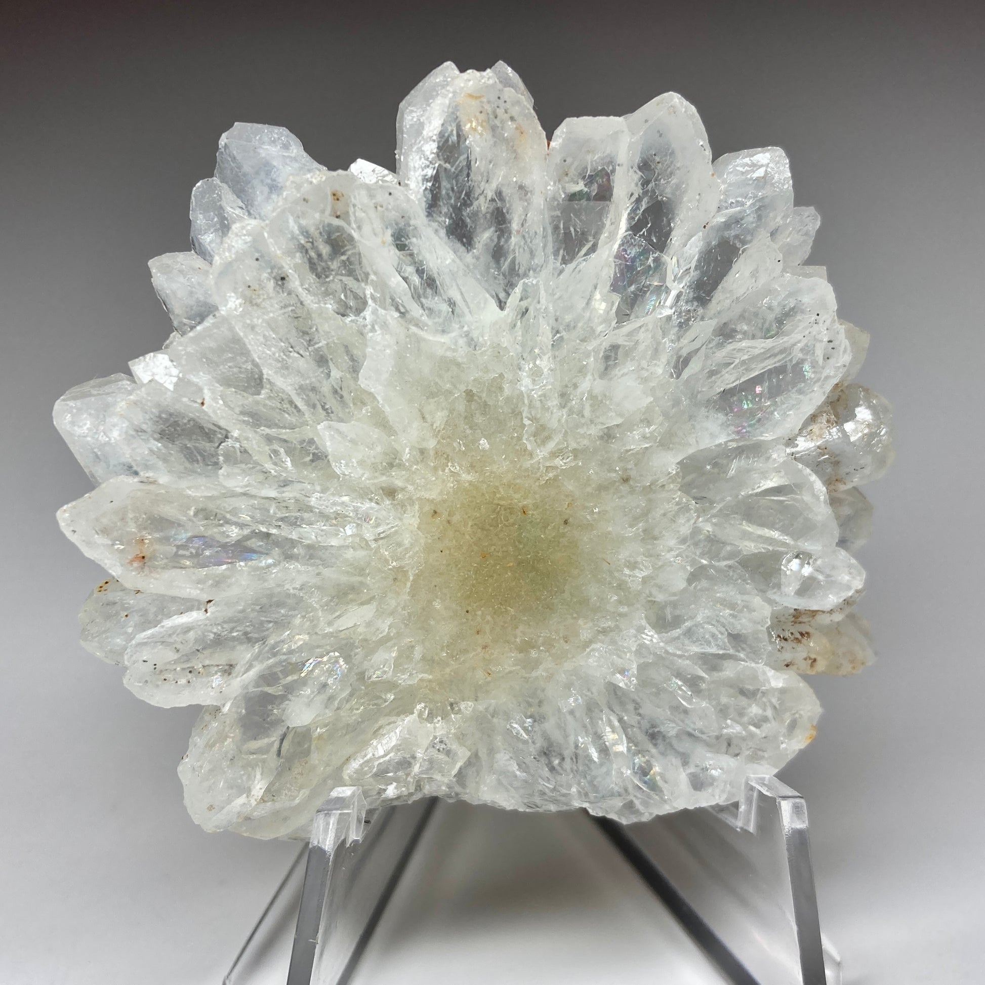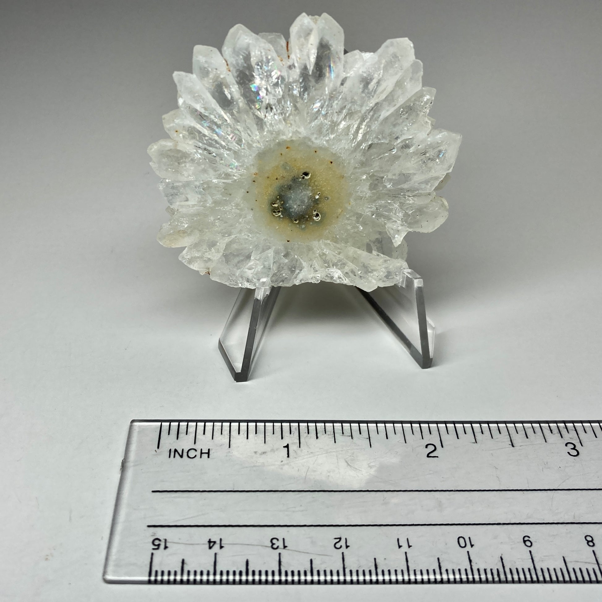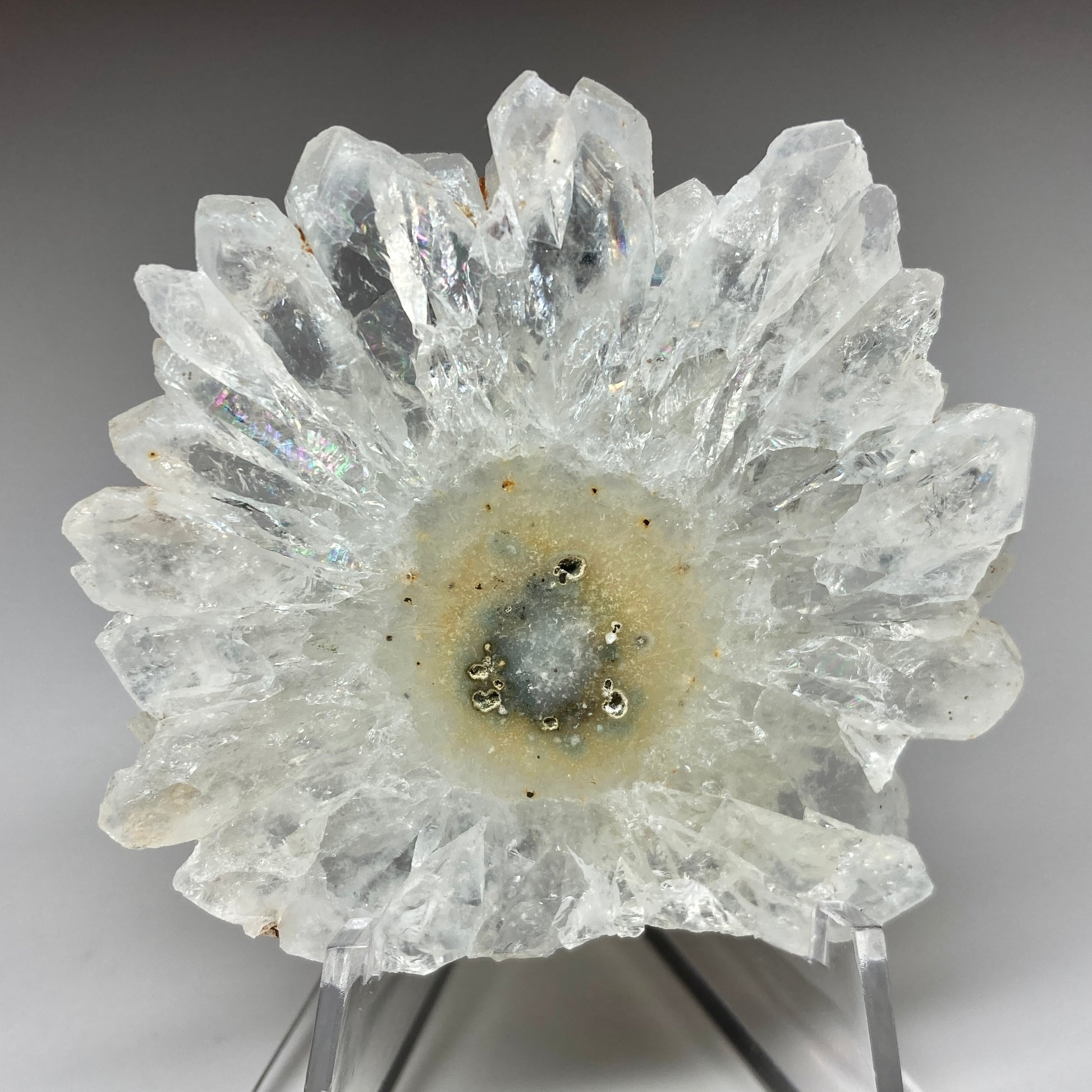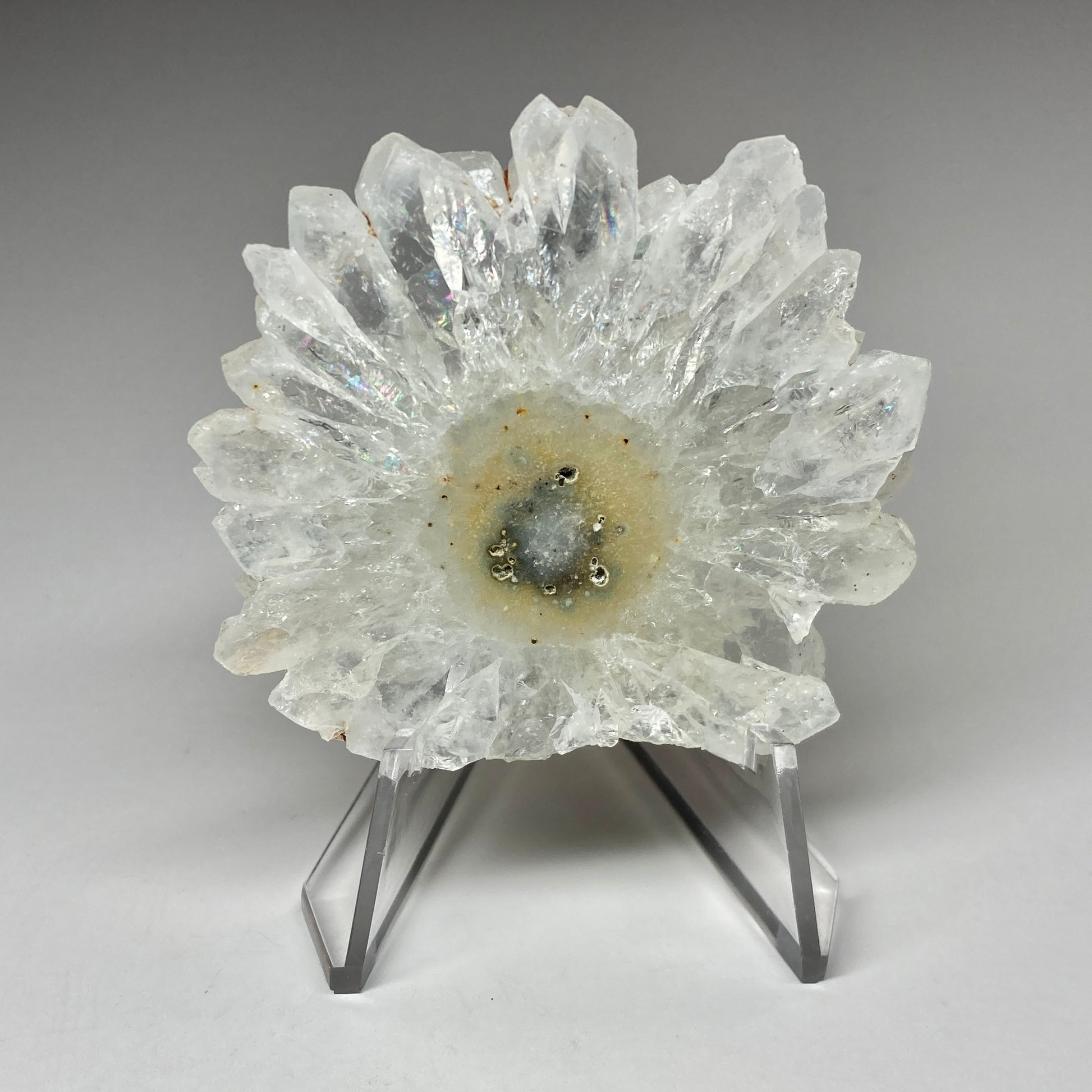 The middle core is made of agate with beautiful clear quartz crystals fanning out from the center. Unlike other limestone and calcite stalactites that form in caves, these stalactites are made within quartz cavities in a hydrothermal igneous formation. The multicolored agate center is formed when the chemicals and minerals in the water change as it runs through the cavity. The crystals then grow around the agate.