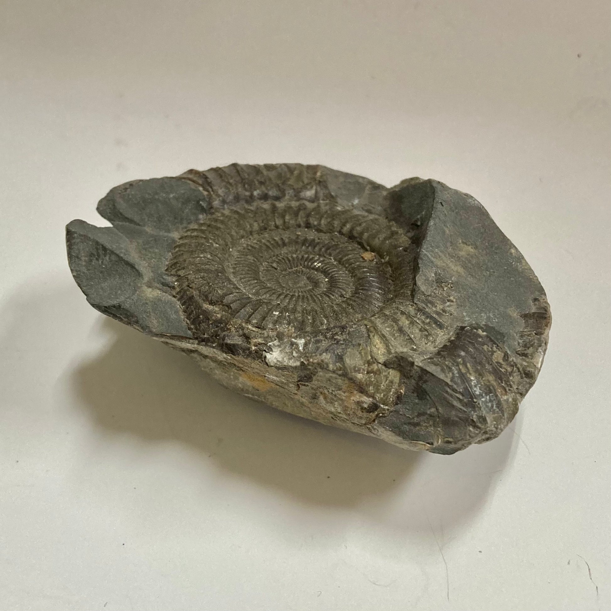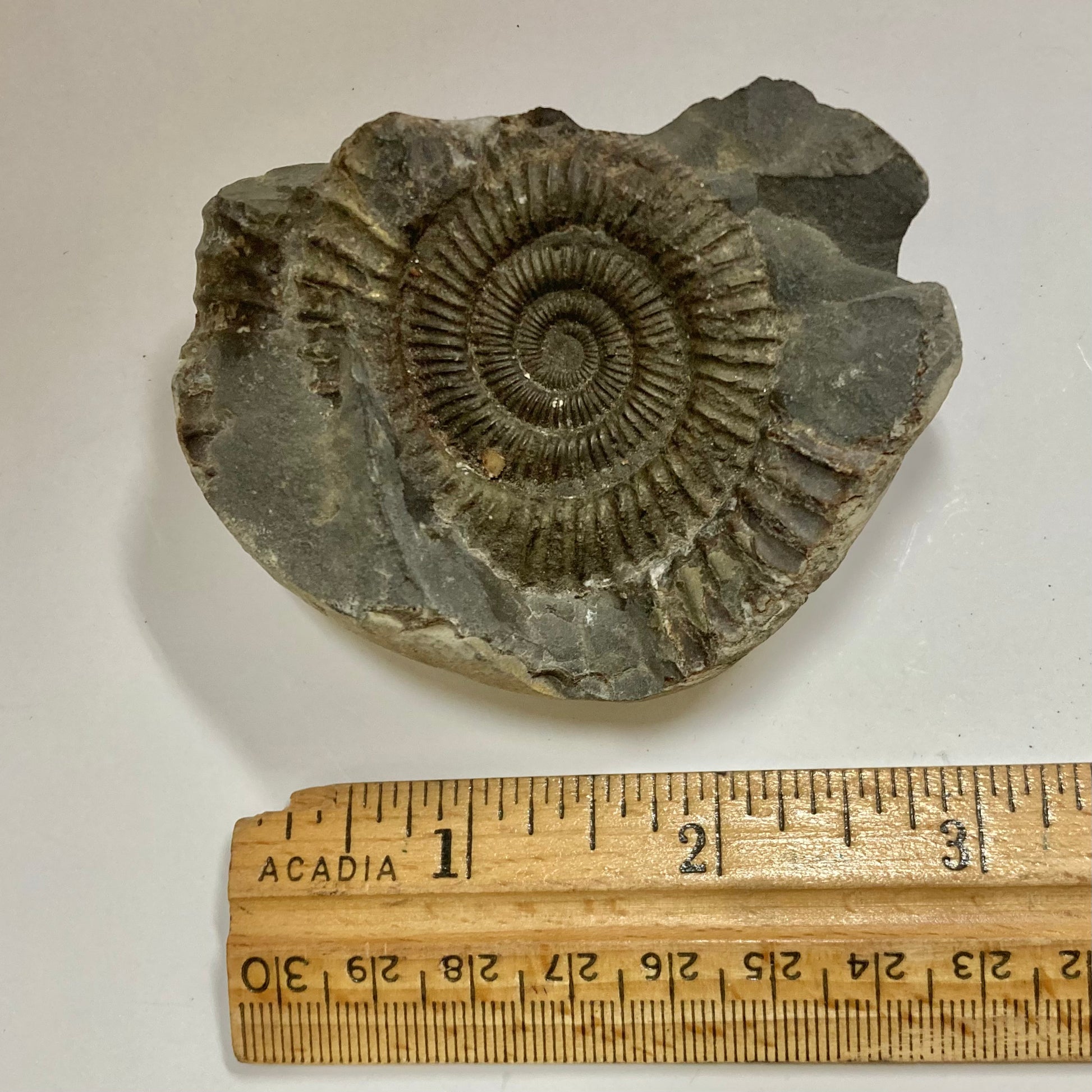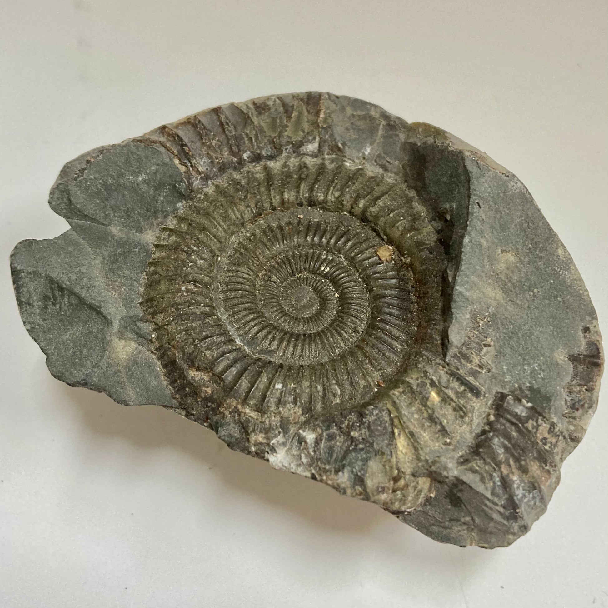 This ammonite is named after the Greek word dactyl meaning "fingers" because of the many straight ribs on its relatively small but strong shell. Mass mortality specimens are found all over the world, especially in Europe, indicating Dactylioceras may have died shortly after traveling to a specific area for spawning, allowing their shells to wash up in large quantities on the banks of the Jurassic seas.