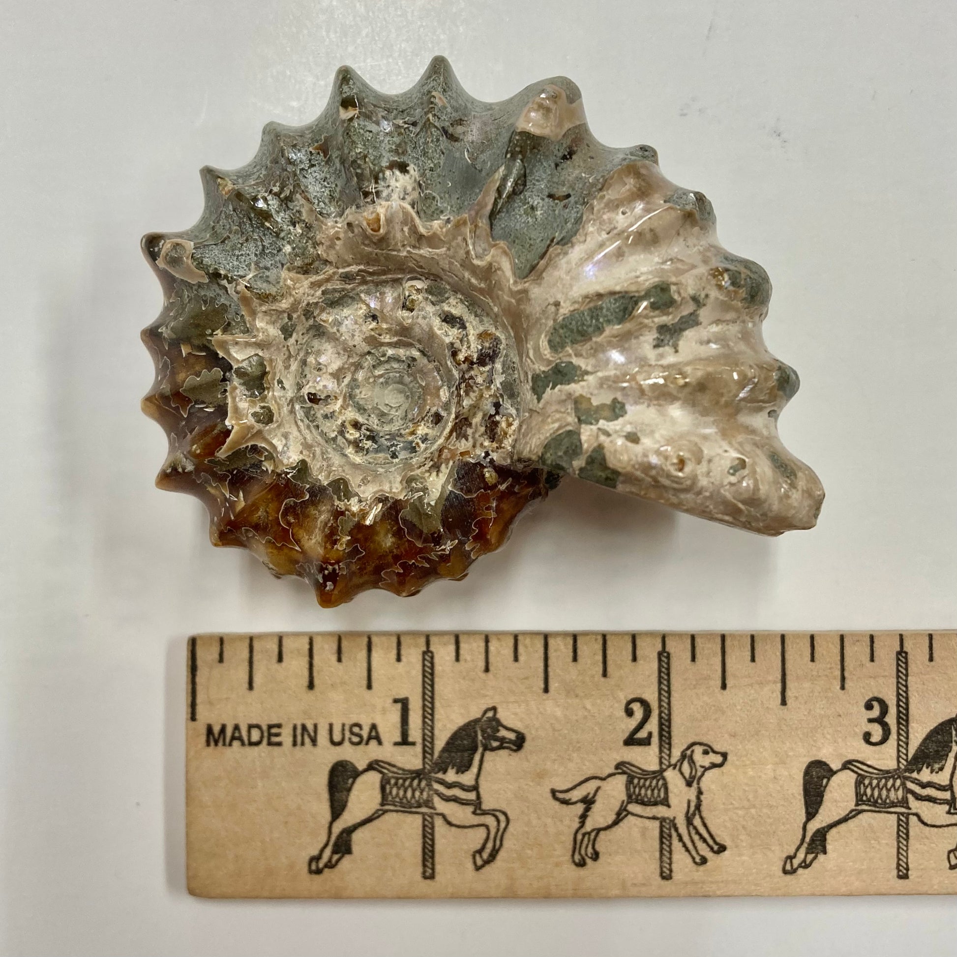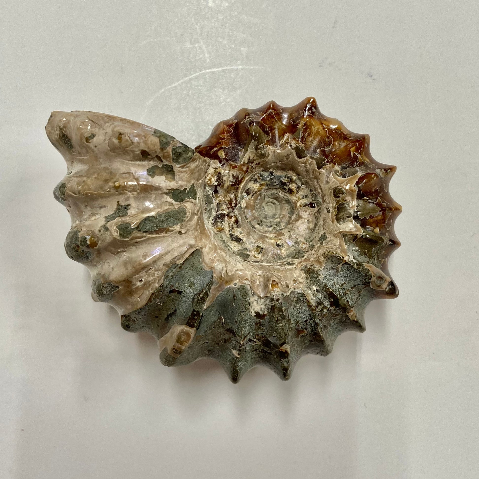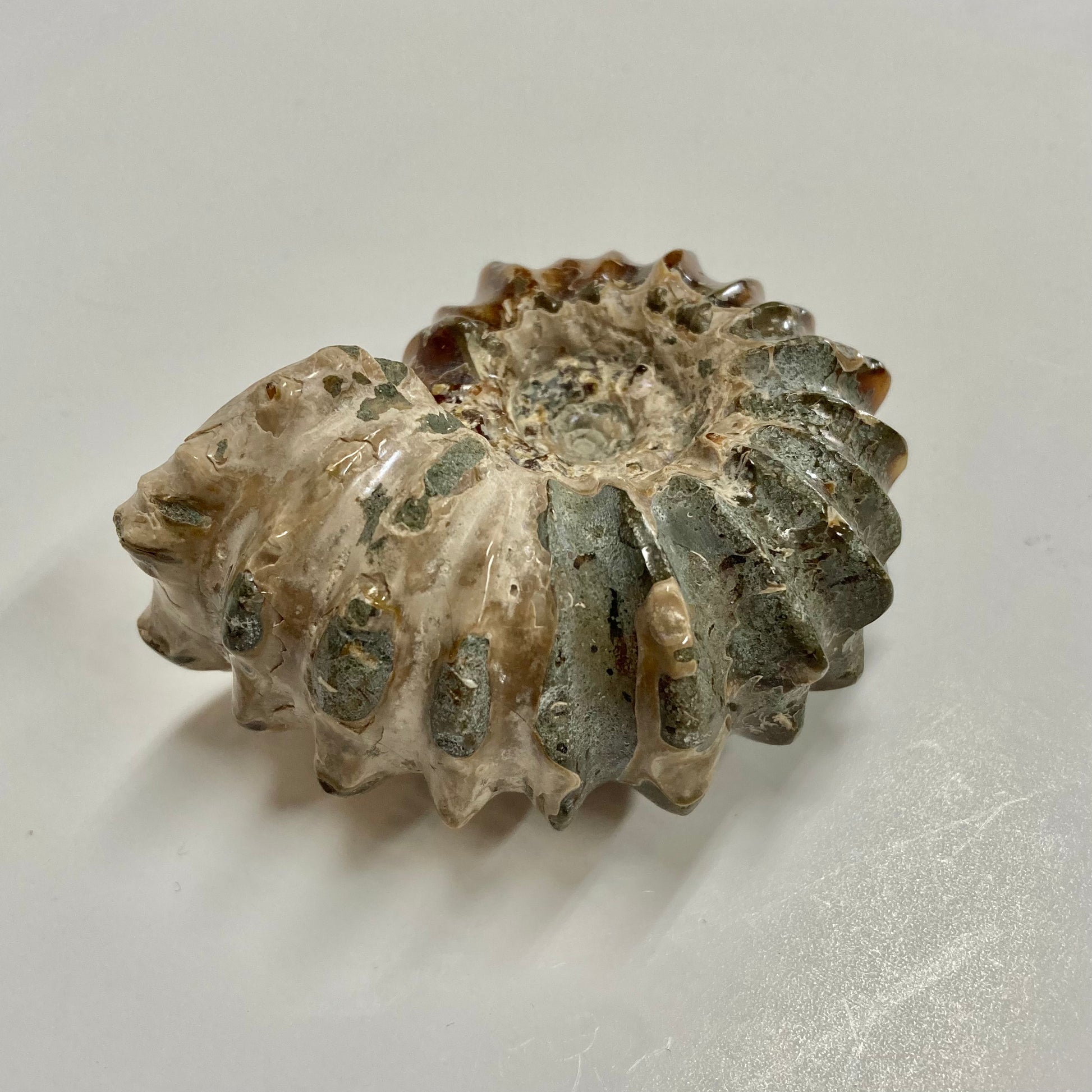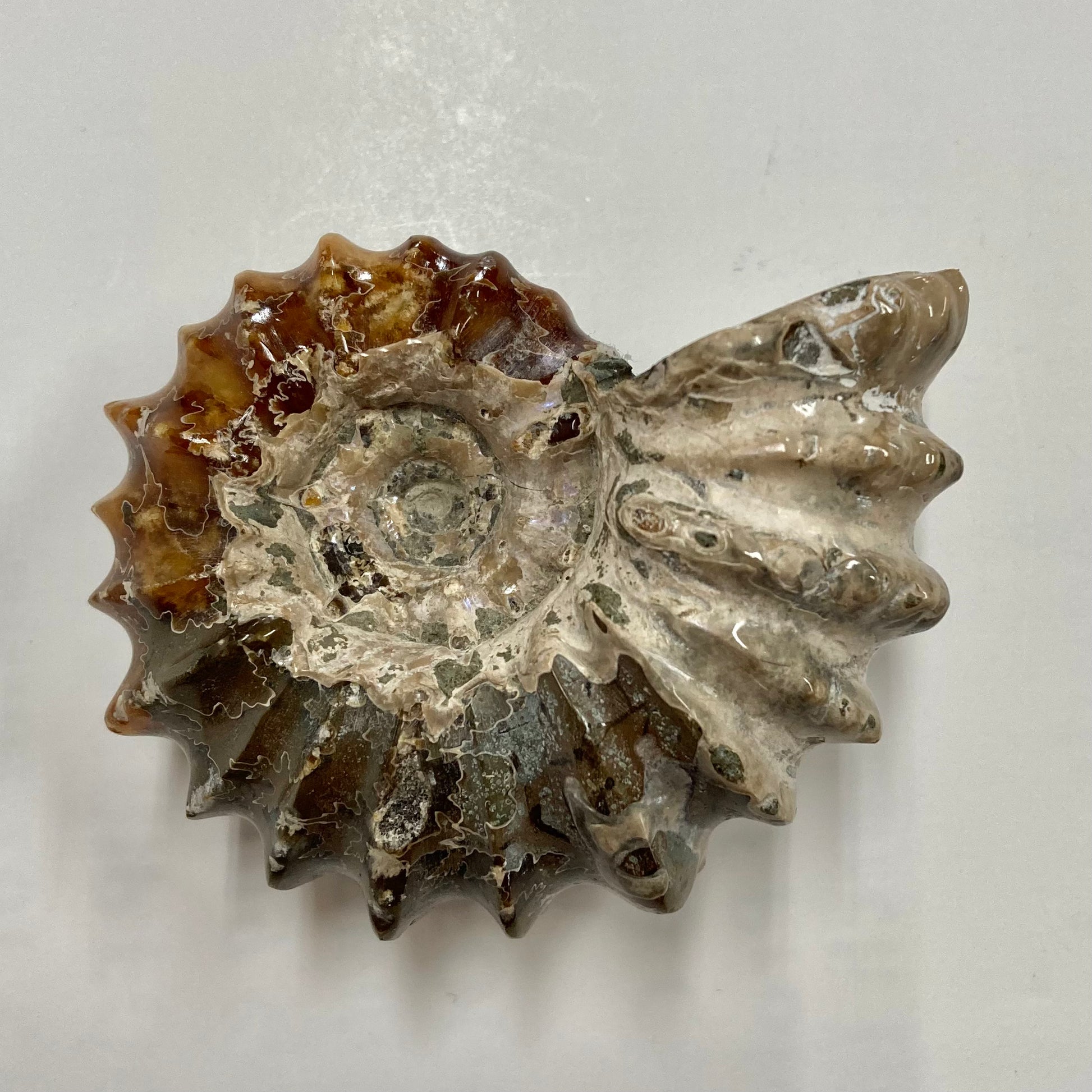 This ammonite has been polished to display the beautiful variety of browns and grays and the suture patterns of its shell. The suture pattern provided strength and protection as it traveled in the sea.