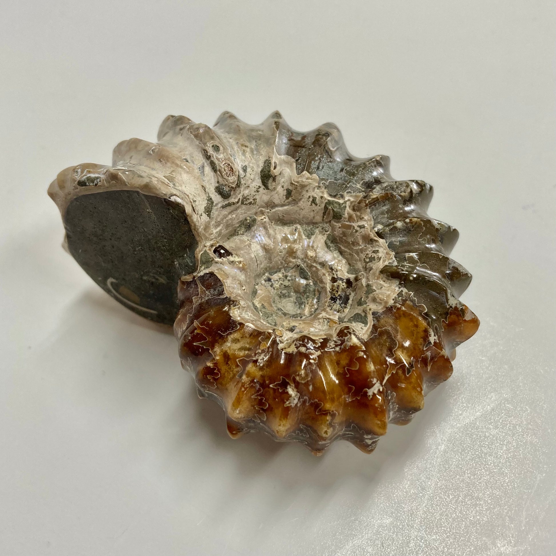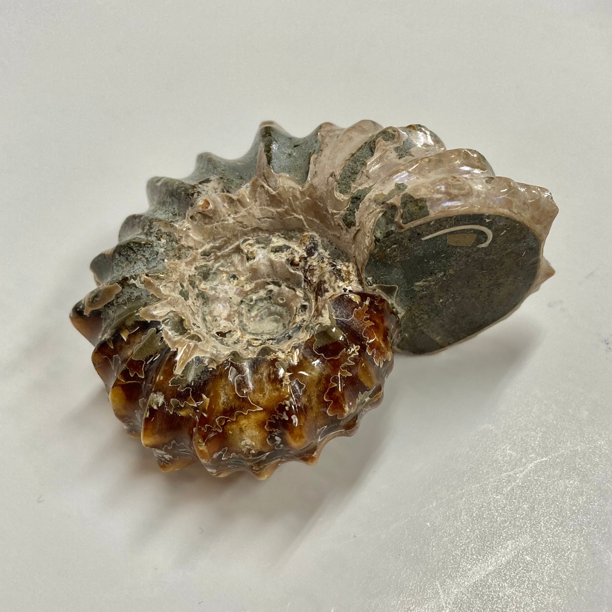 As this marine mollusk fossilized in what is now Madagascar, the original organic matter of the shell was slowly dissolved by water and replaced by minerals like calcite.