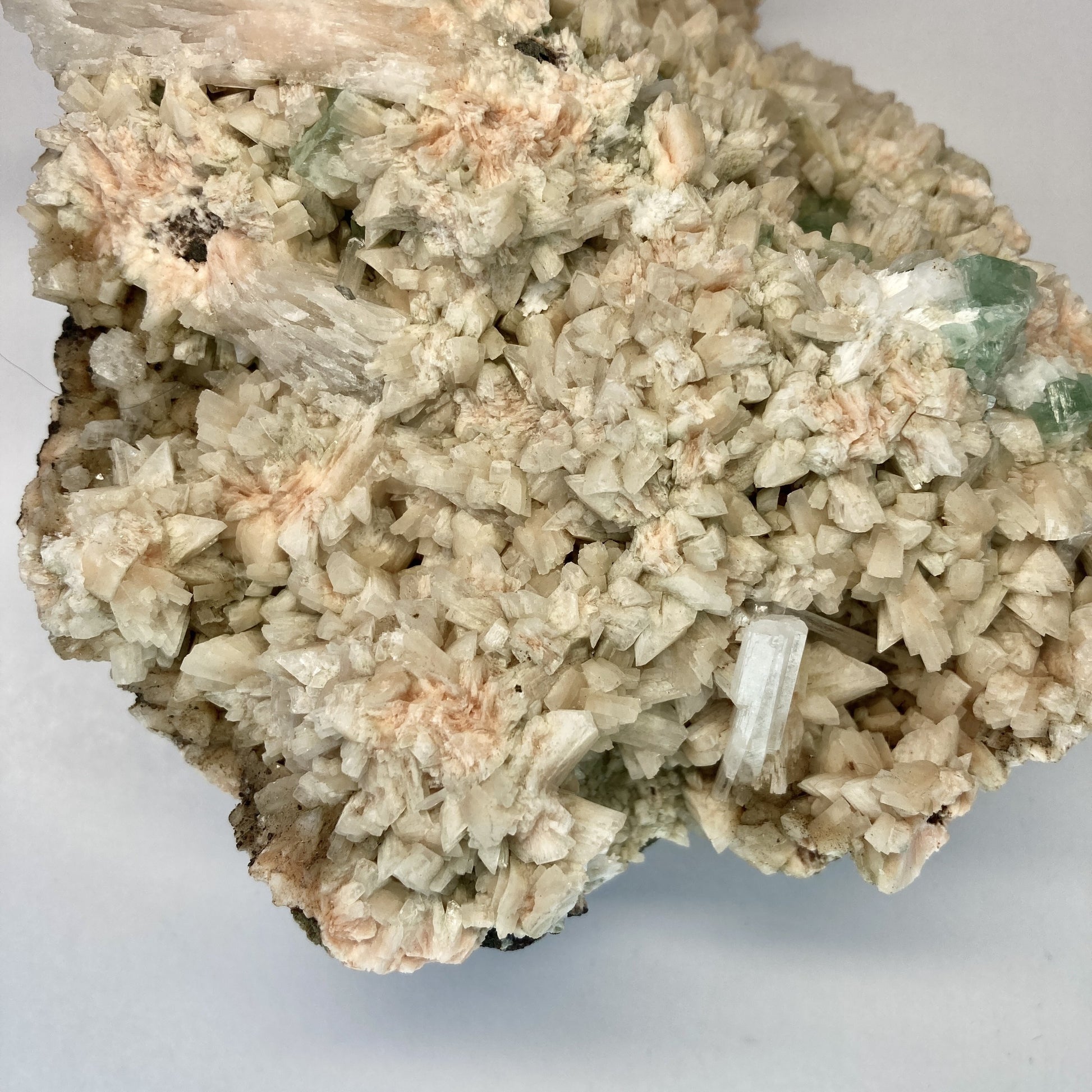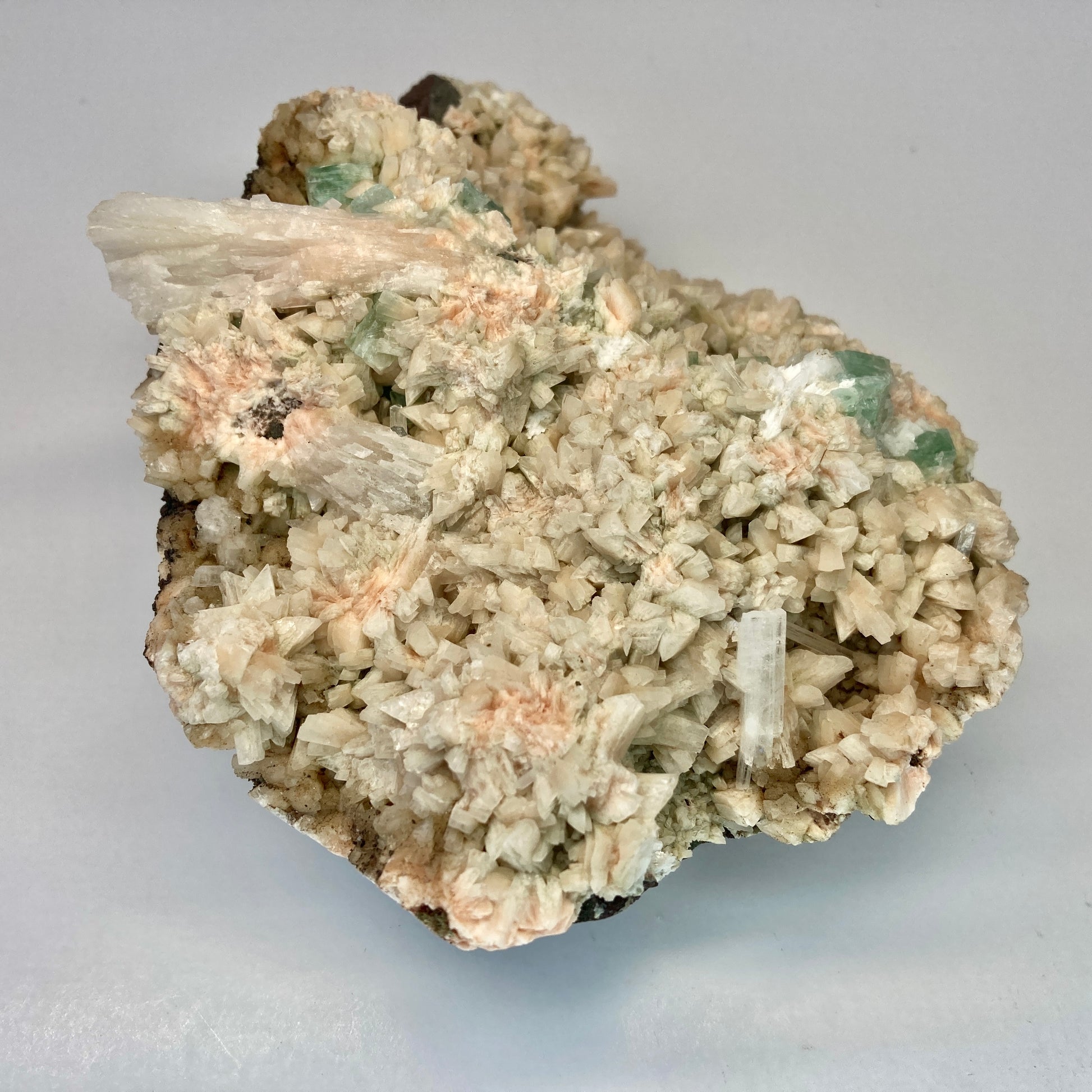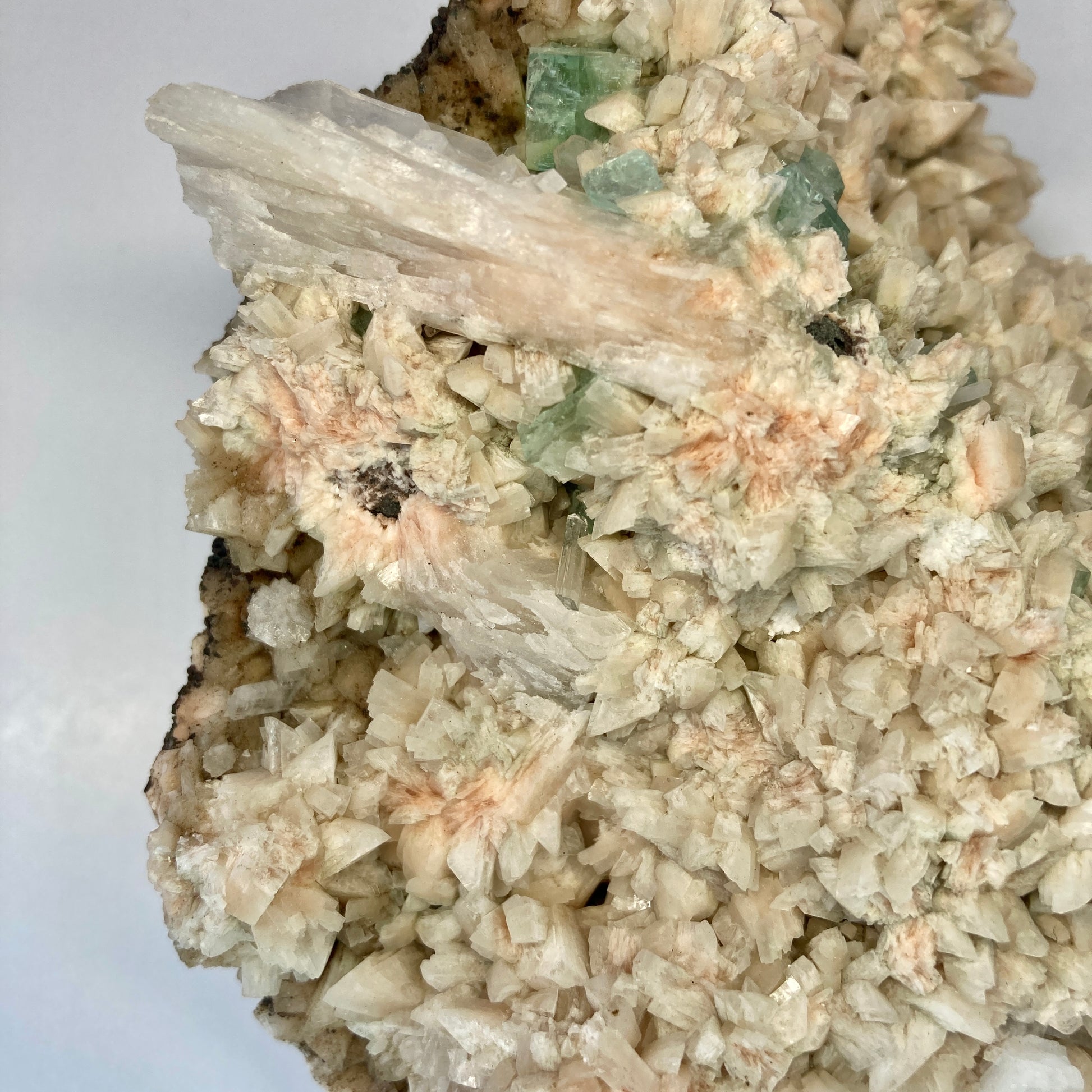 Soft white stilbite and mint green apophyllite sit within a myriad of peach heulandite crystals.