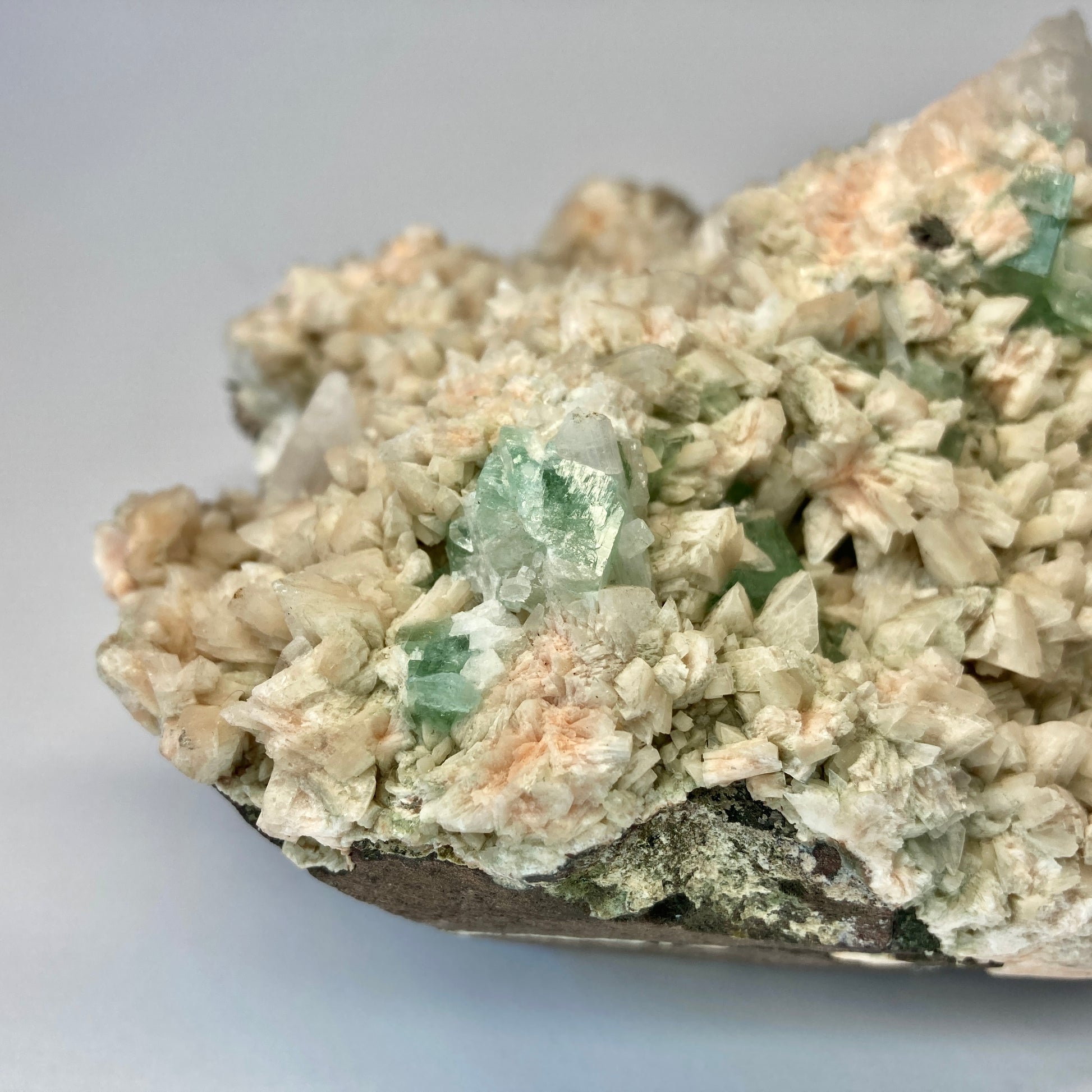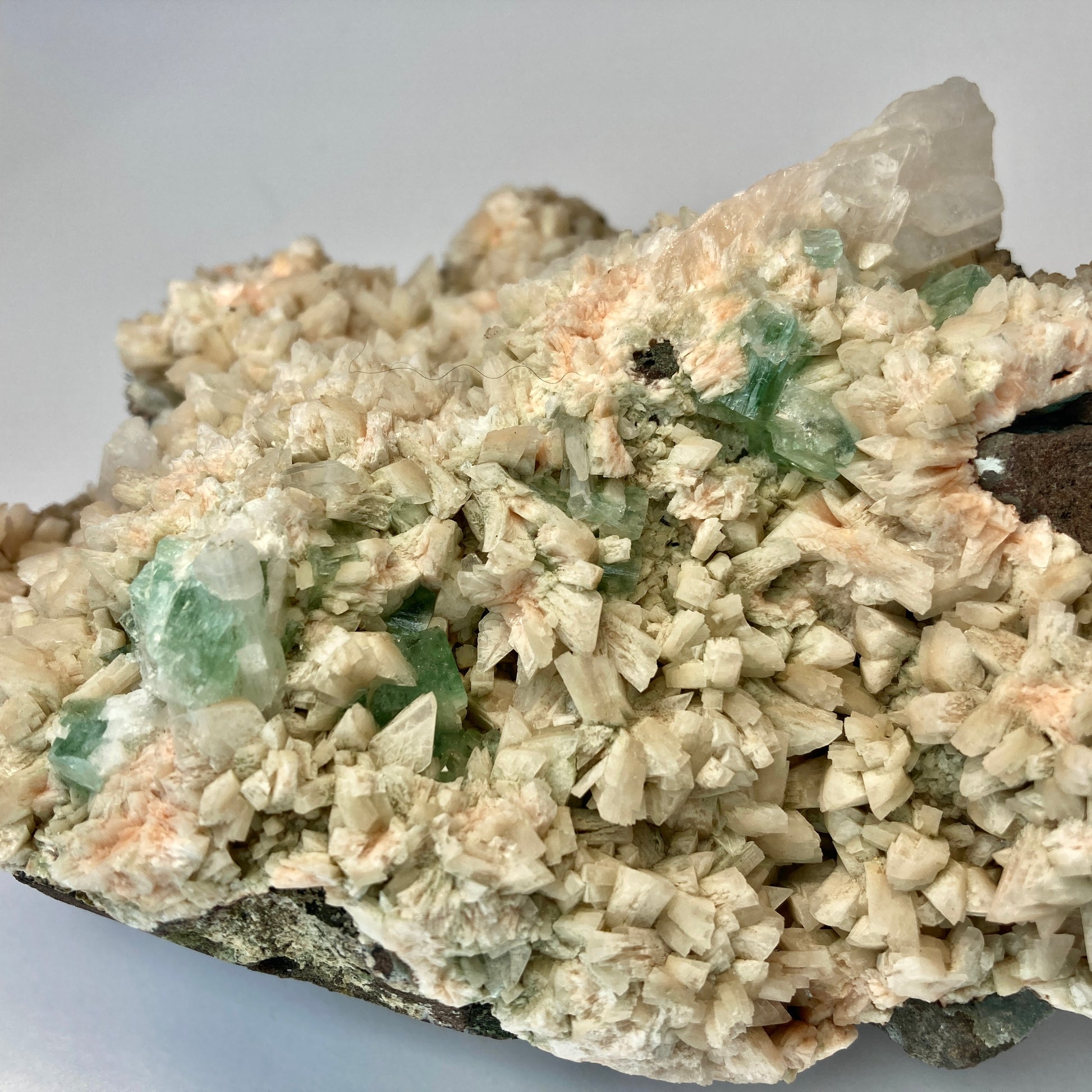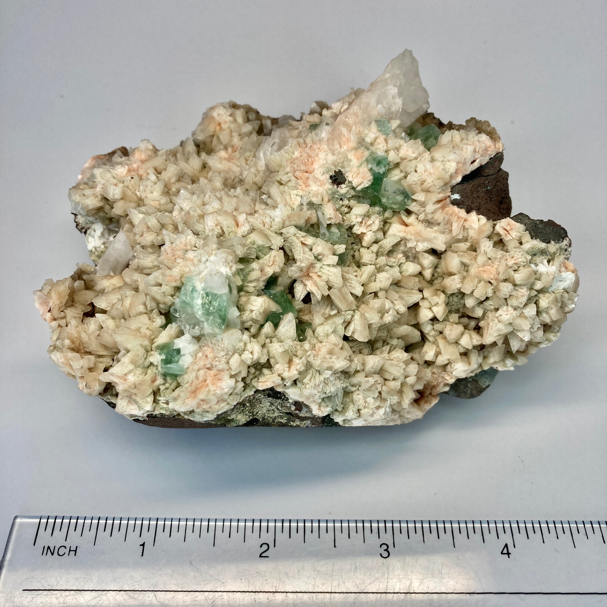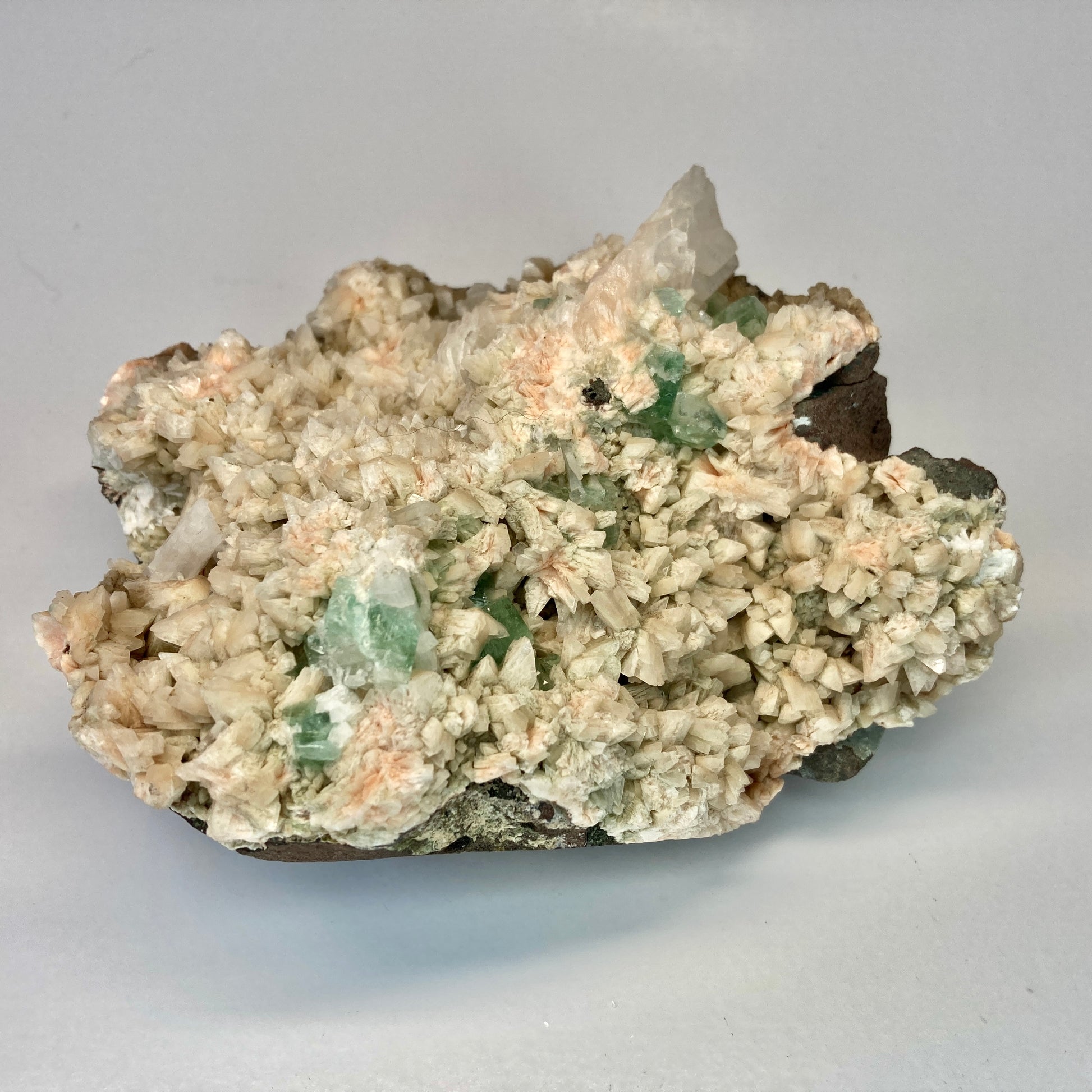 Soft white stilbite and mint green apophyllite sit within a myriad of peach heulandite crystals.