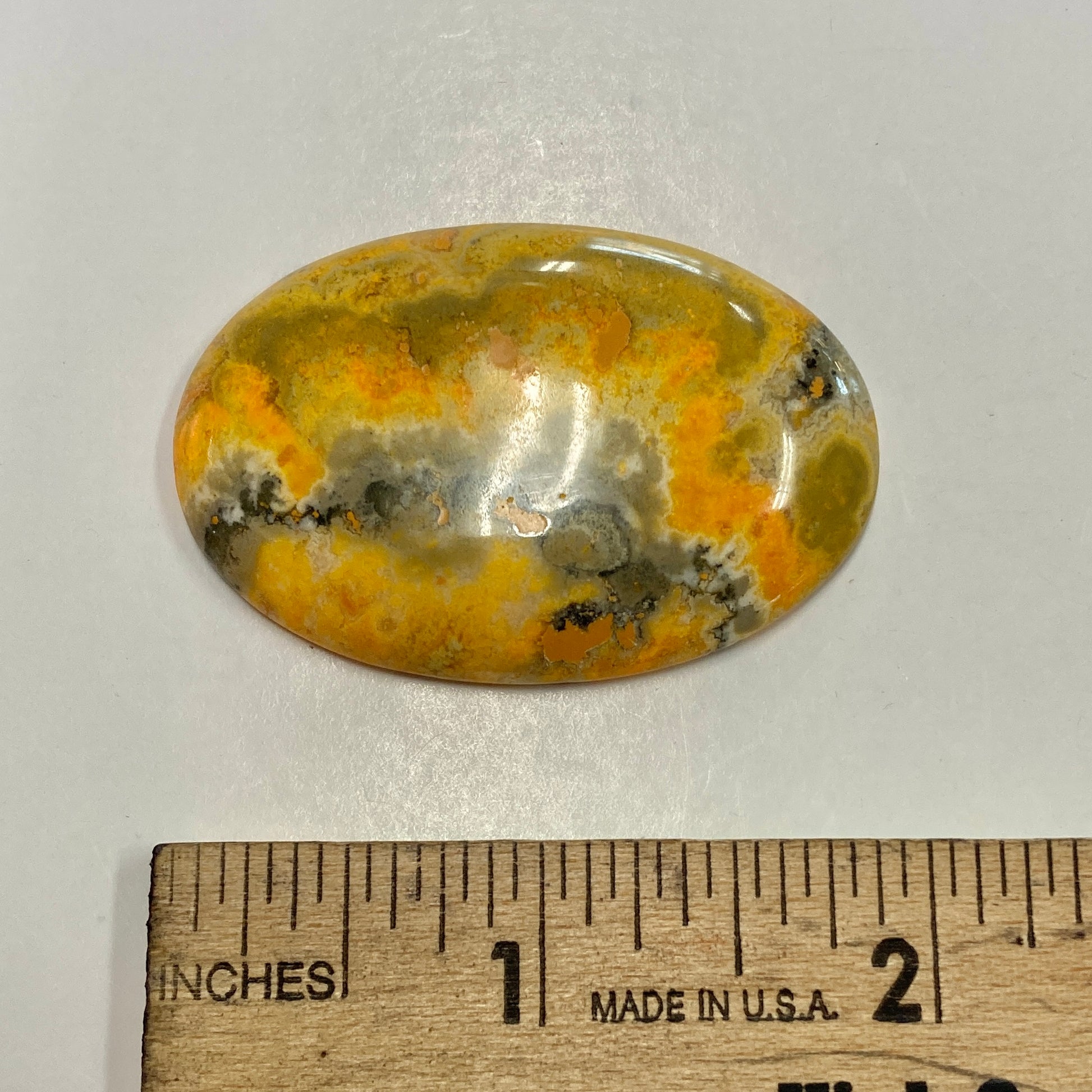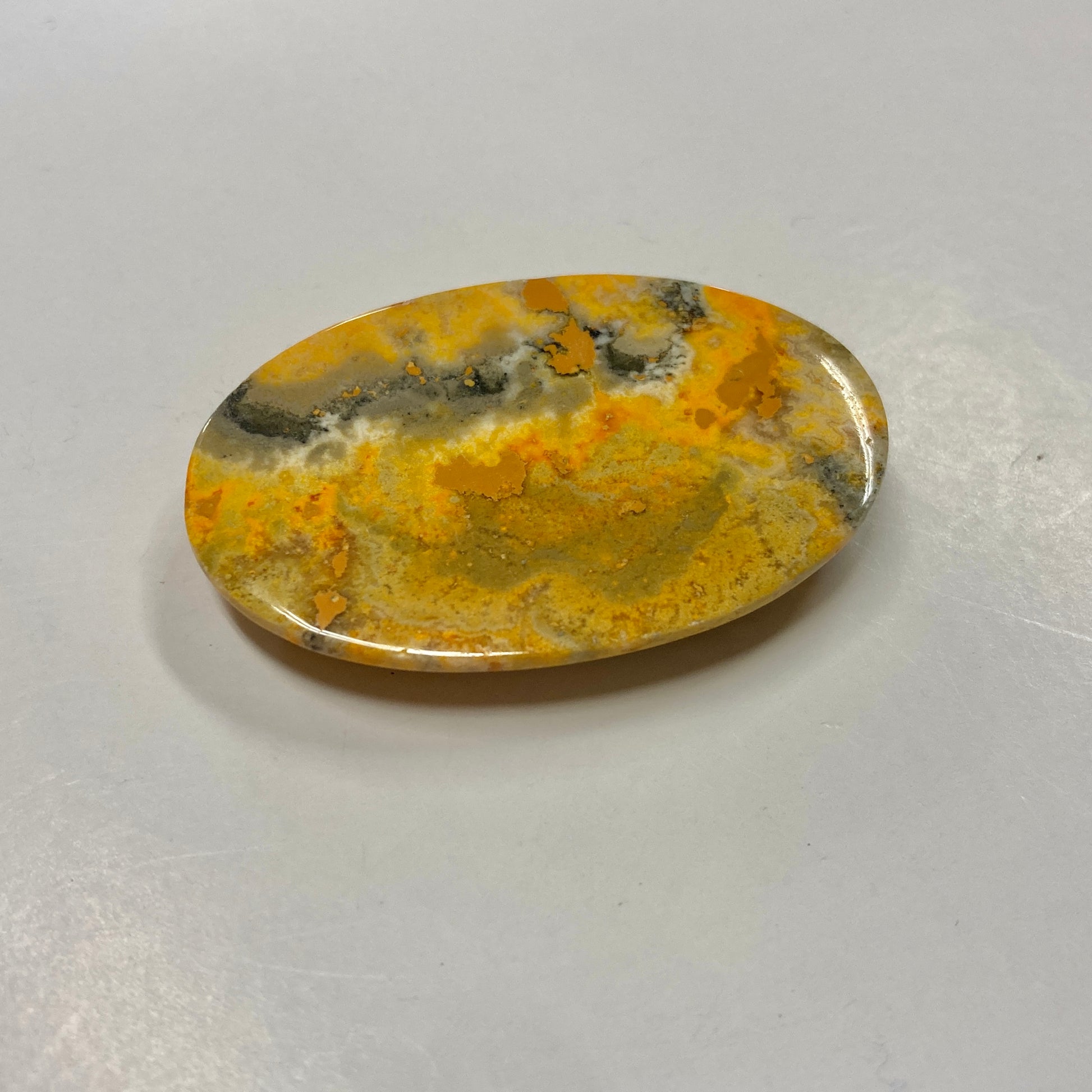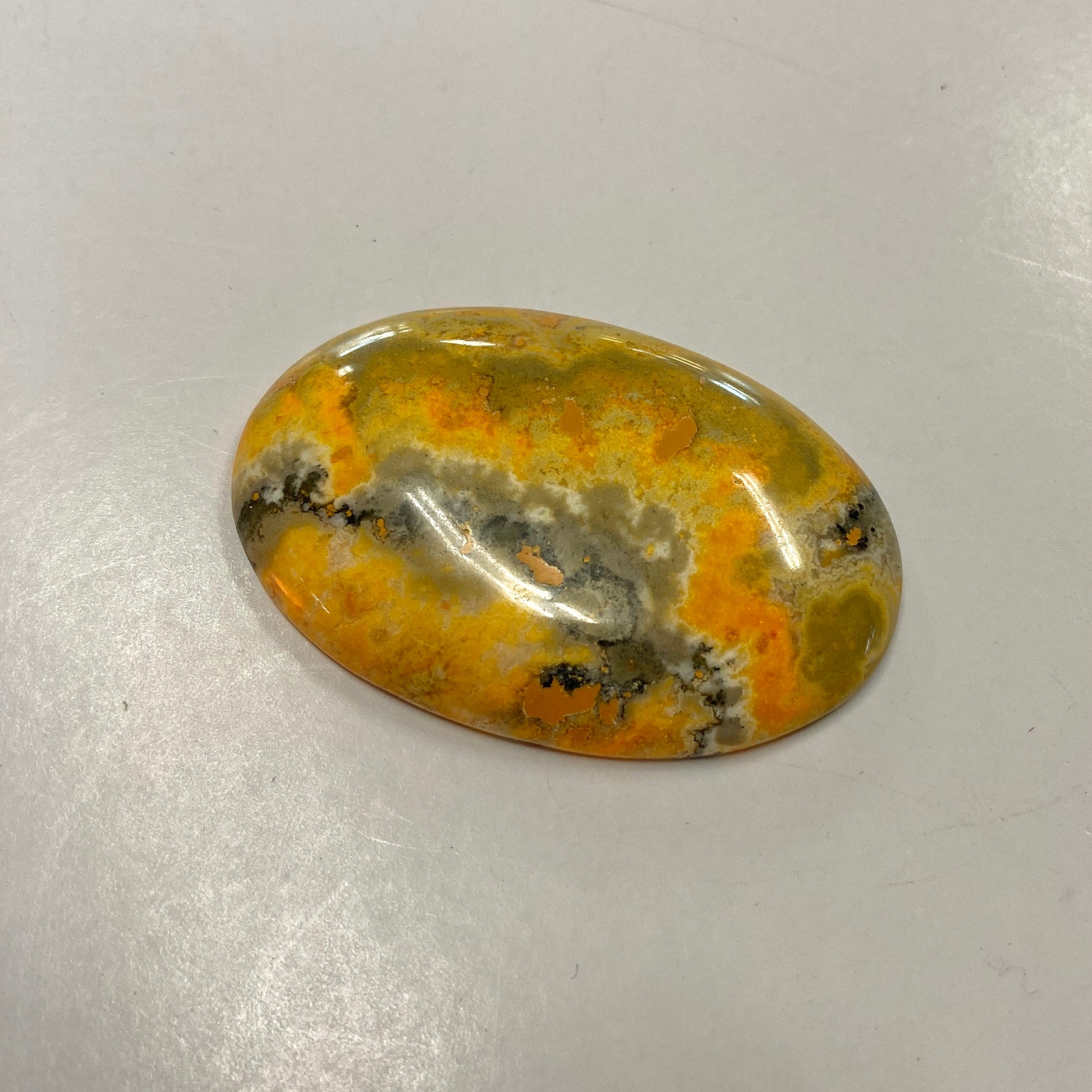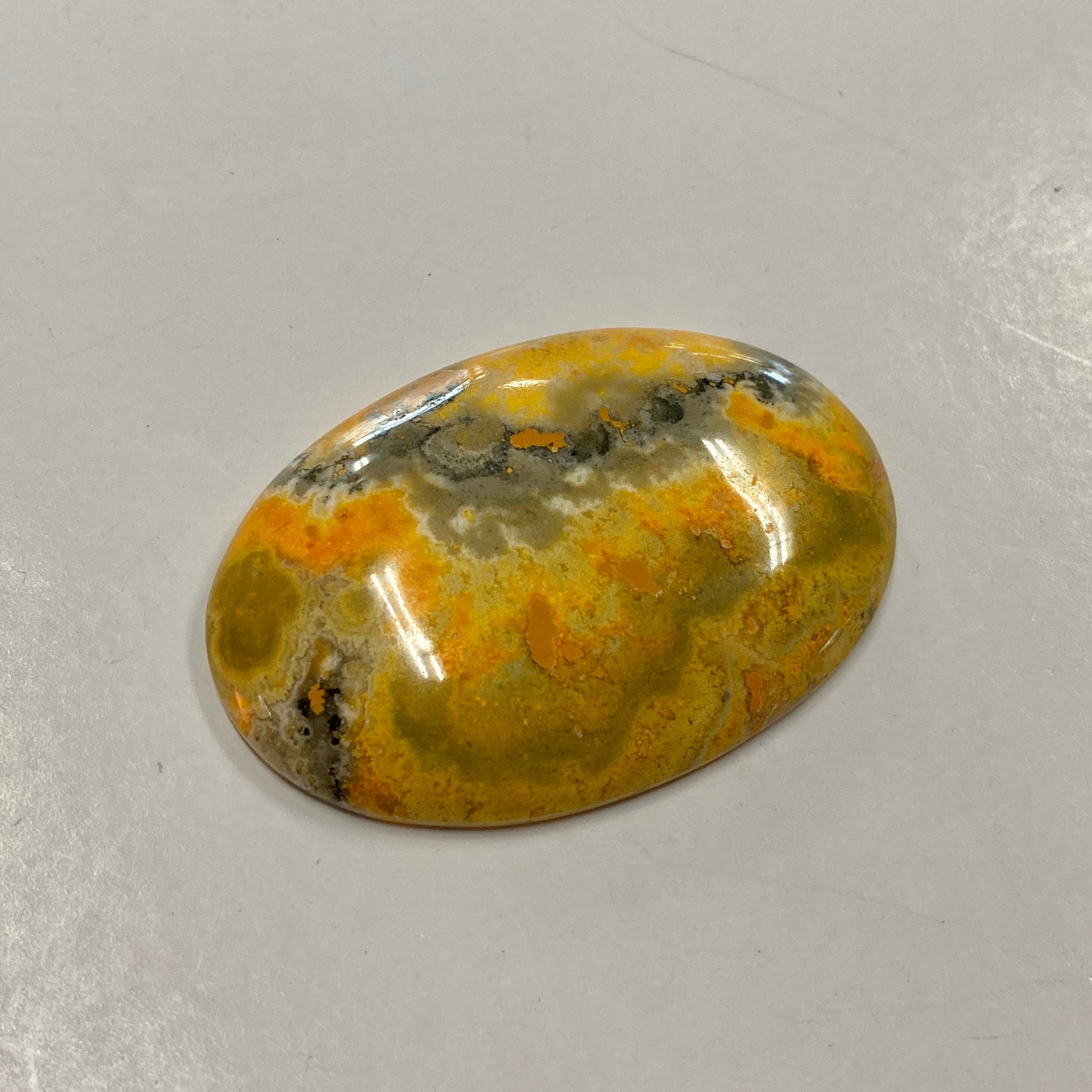 This absolutely stunning oval cabochon is the closest thing you'll get to a bumblebee! The vivid waves of yellows and oranges create an ocean of fire--perfect for use in a necklace.