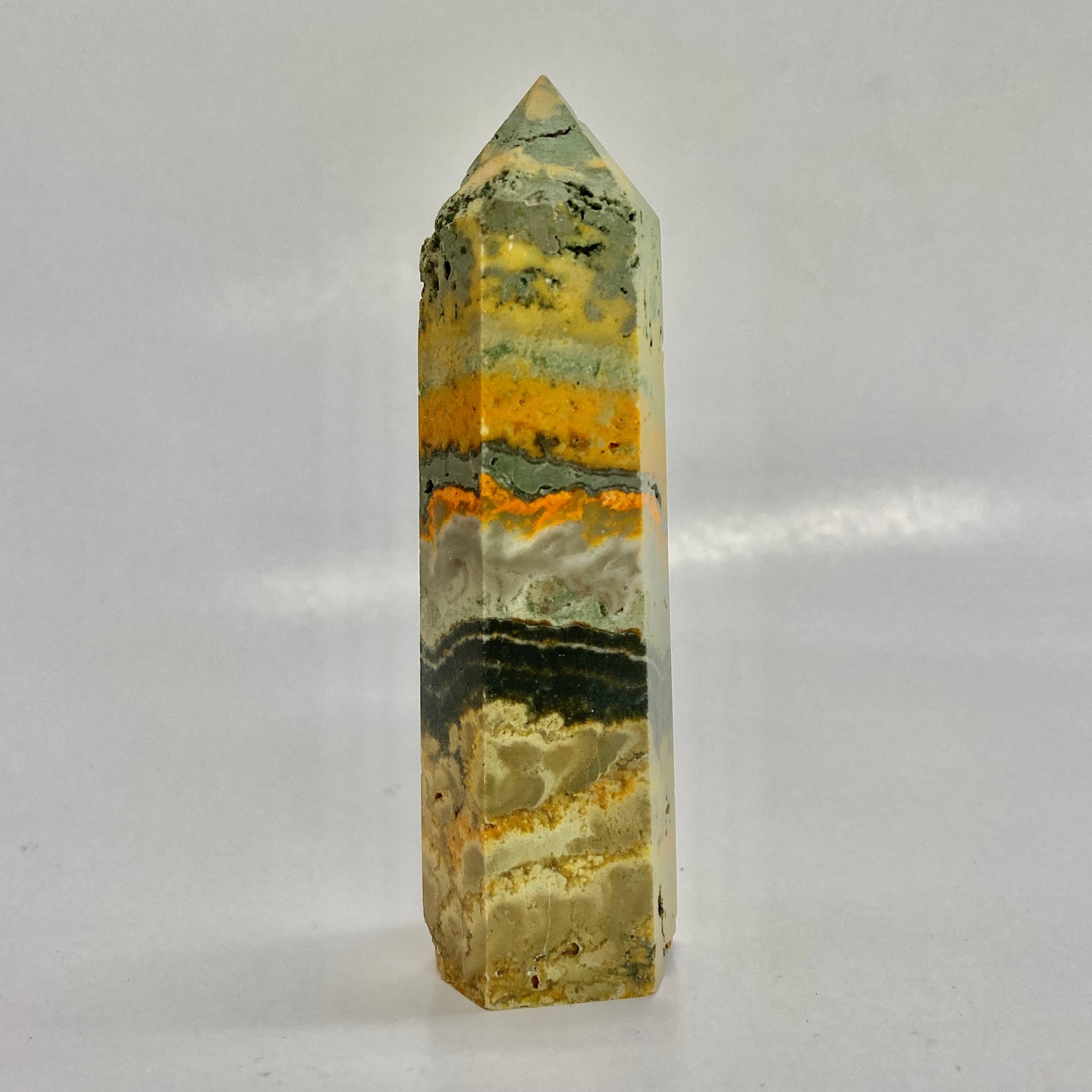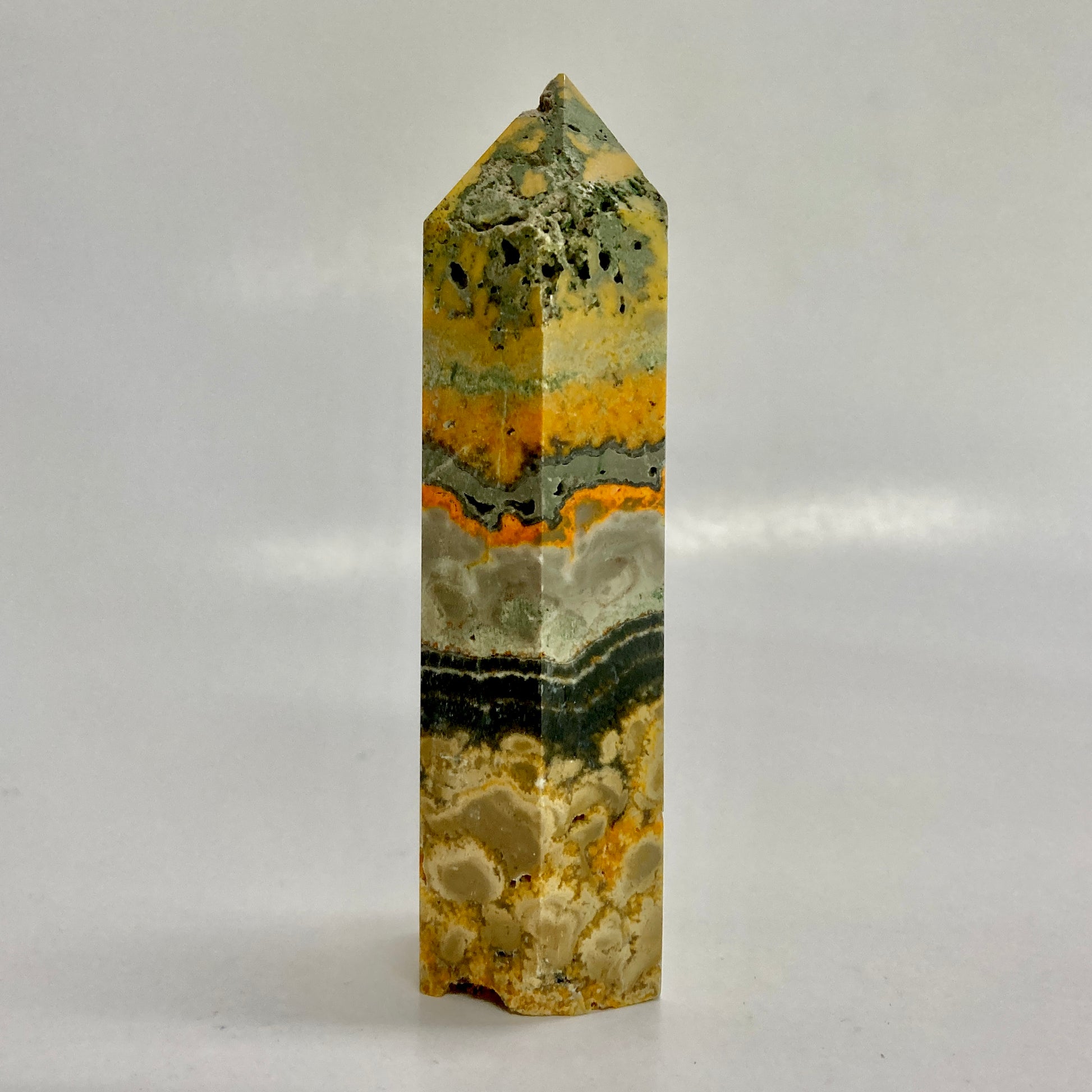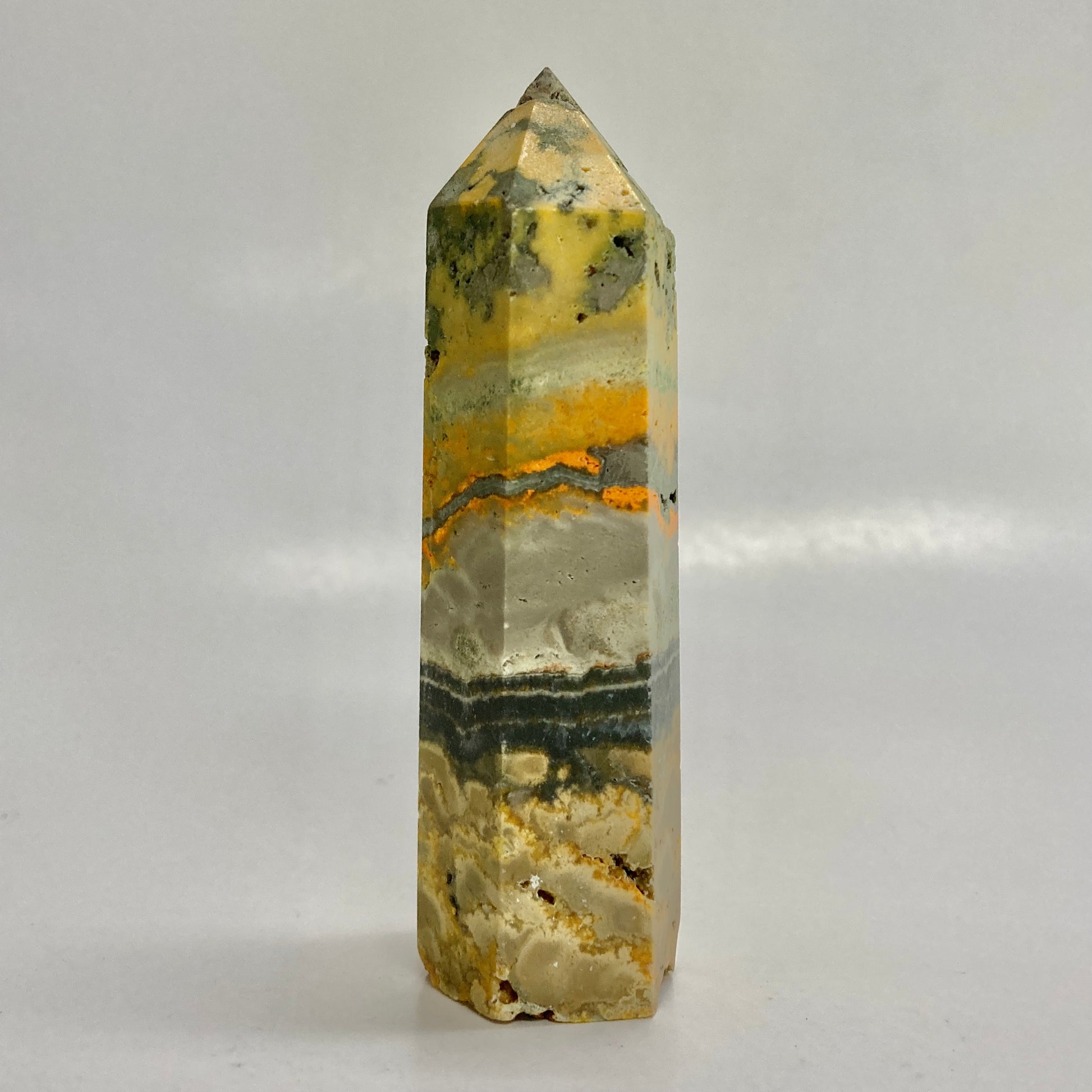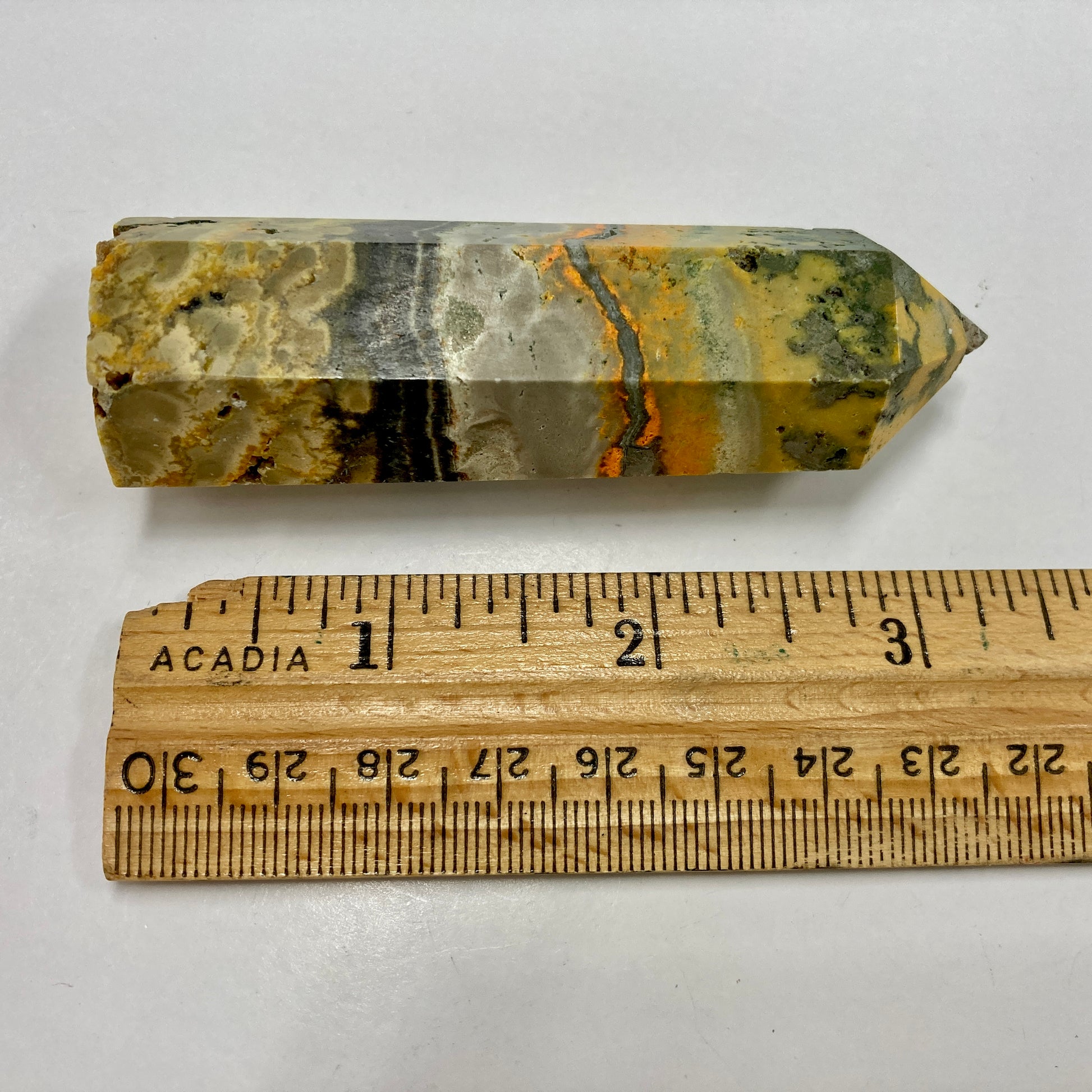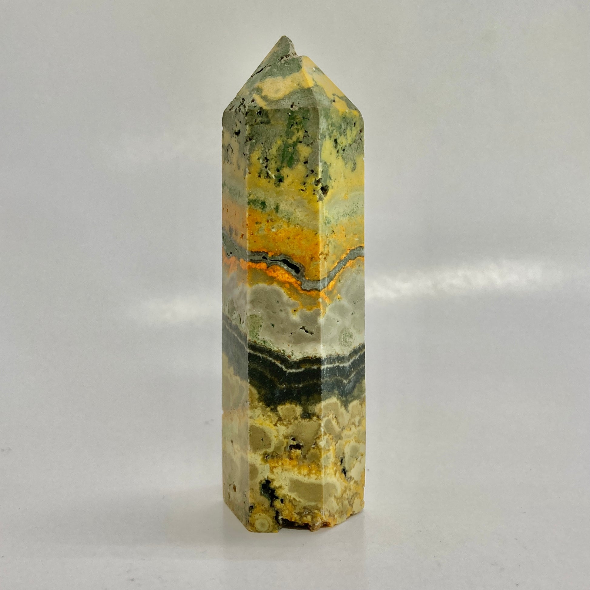 Bumblebee Jasper is known for its bright bands of yellow, orange, black and white. Java, Indonesia is the only known source of this mineral as it forms near active volcanoes.