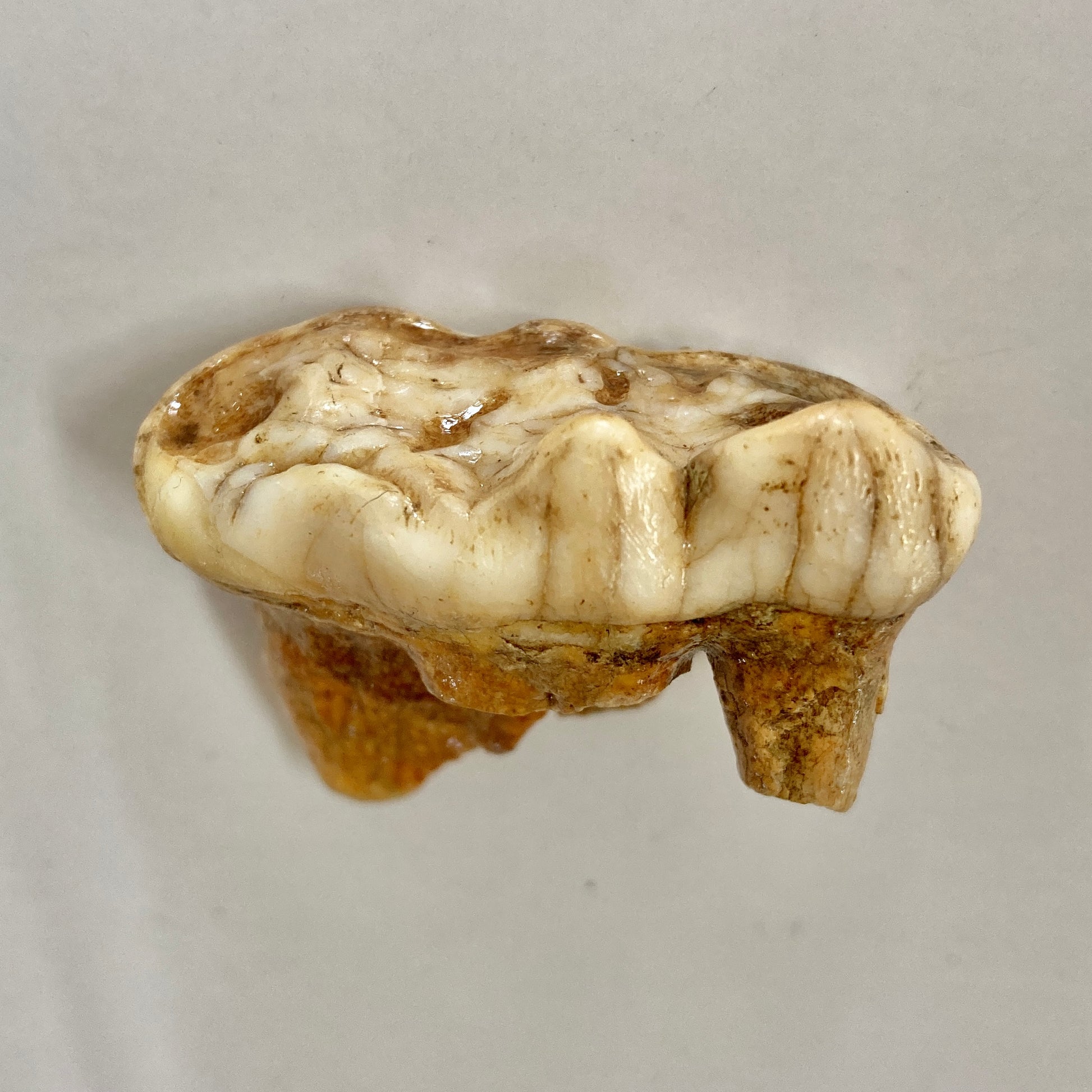 This large molar is from a cave bear that lived in Europe during the Pleistocene. The shiny tooth enamel has been well preserved and it clearly exhibits the tall, dulled cusps. The orange areas in the grooves are remnants of soil.