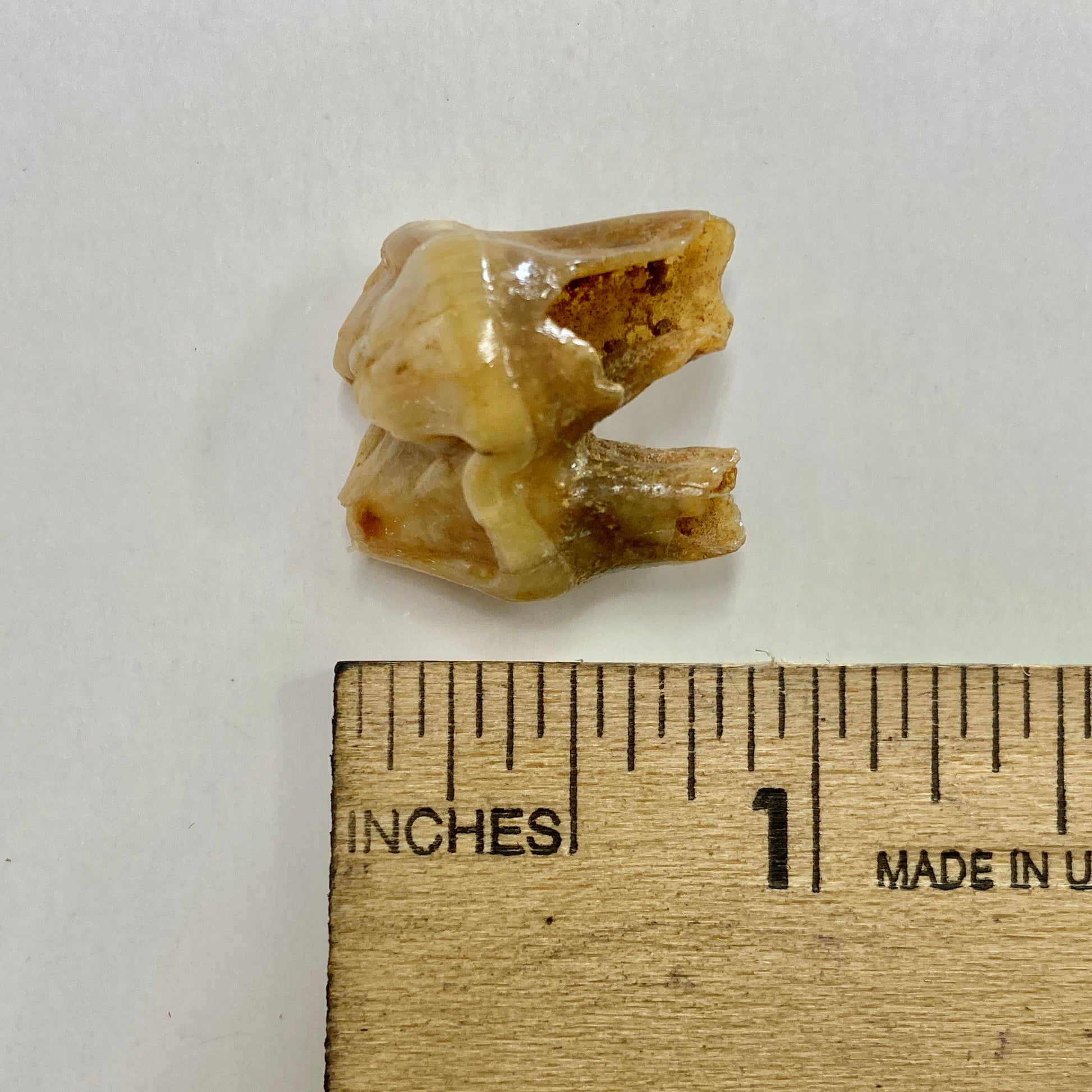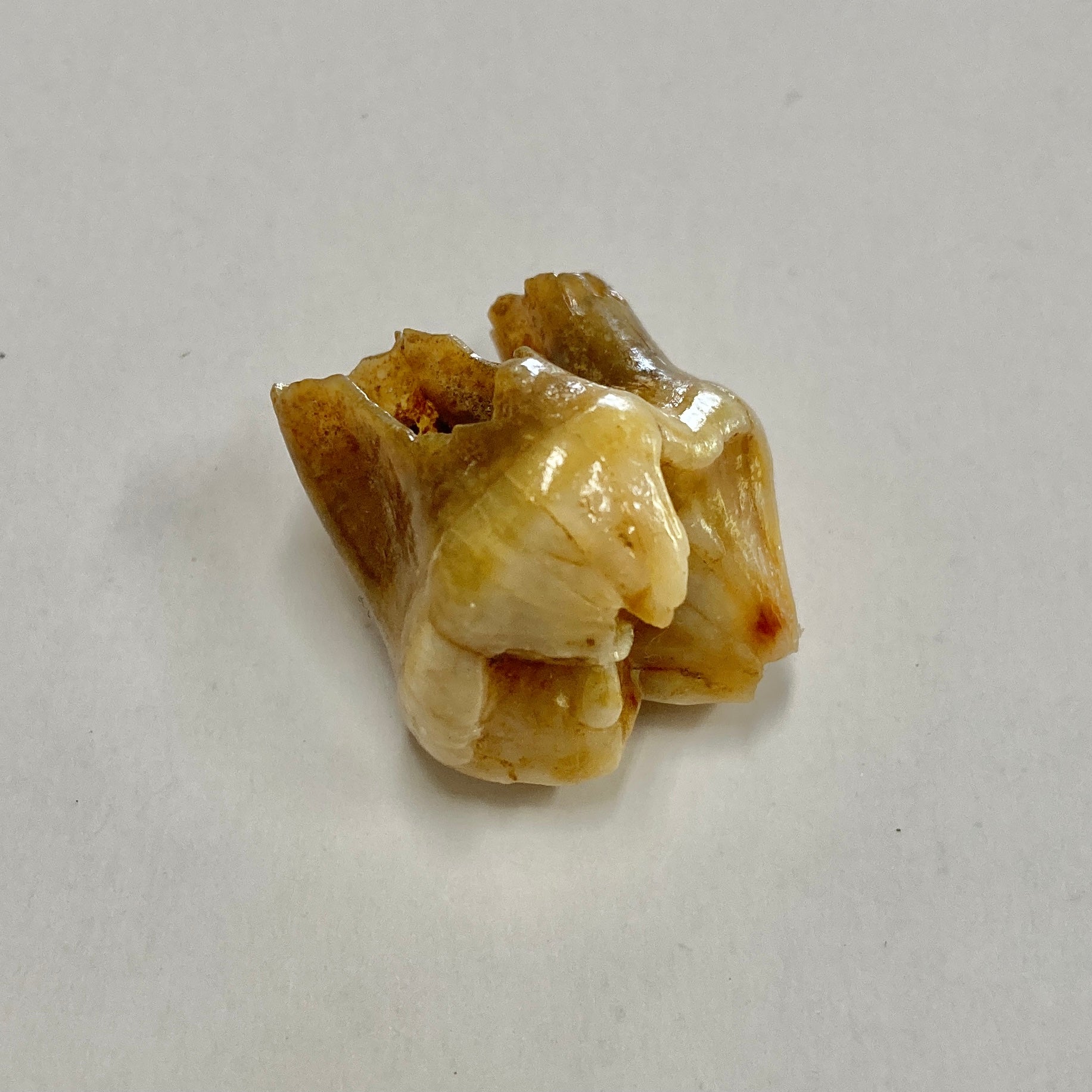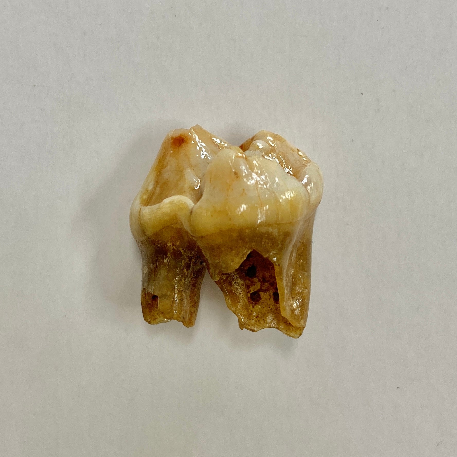 This premolar is from a cave bear that lived in Europe during the Pleistocene. The shiny tooth enamel has been well preserved with remnants of soil in the grooves. The roots are incomplete, but this fossil is a great insight to the diet and habits of the cave bear.