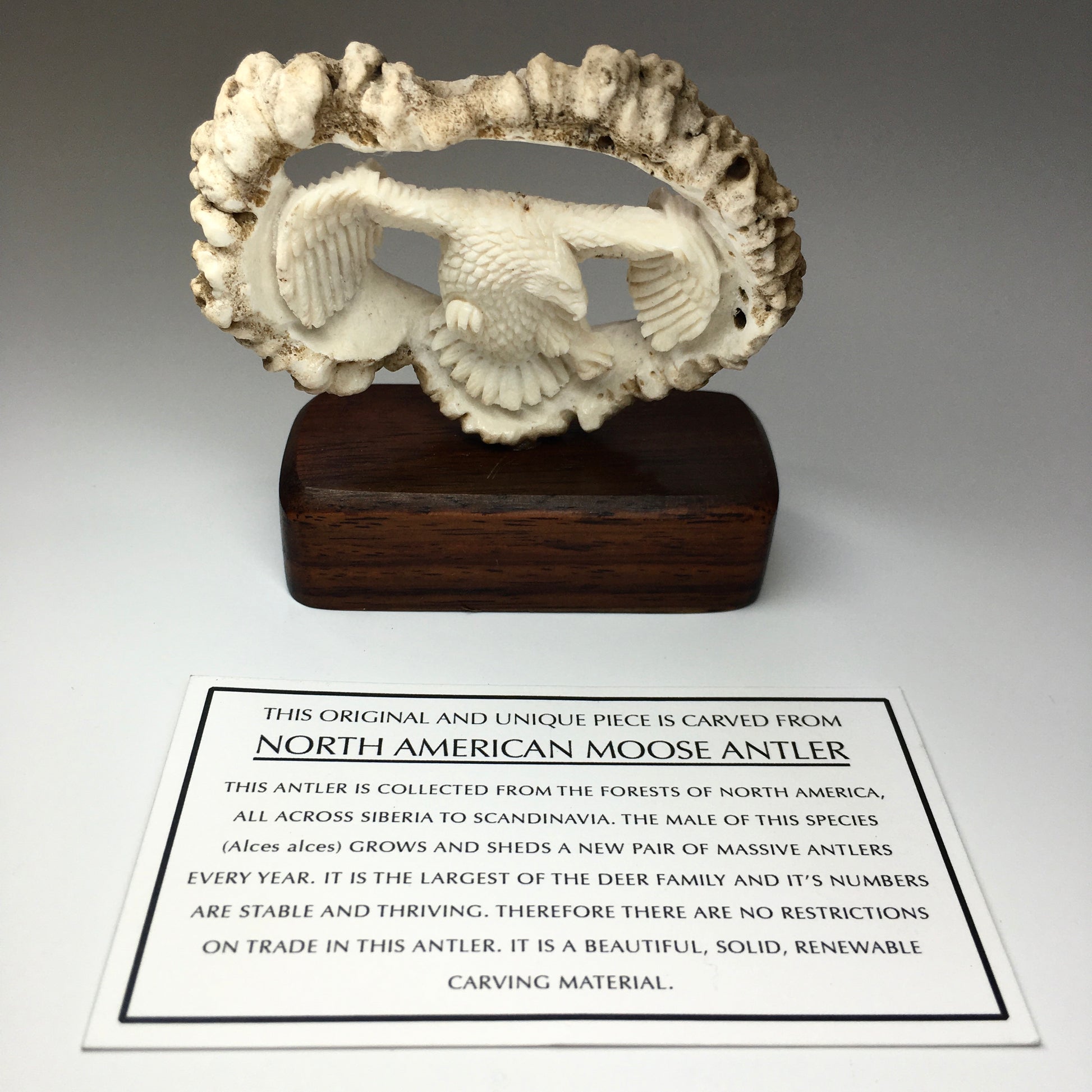 Show off your patriotism and feel a connectivity to the natural world with a majestic carving of America's national bird from North American moose antler! The smooth ivory sheen of the wide-winged eagle enclosed in the rough exterior of the antler is beautiful from all angles!