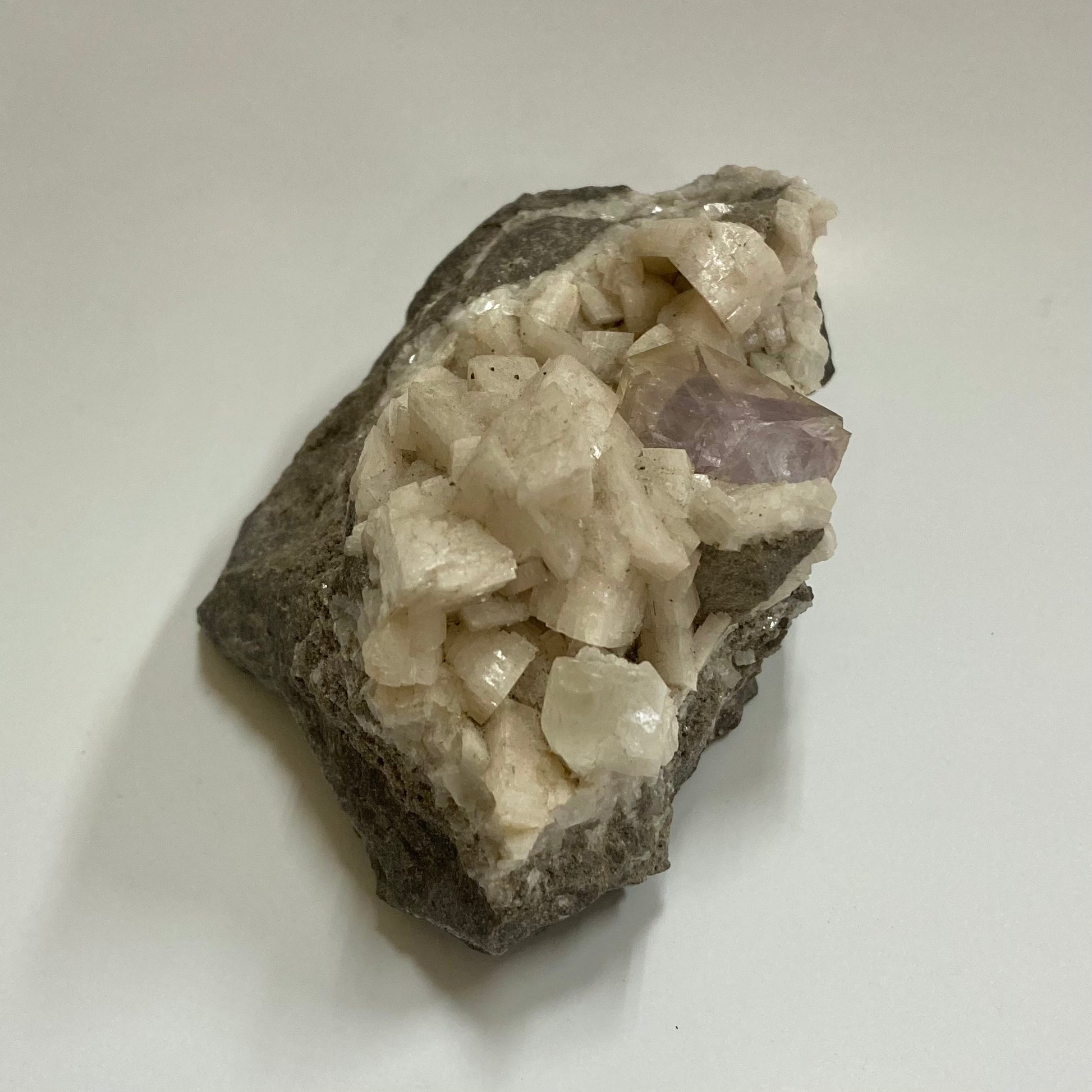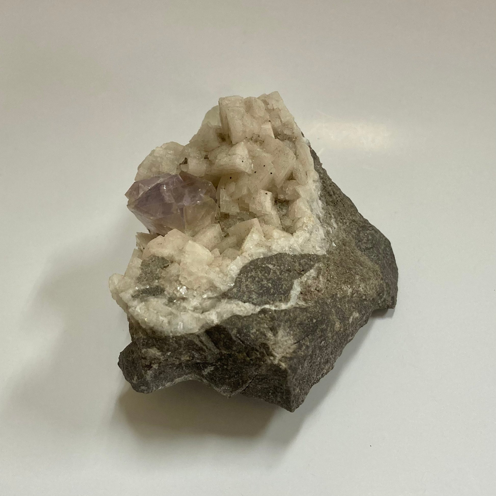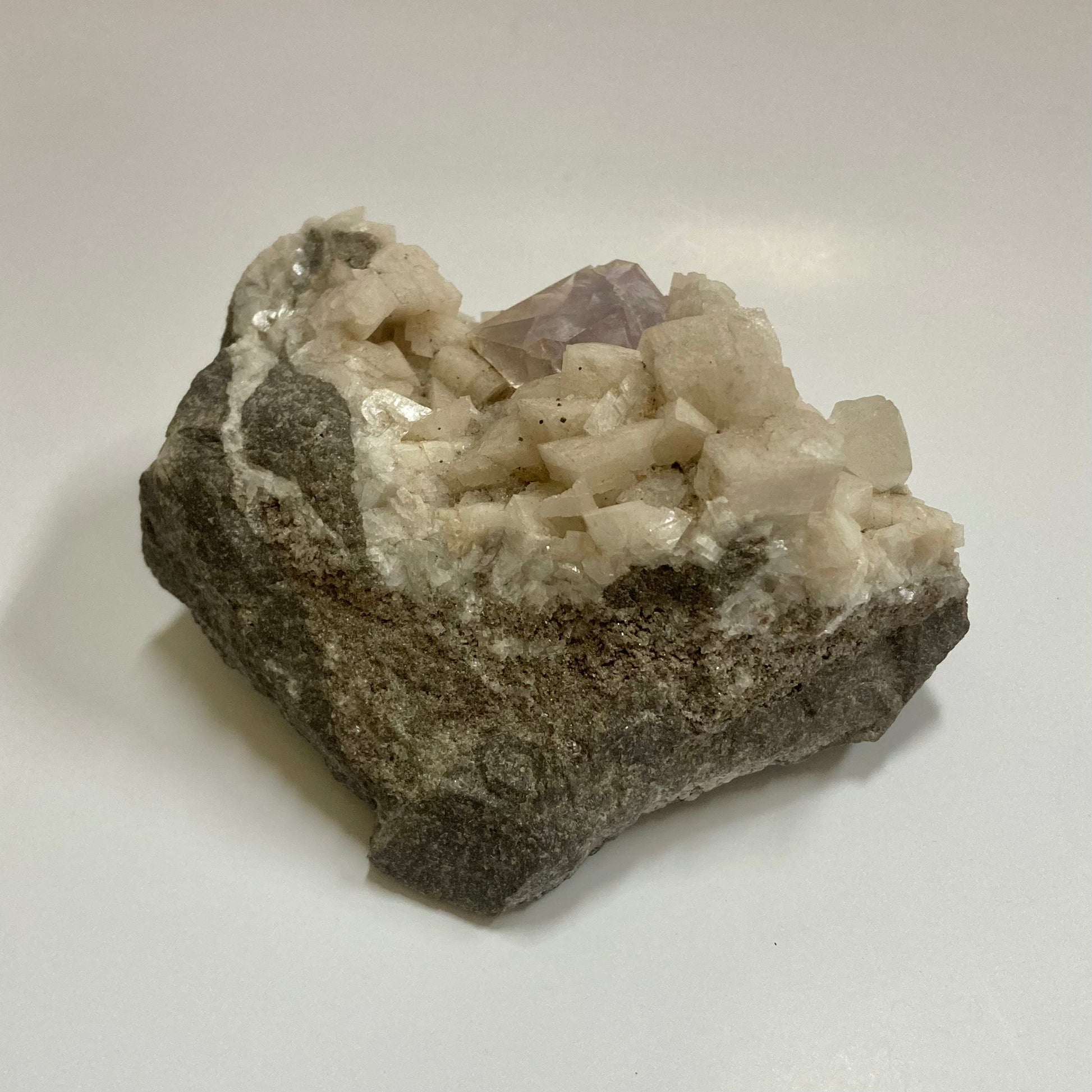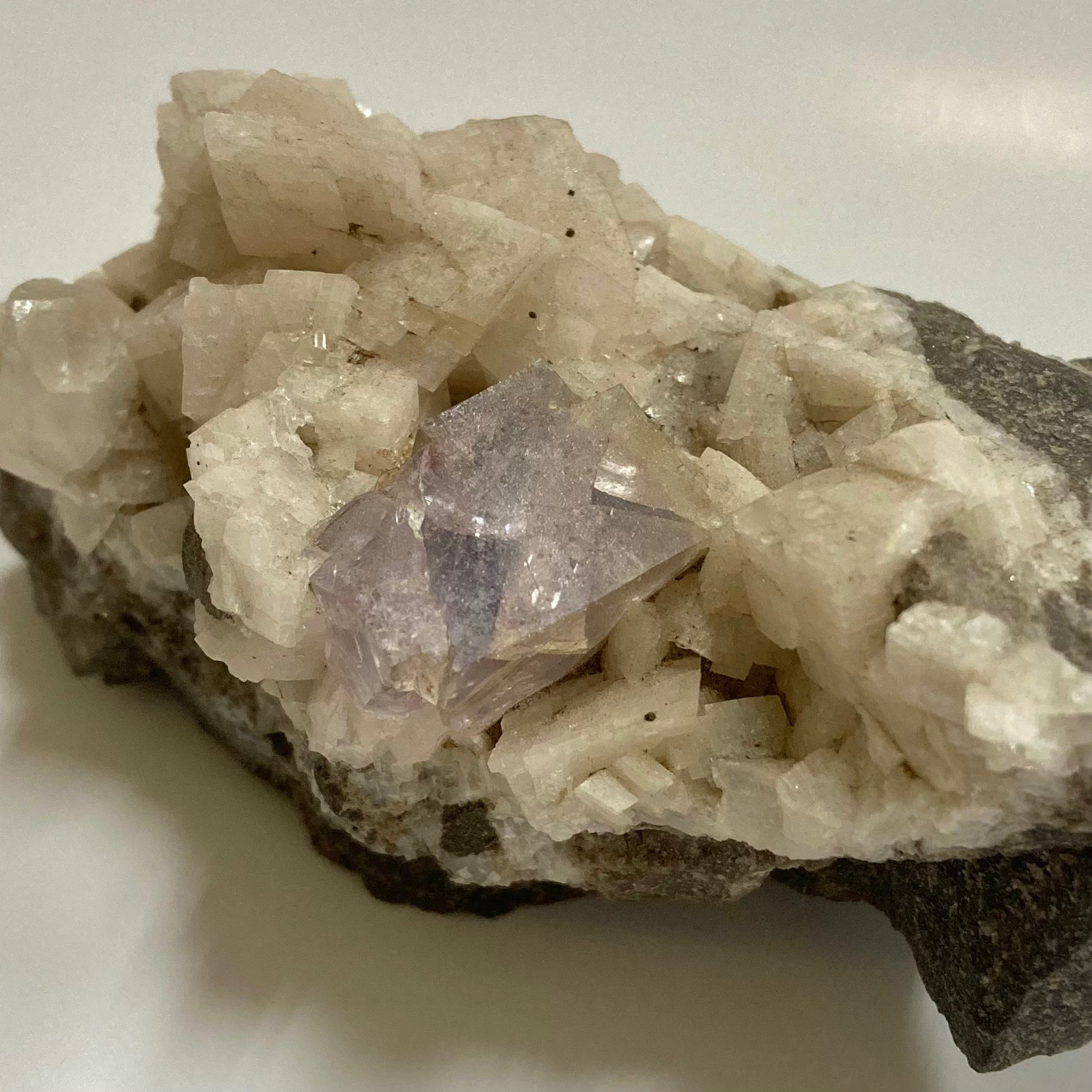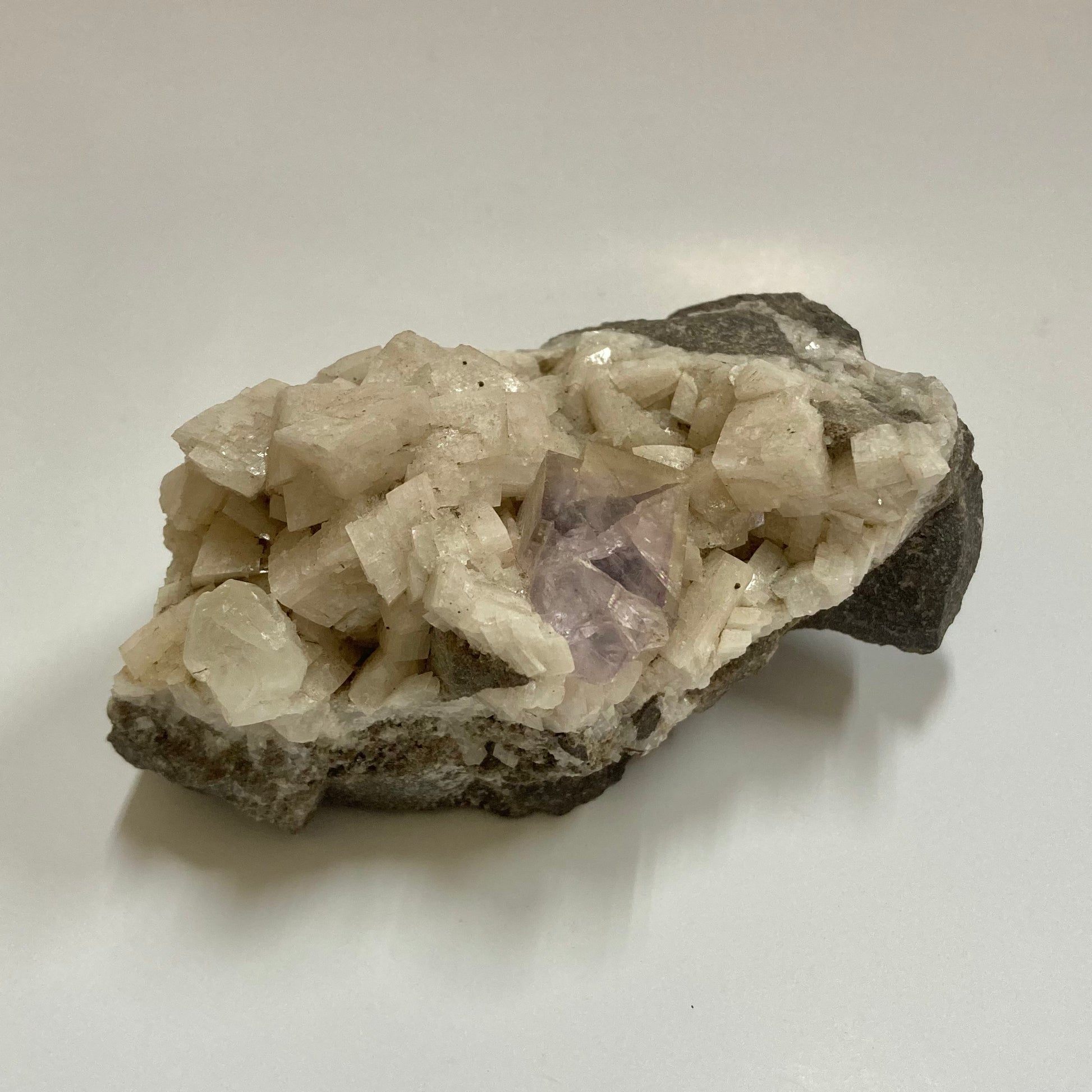 A soft purple fluorite cube is sprouting from within a mixture of calcite and dolomite crystals.