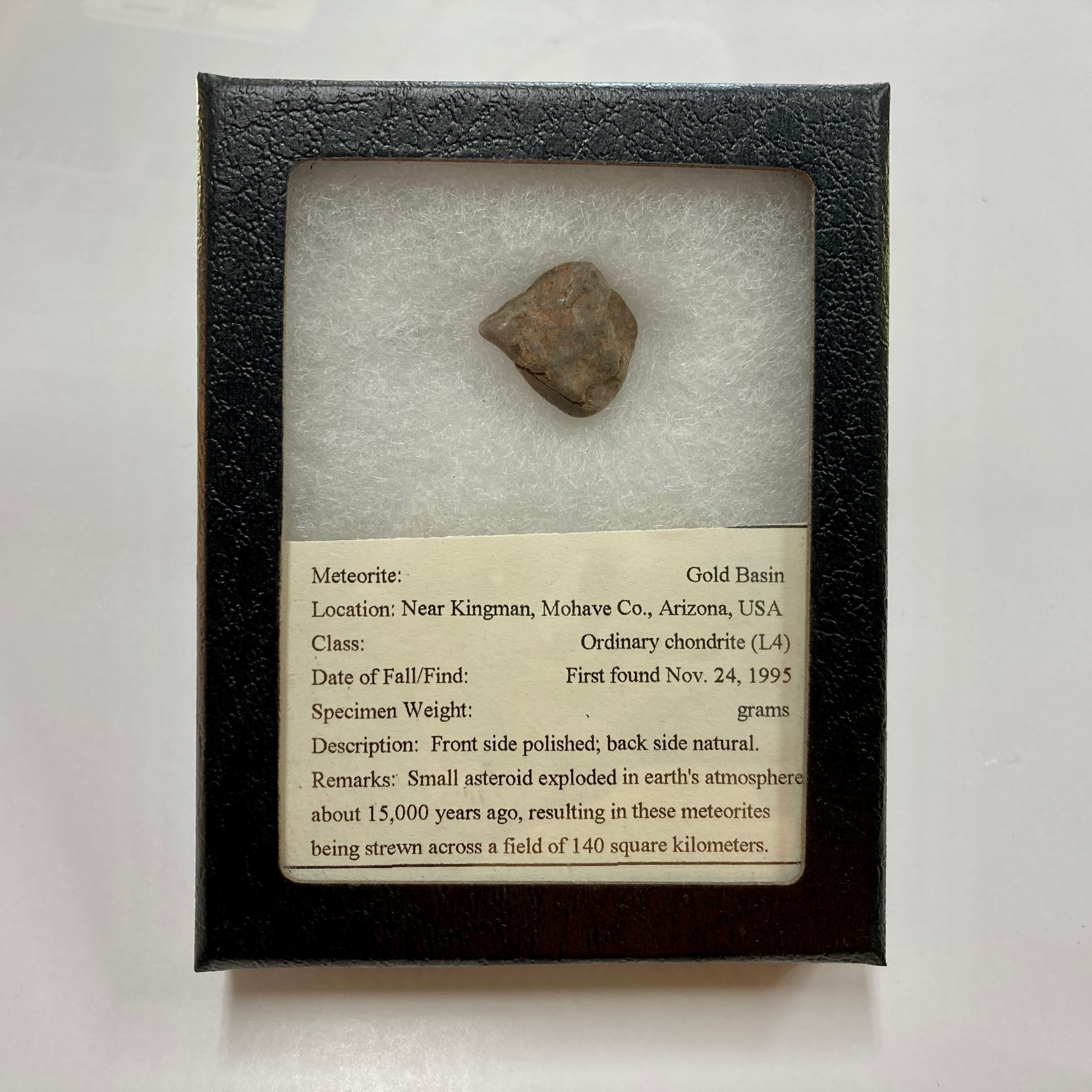 It was first found in November 1995 near Kingman, Arizona by Professor Jim Kriegh when we was prospecting for gold with a metal detector. The Gold Basin Meteorite is classified as an L4 stone olivine hypersthene chondrite, and is one of the oldest known terrestrial chondrite. It fell at a time when the climate was cooler and wetter and many of the fragments show oxidization shortly after impact.