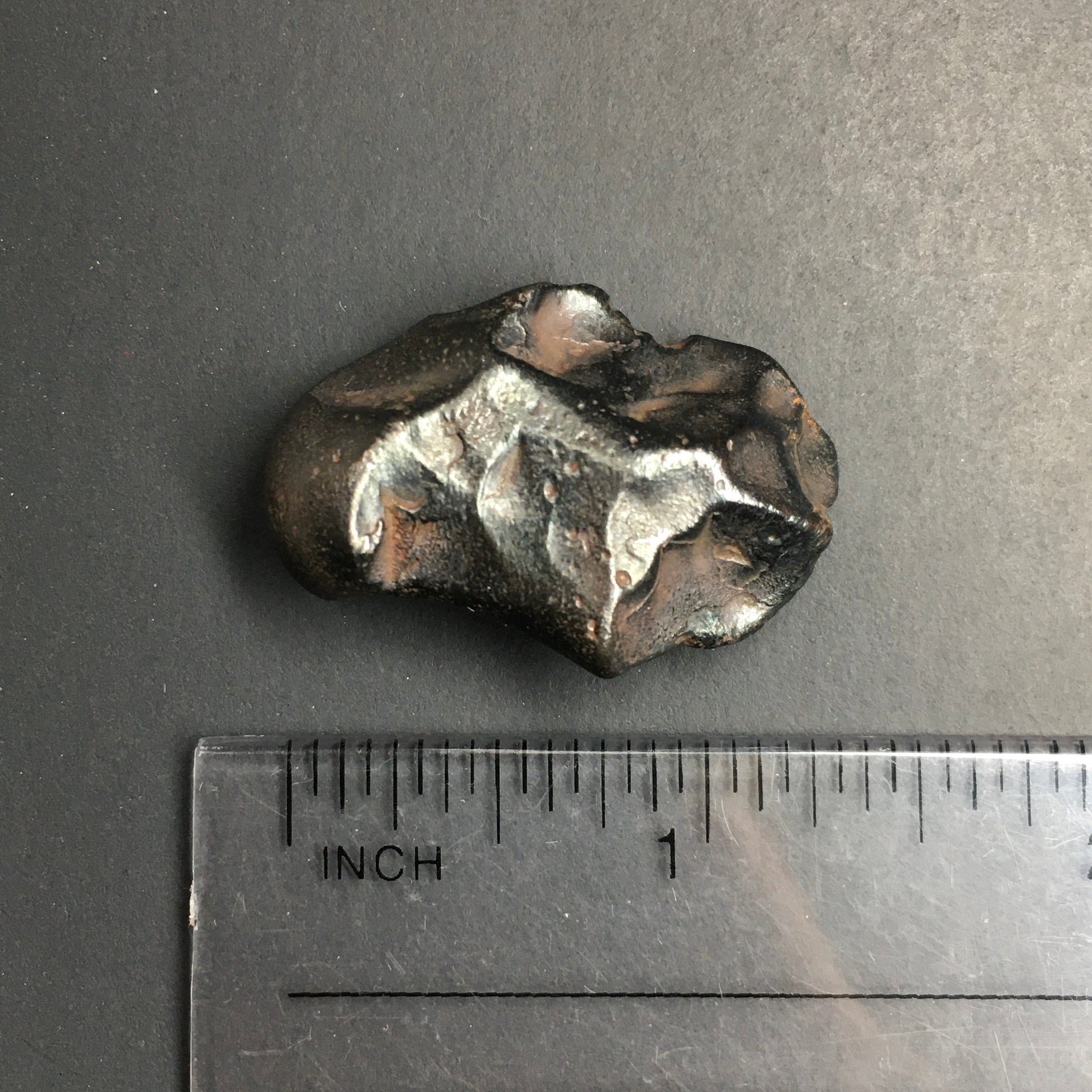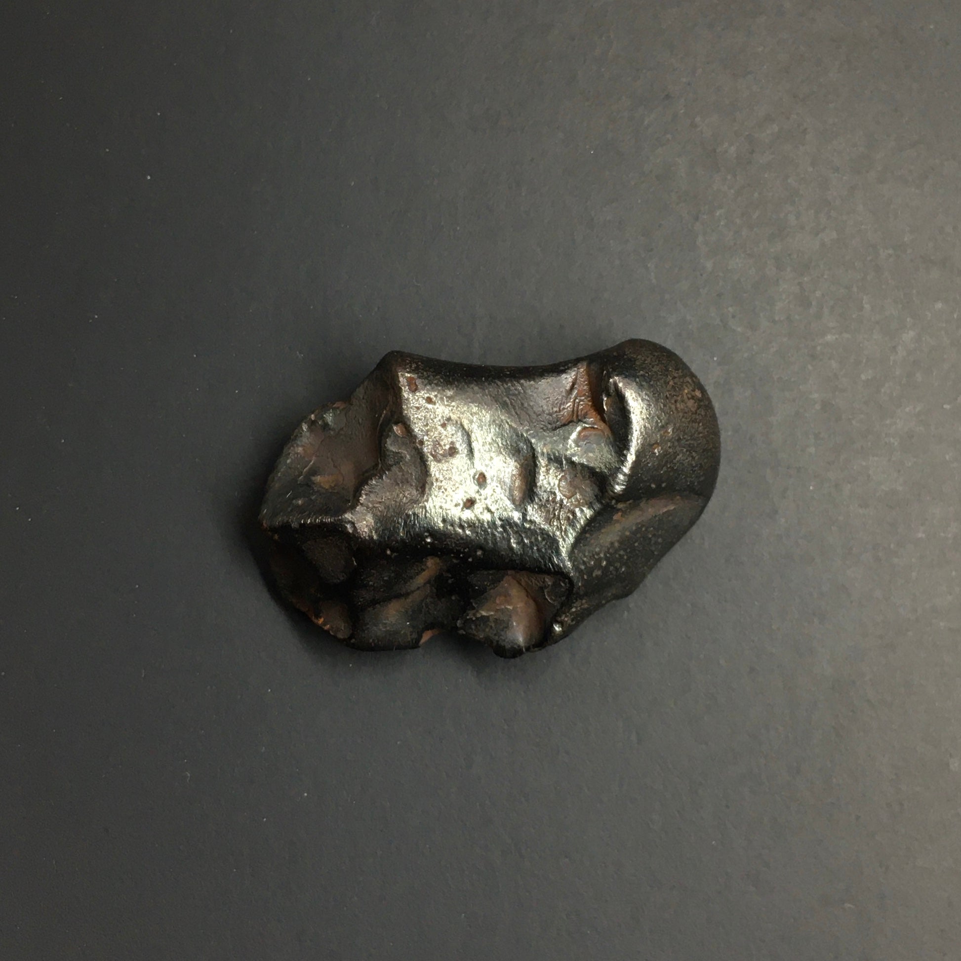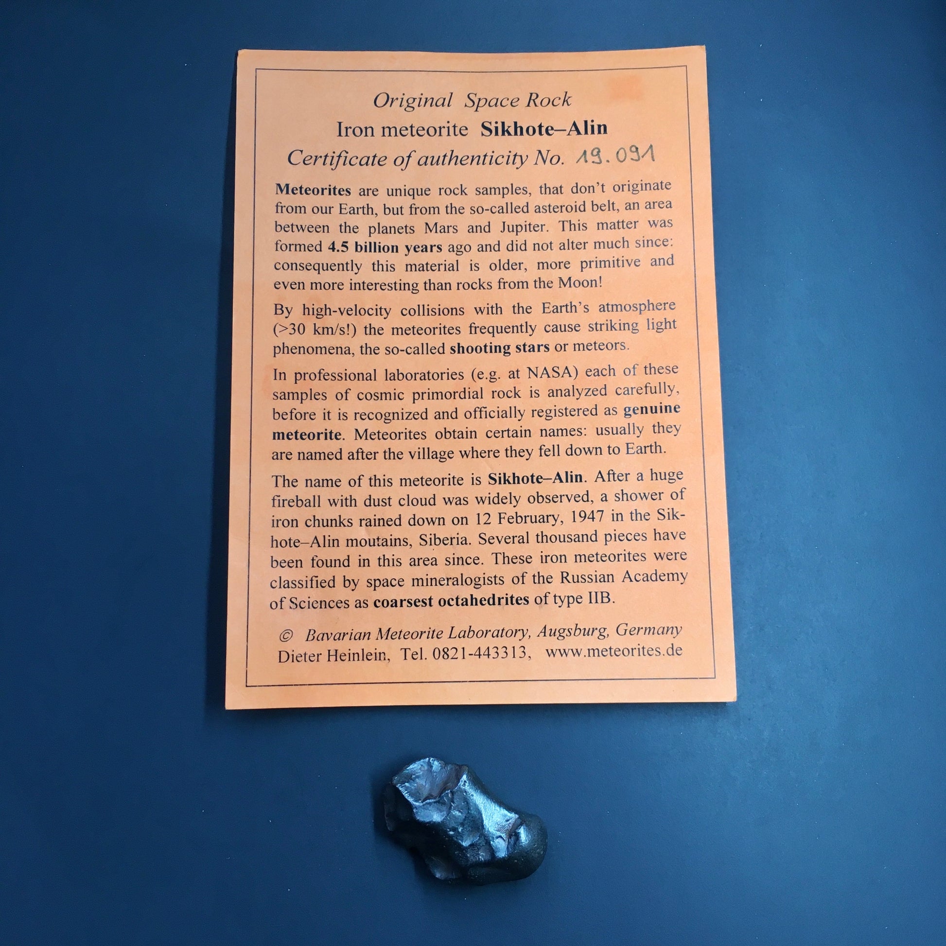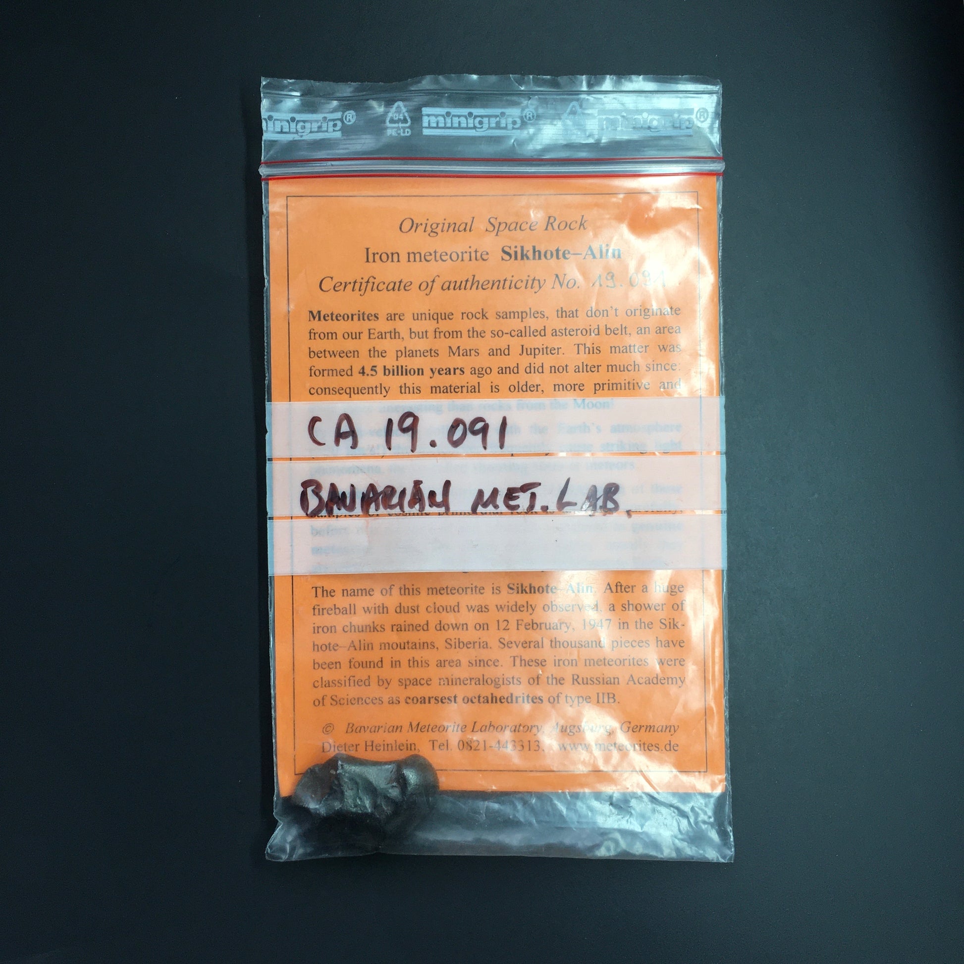 This Sikhote-Alin meteorite fragment was found in the Sikhote-Alin mountains of Siberia. Formed over 4 billion years ago, the largest recorded shower of iron chunks rained down in February of 1947. This meteorite was classified as coarsest octahedrite of type IIB. Its composition consists of elements such as iron, nickel, sulfur, and phosphorus.