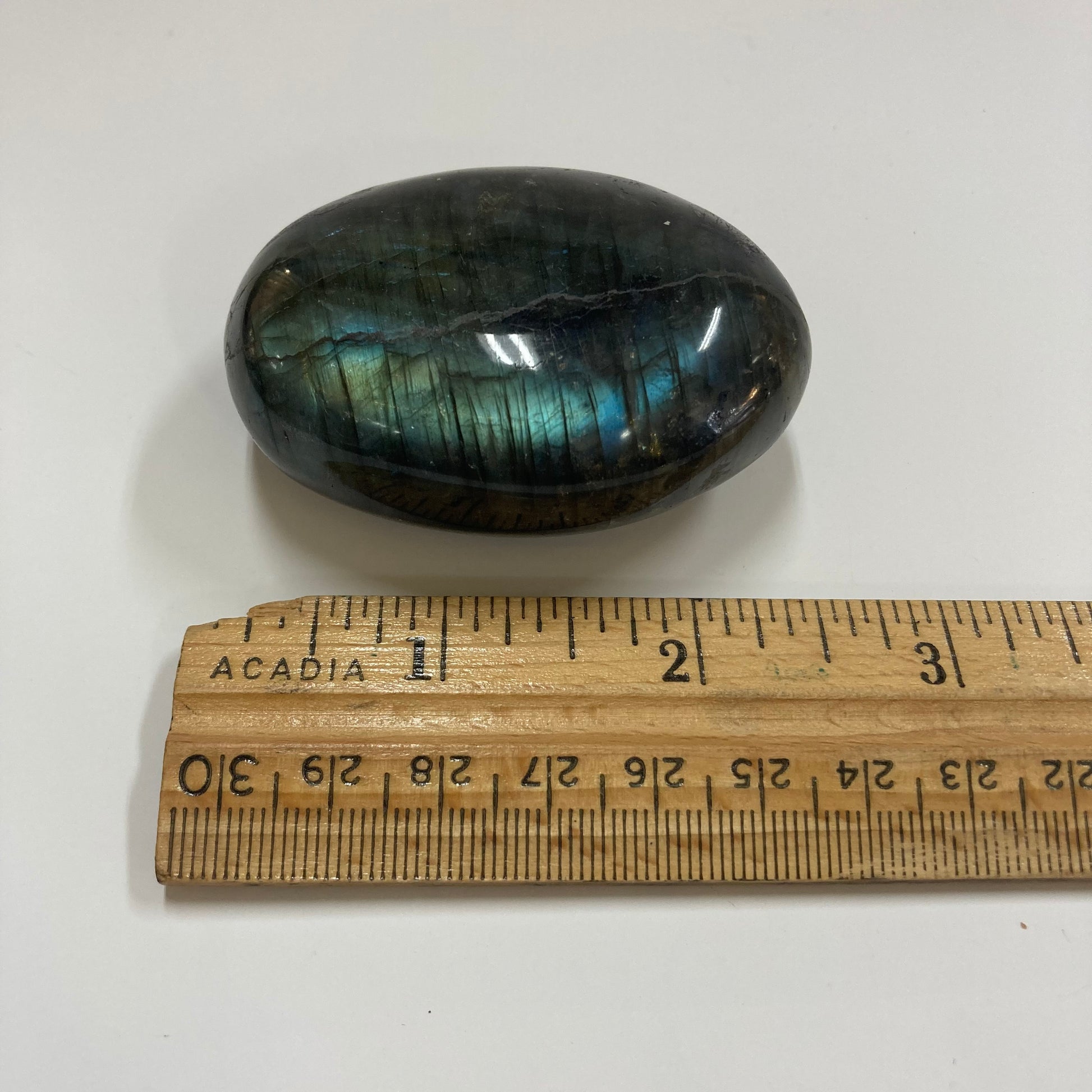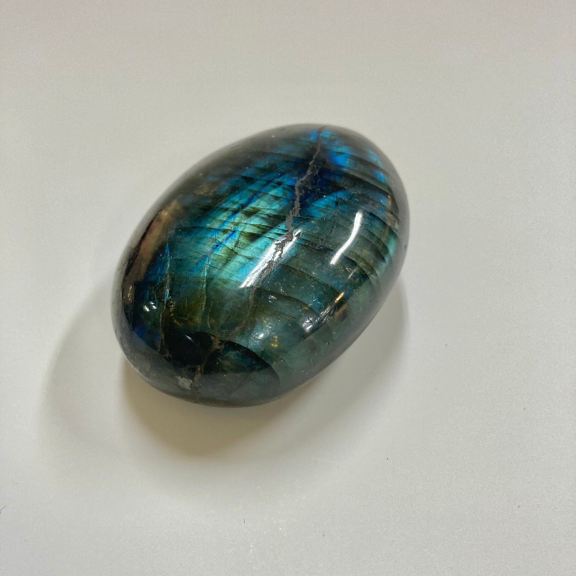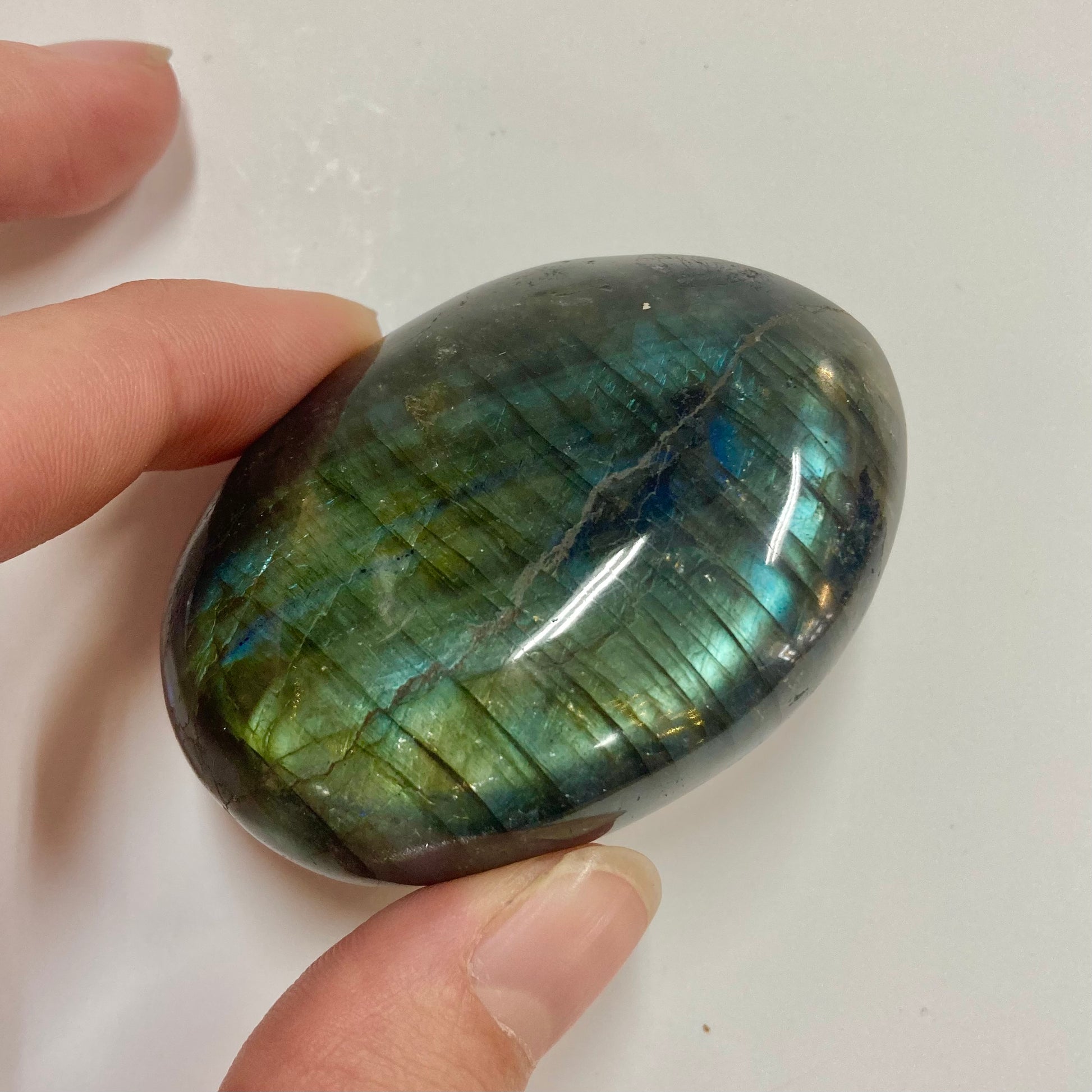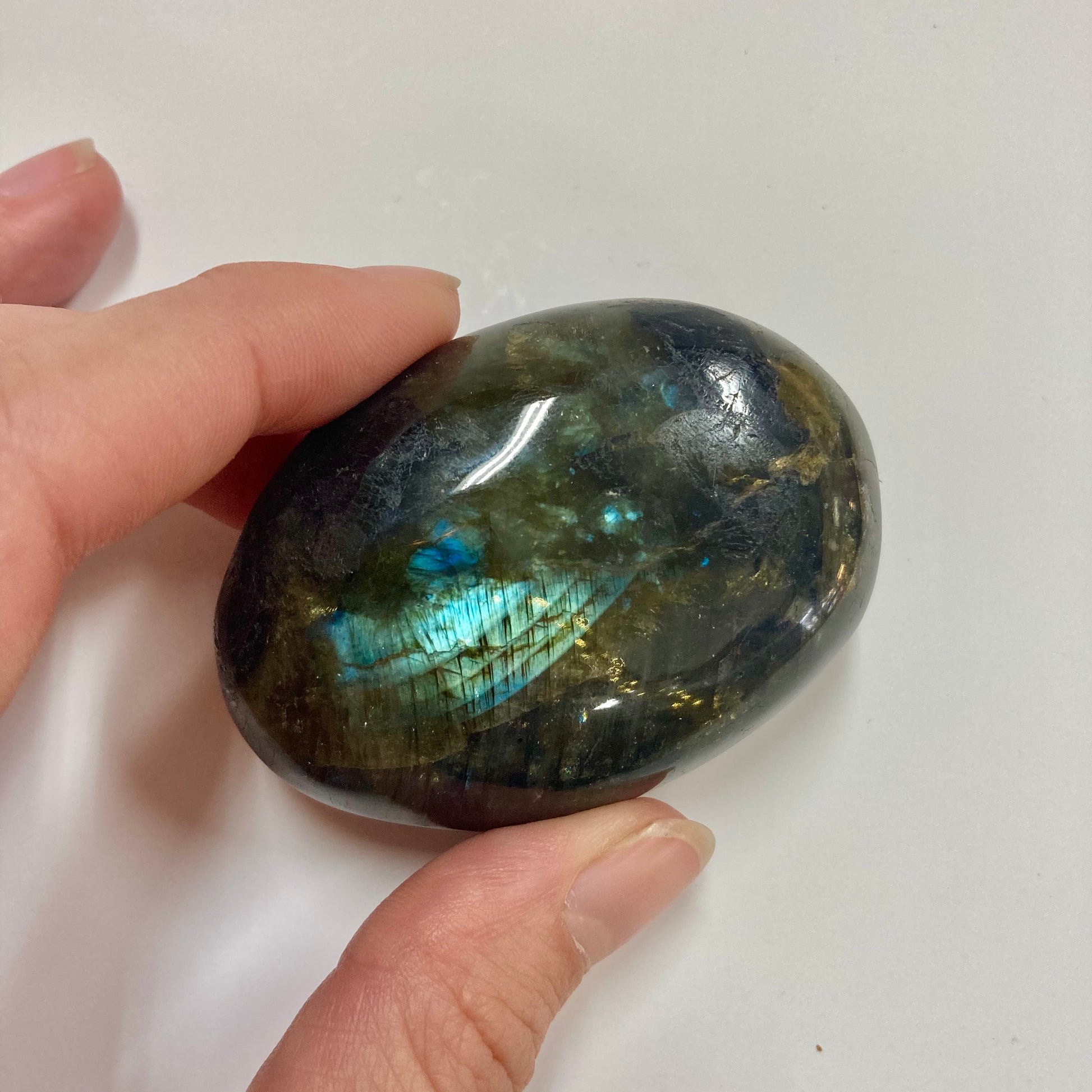 Watch as this palm stone labradorite mystically transforms from a dull greenish-brown to glowing blues, yellows and greens.