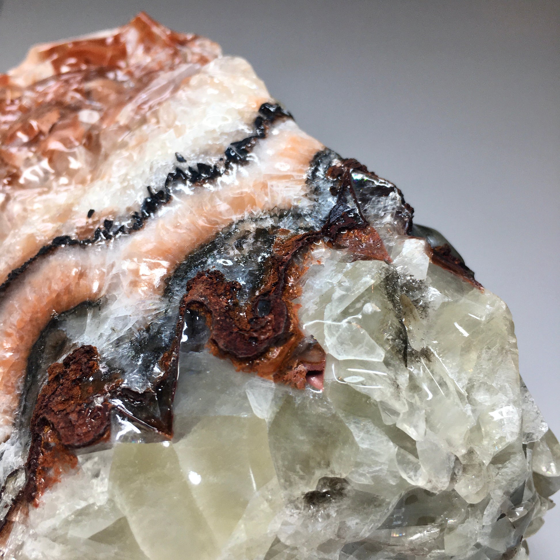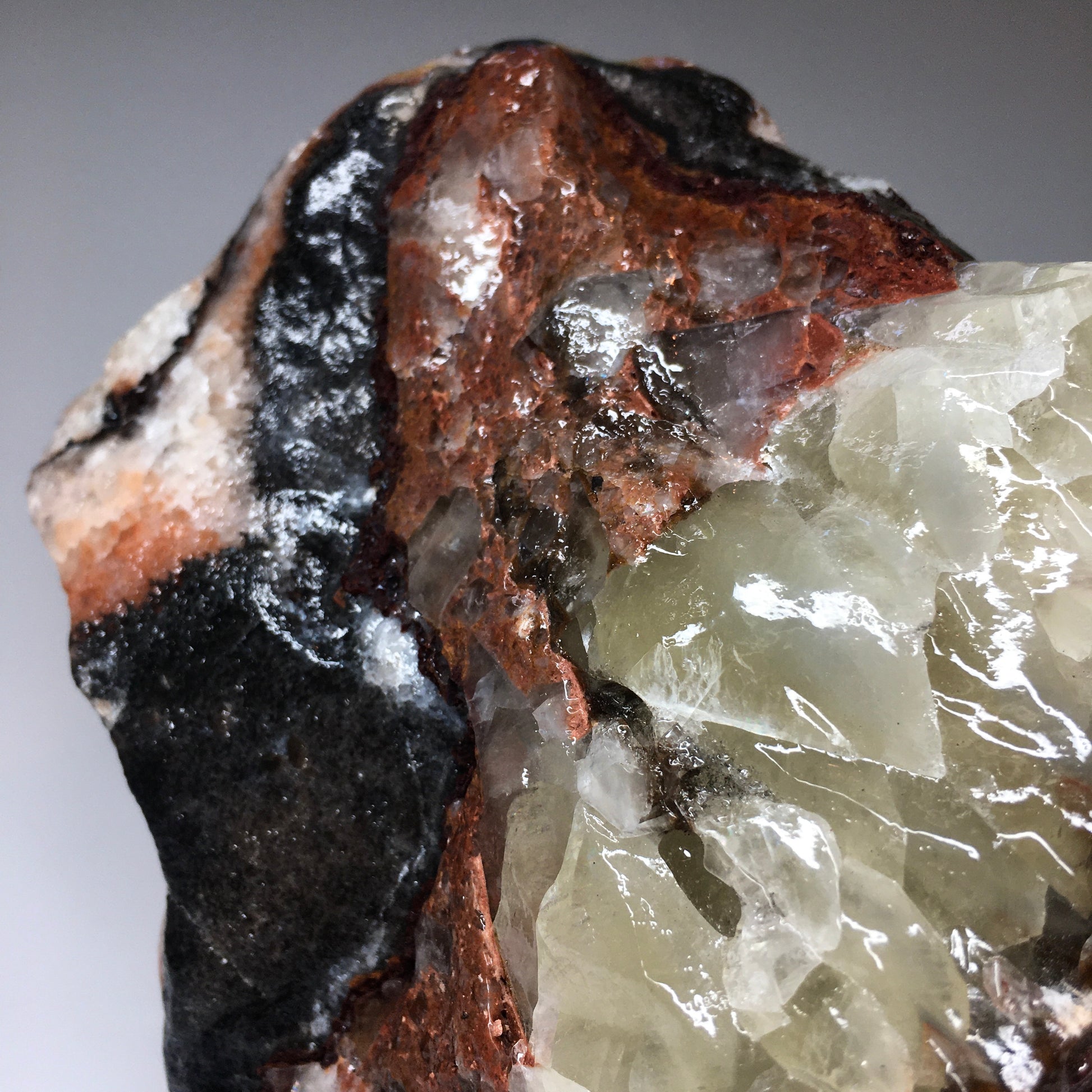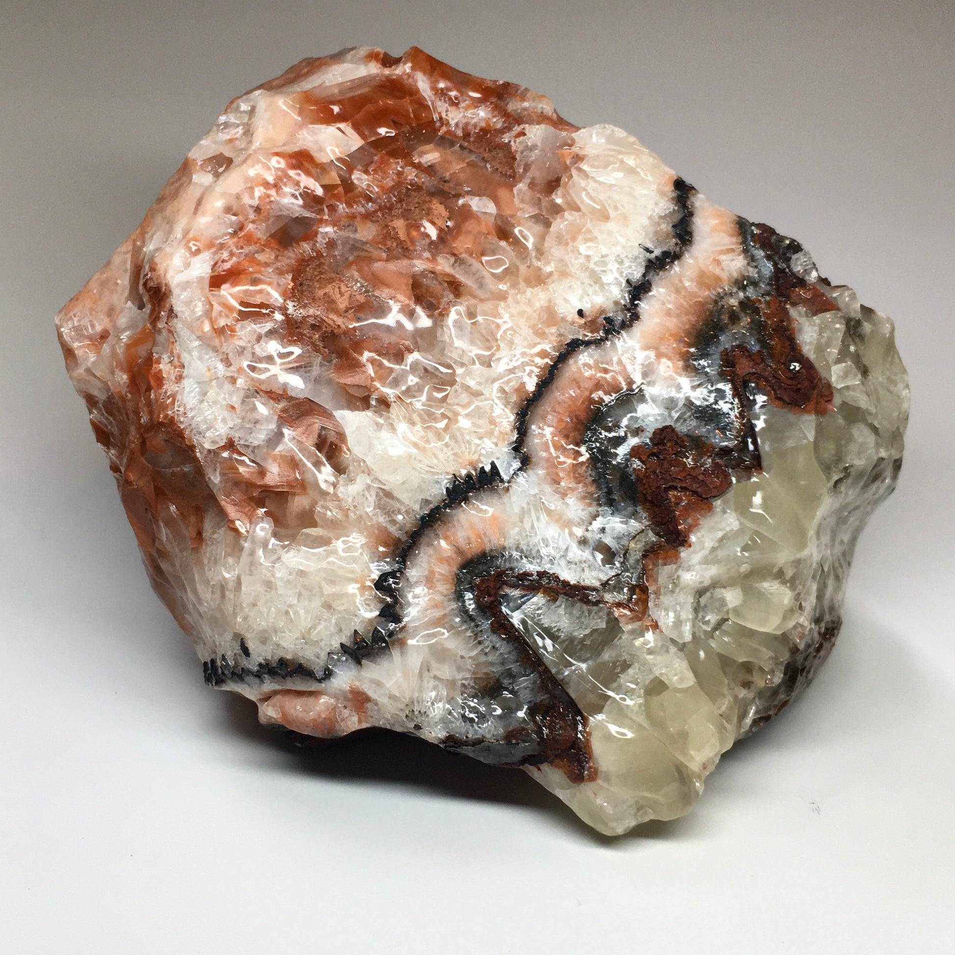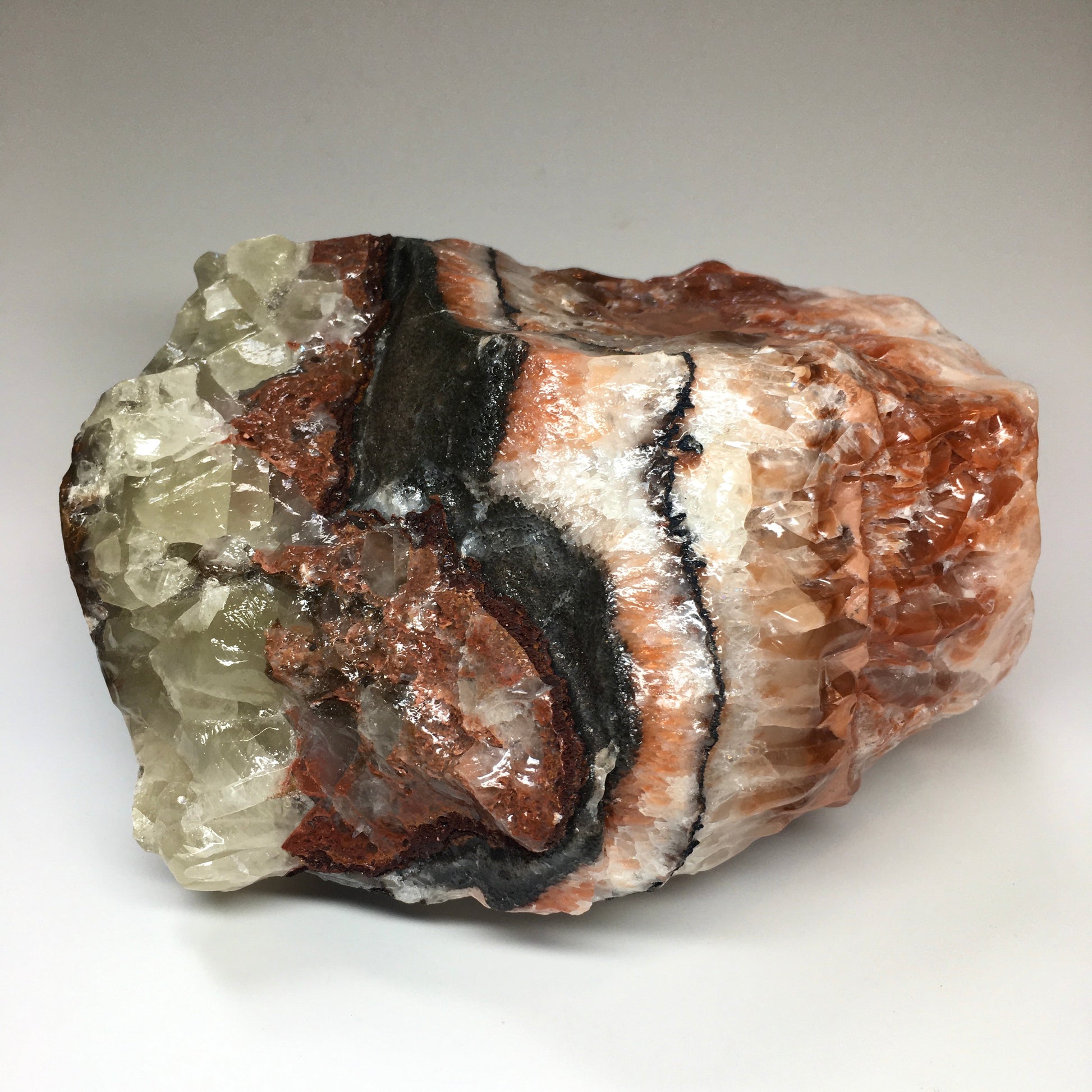 Calcite derives its name from the Greek word "chalix" meaning "lime" because it is often found in limestone and marble. It is one of the most common minerals on earth (the other being quartz) that can occur in sedimentary, metamorphic, and igneous rocks and can be found in many different geological environments. This ubiquitous mineral comes in a wide variety of colors ranging from white or colorless to red, orange, yellow, green, blue, pink, brown, black, and gray. There are over 300 identified forms of crystals that then can also combine to create hundreds more crystal variations. Calcite's cleavage is perfect in three directions, creating rhombohedrons.