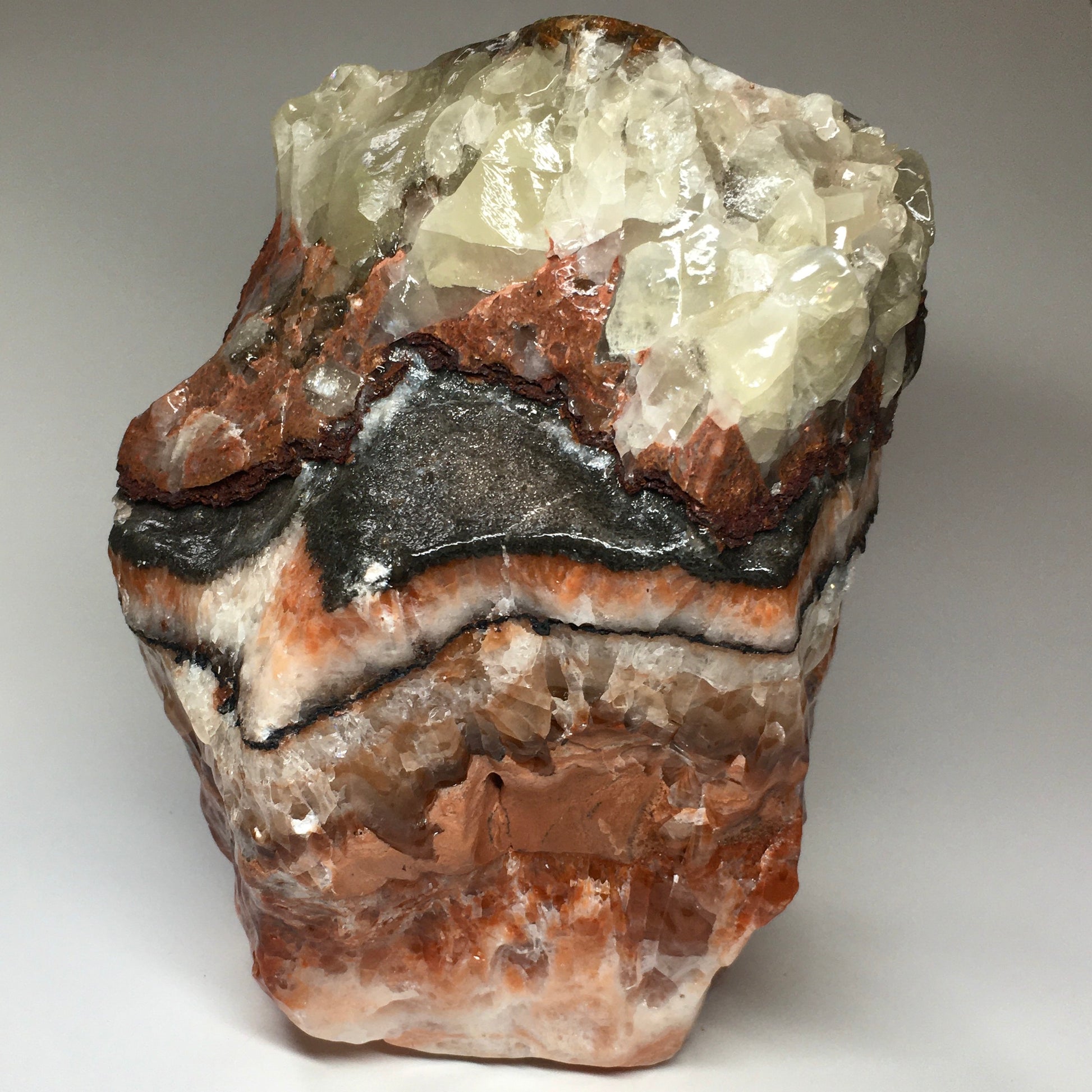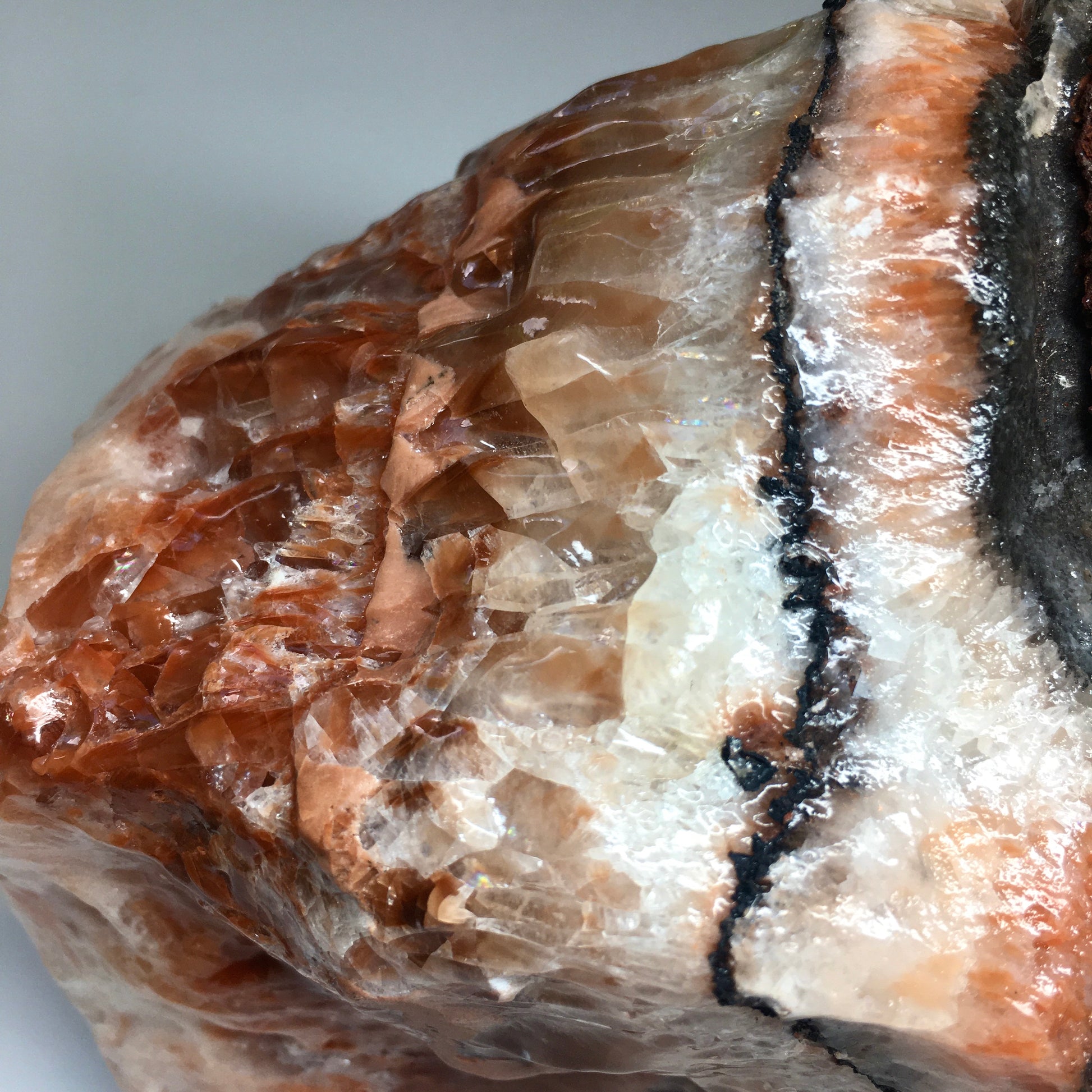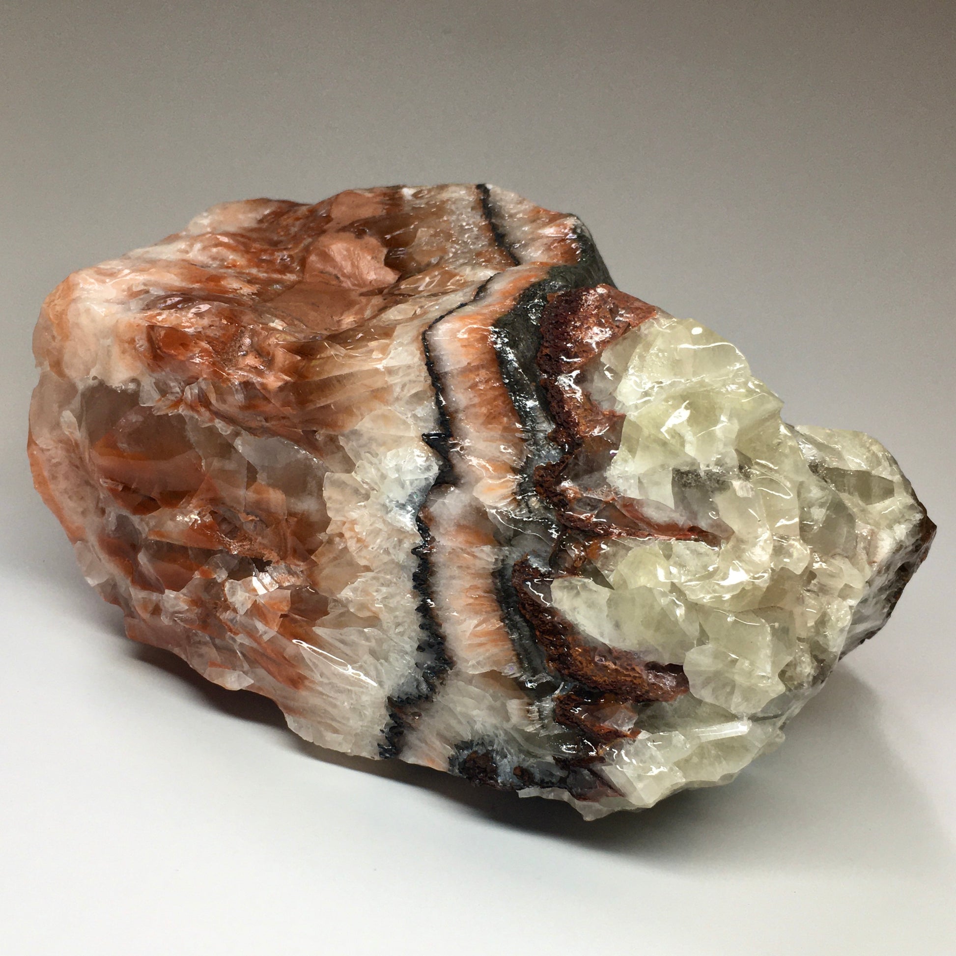 When you've got a mineral with this many natural patterns in it, you know it's special! This red calcite chunk has some bands that are left with their rough surface, contrasting beautifully both visually and texturally with the smooth polish of the rest of the stone.