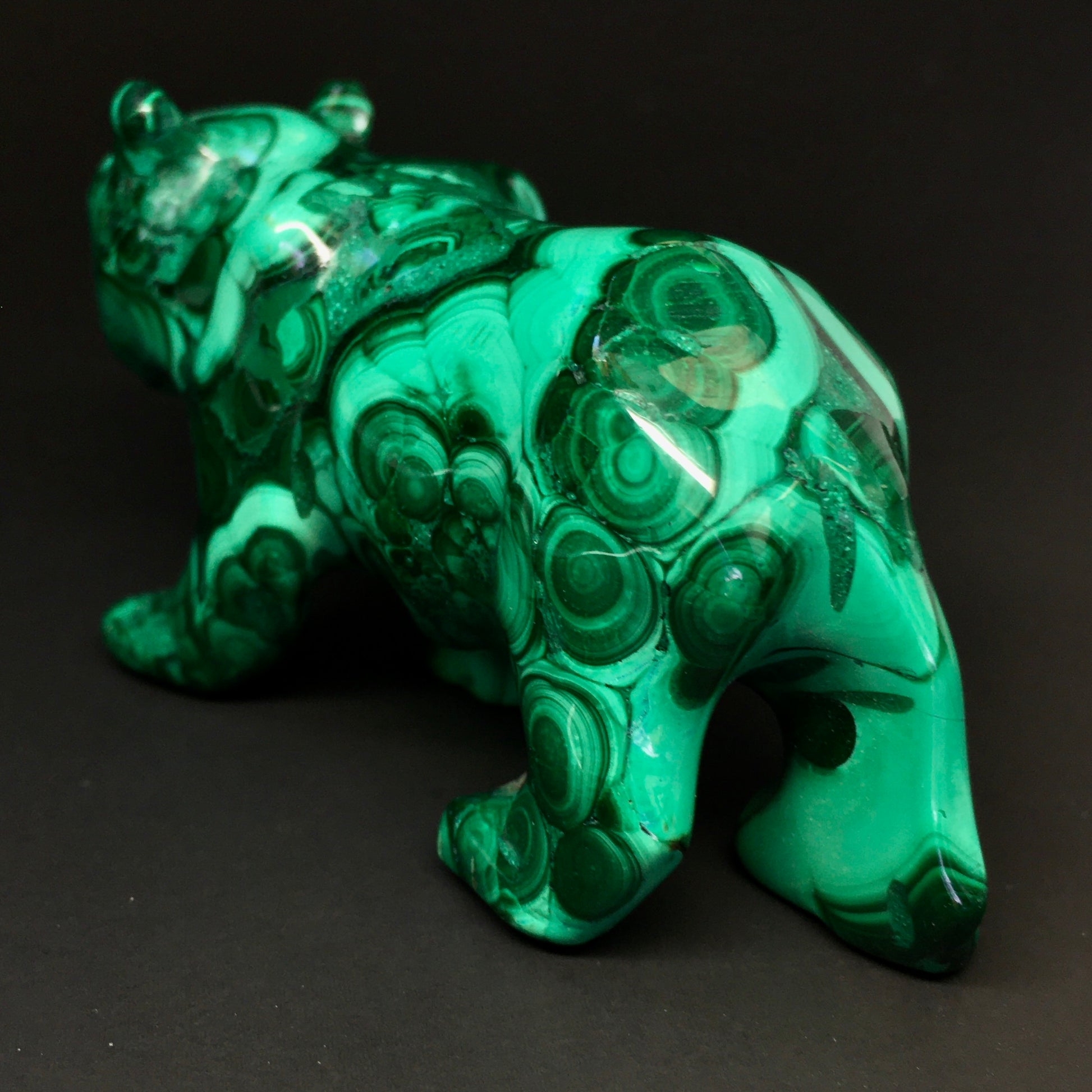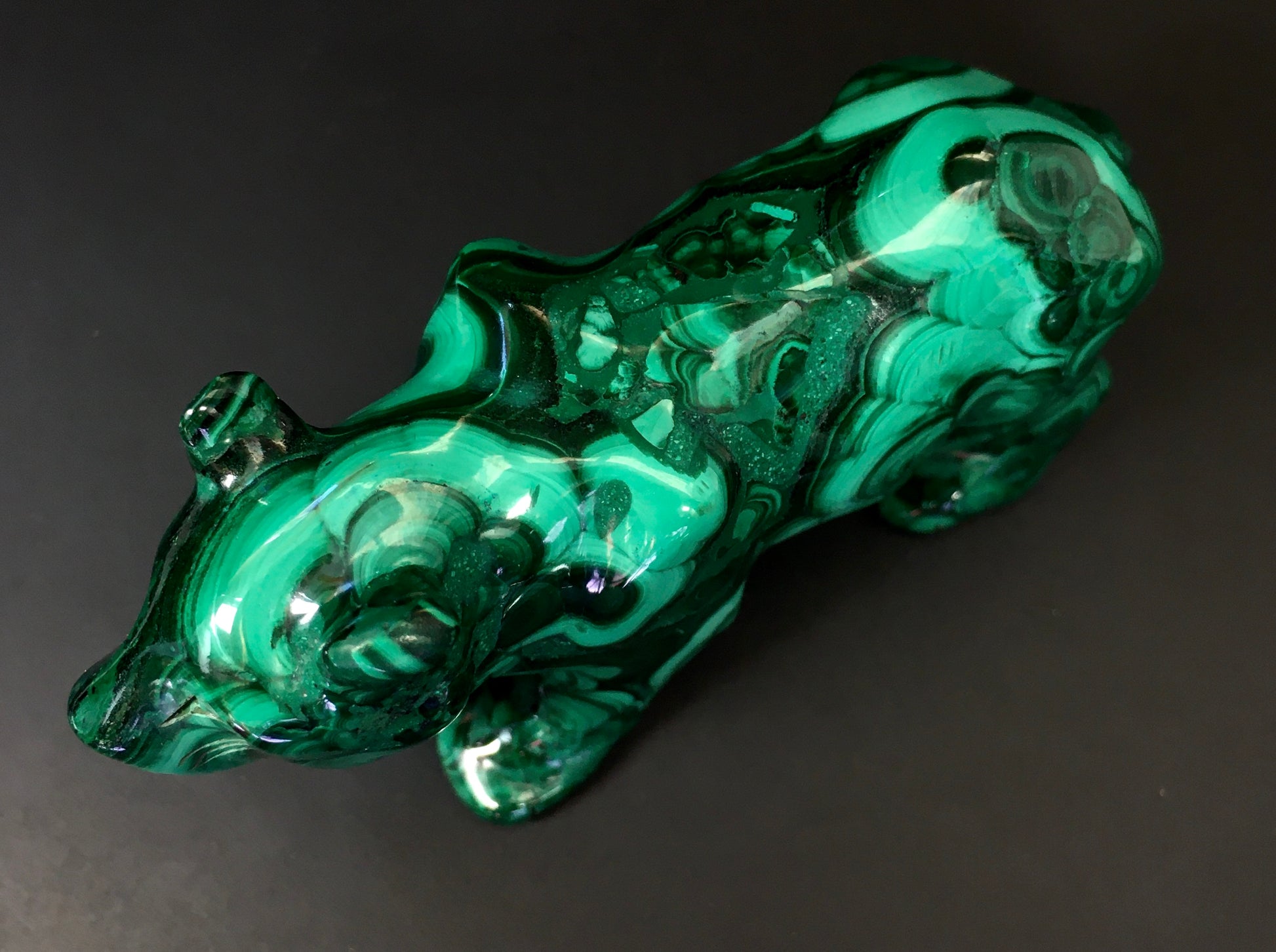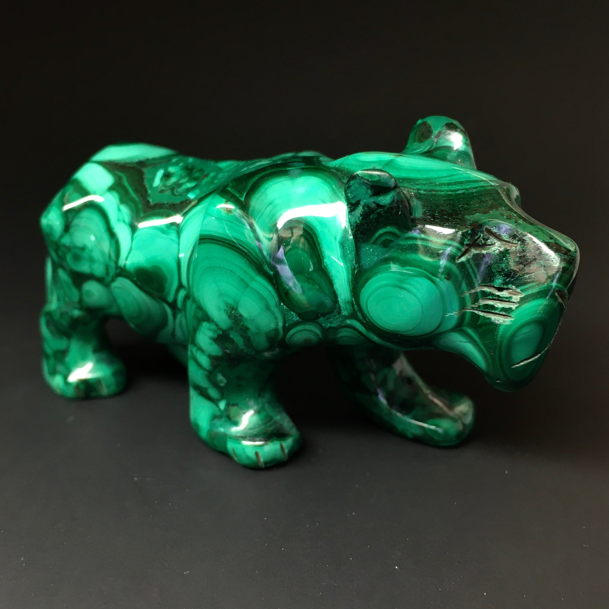 Your friends will roar with jealousy when they see this majestic lion! This feline is hand-carved and polished from a beautiful piece of malachite.