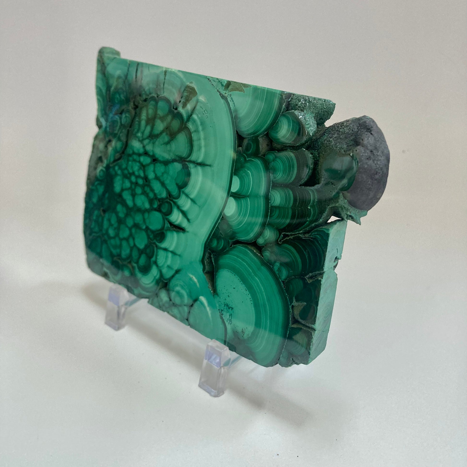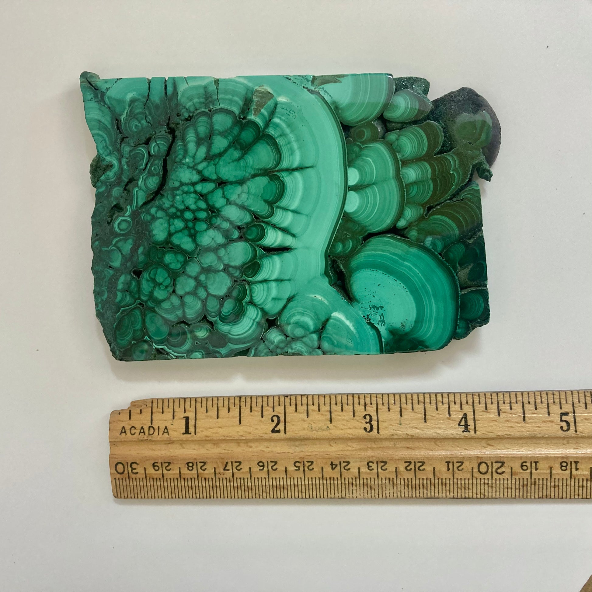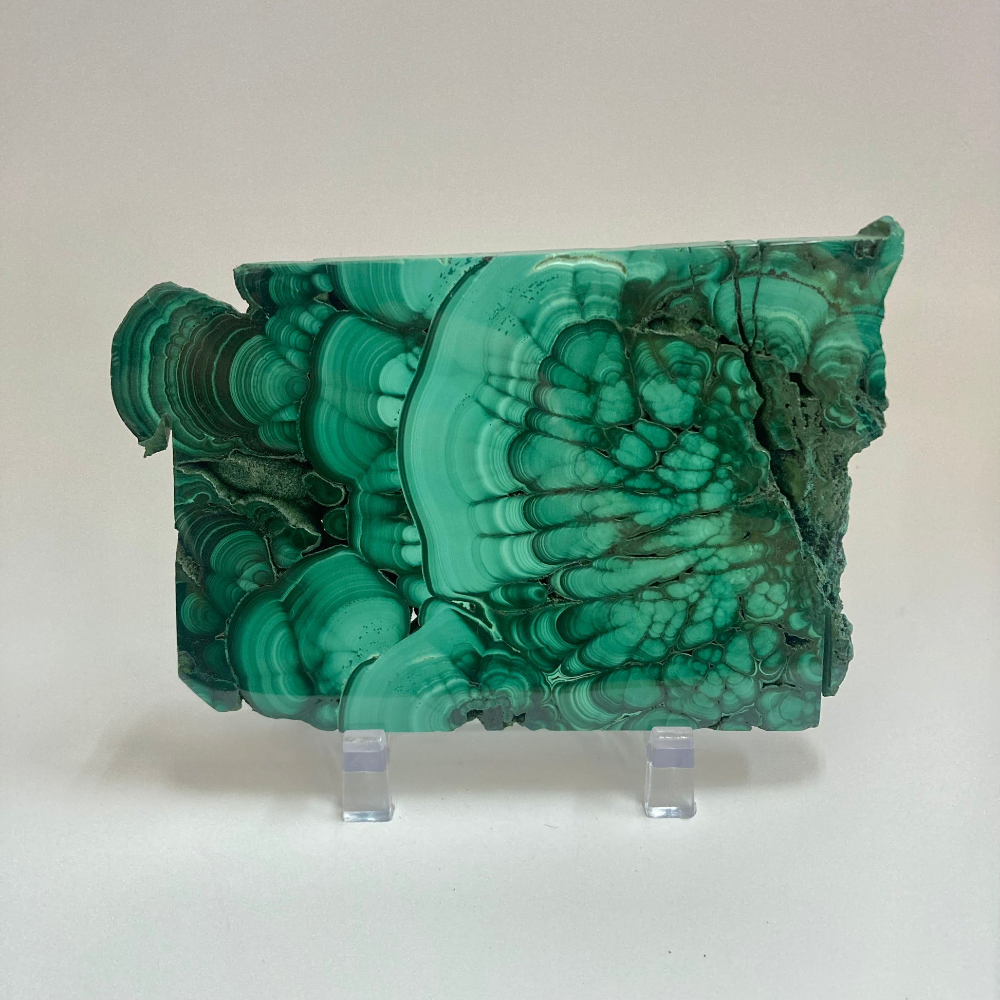 Malachite is a secondary copper mineral that is known for its green color. When it is cut, the surfaces display banding and eyes that resemble agates.