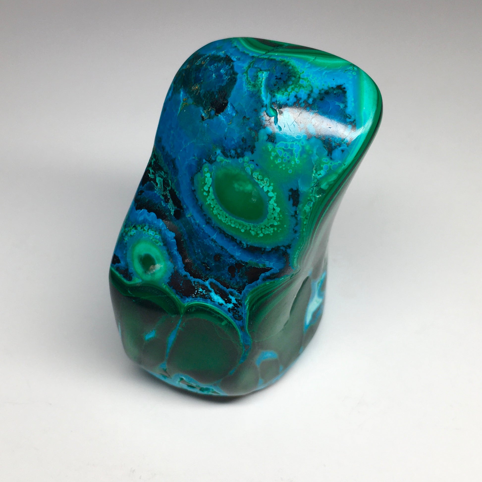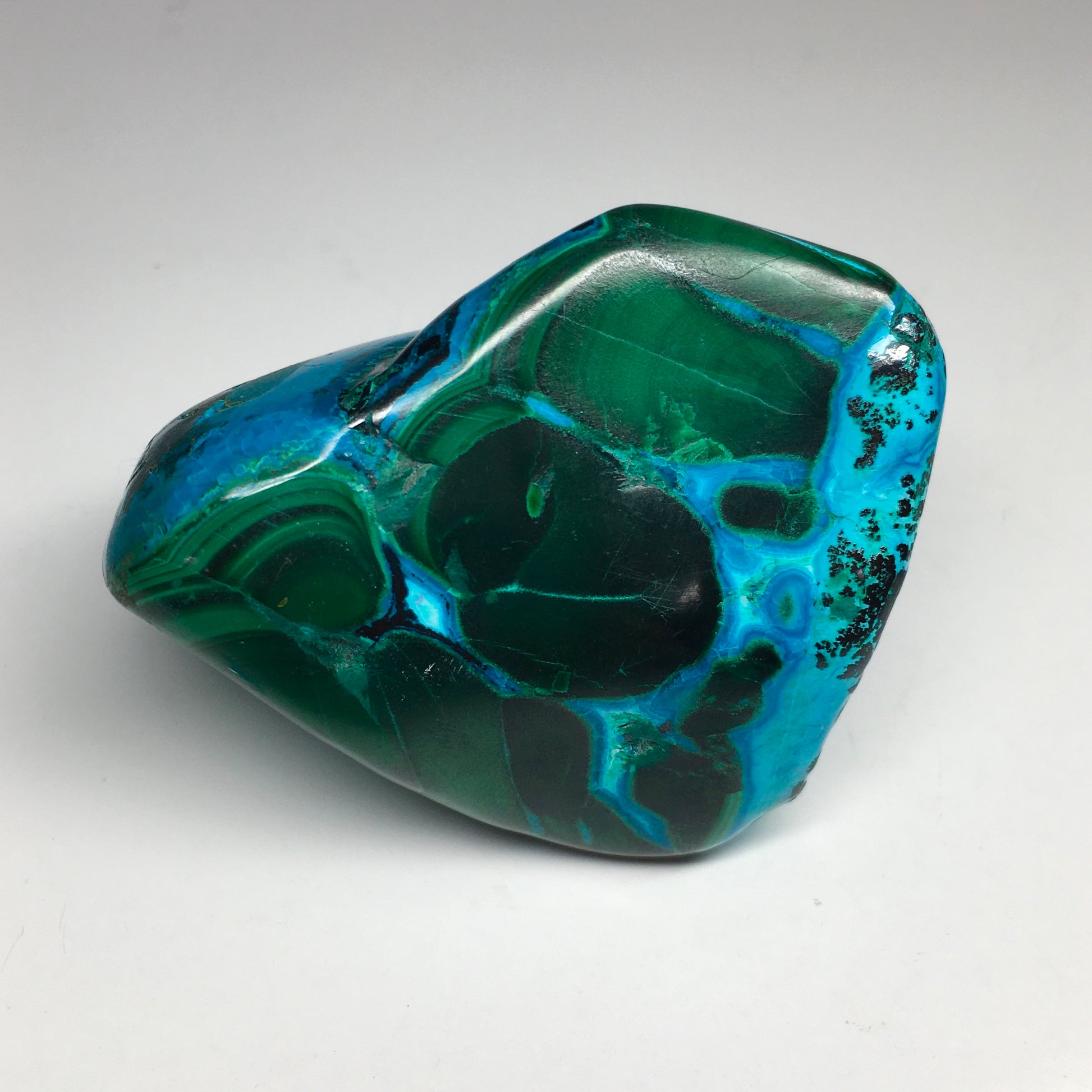 This stunning polished piece of malachite is an exquisite addition to any collection. The darker blues of the cornetite and robin's egg blue of the chrysocolla stand out amid the deep hues of green of the malachite. These colors and the smooth polish make for a specimen that displays nicely from all sides.