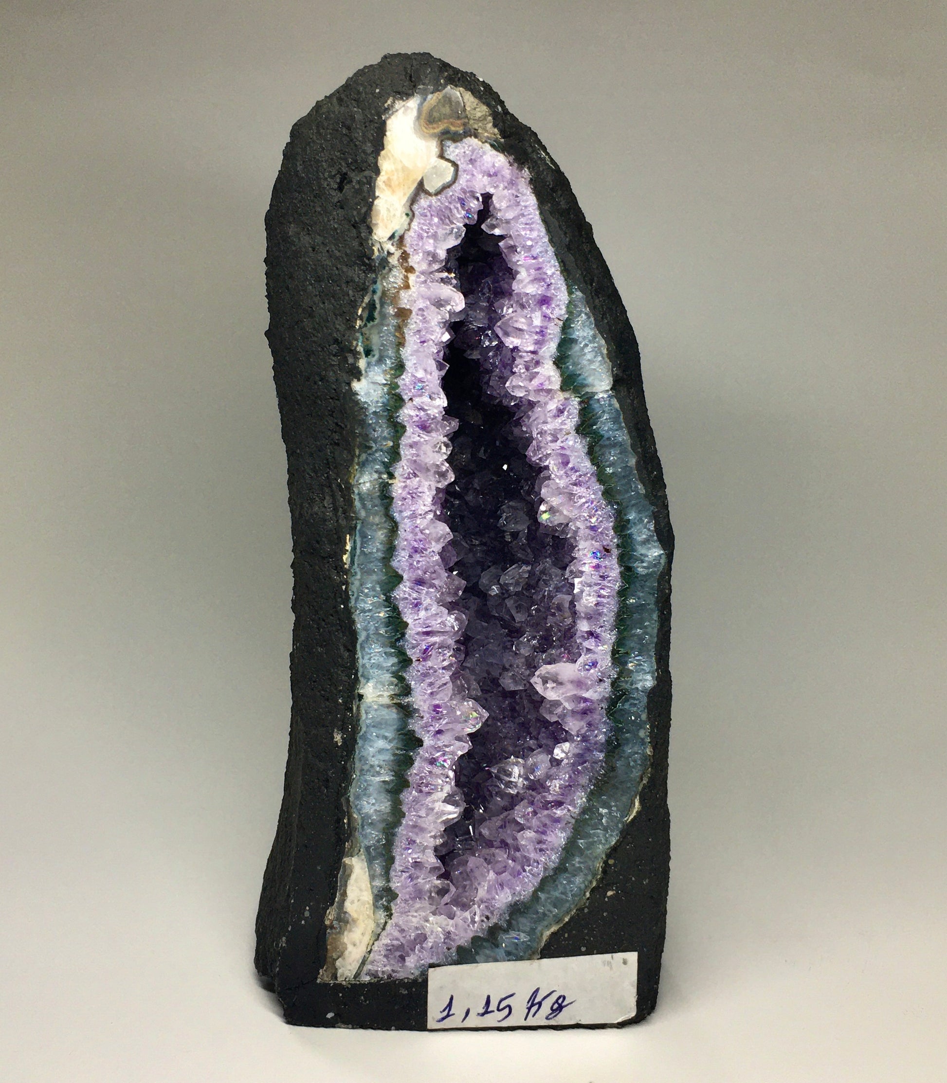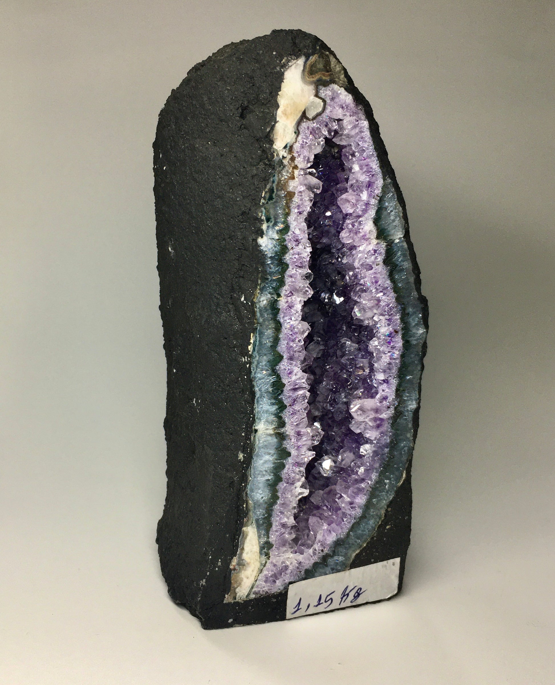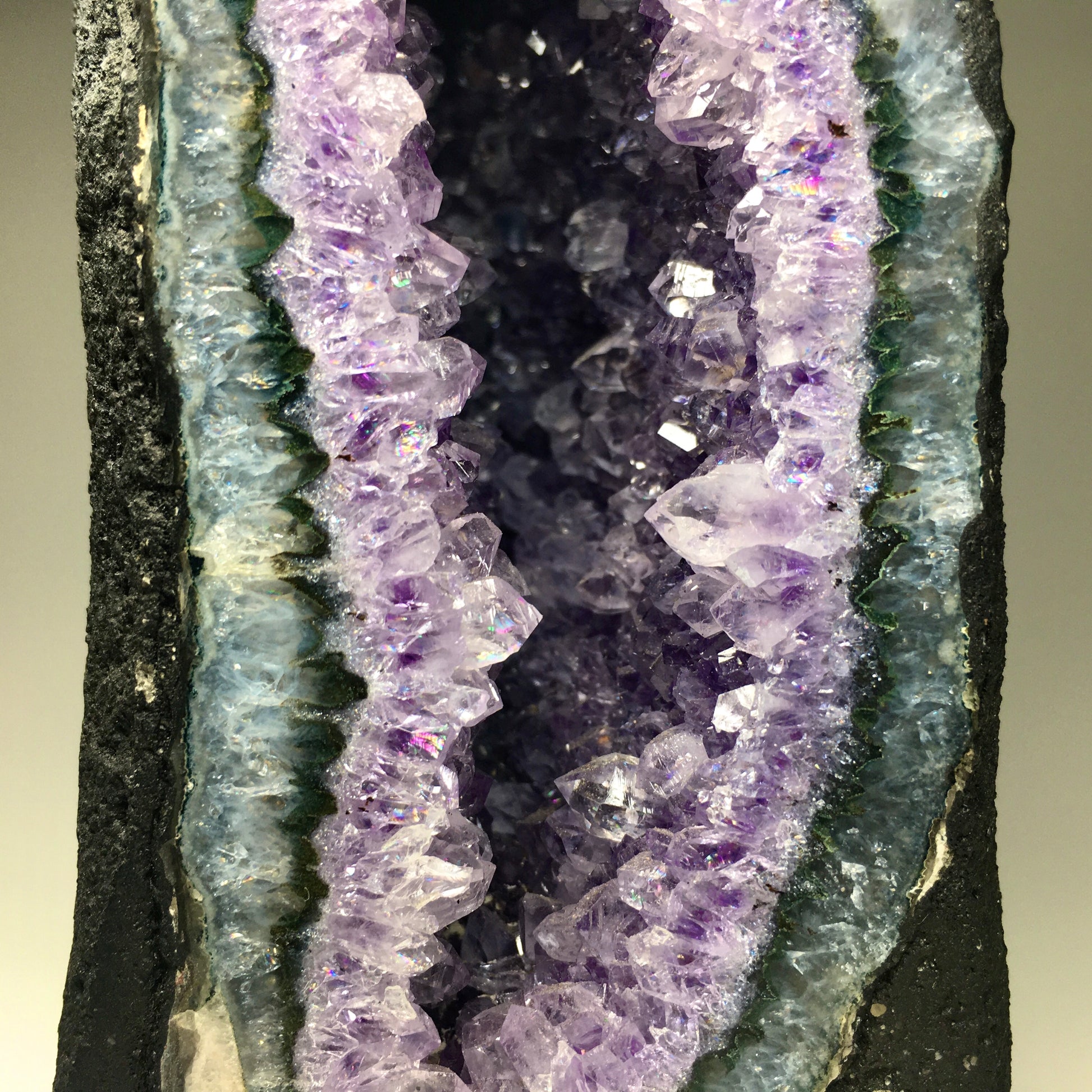 Now's your chance to have a piece of an amethyst mine in your home! The polished front of this miniature yet deep amethyst geode is beautifully contrasted with the rough, dark gray exterior. Peer inside and you'll see crystals of all hues of purple sparkling back at you.