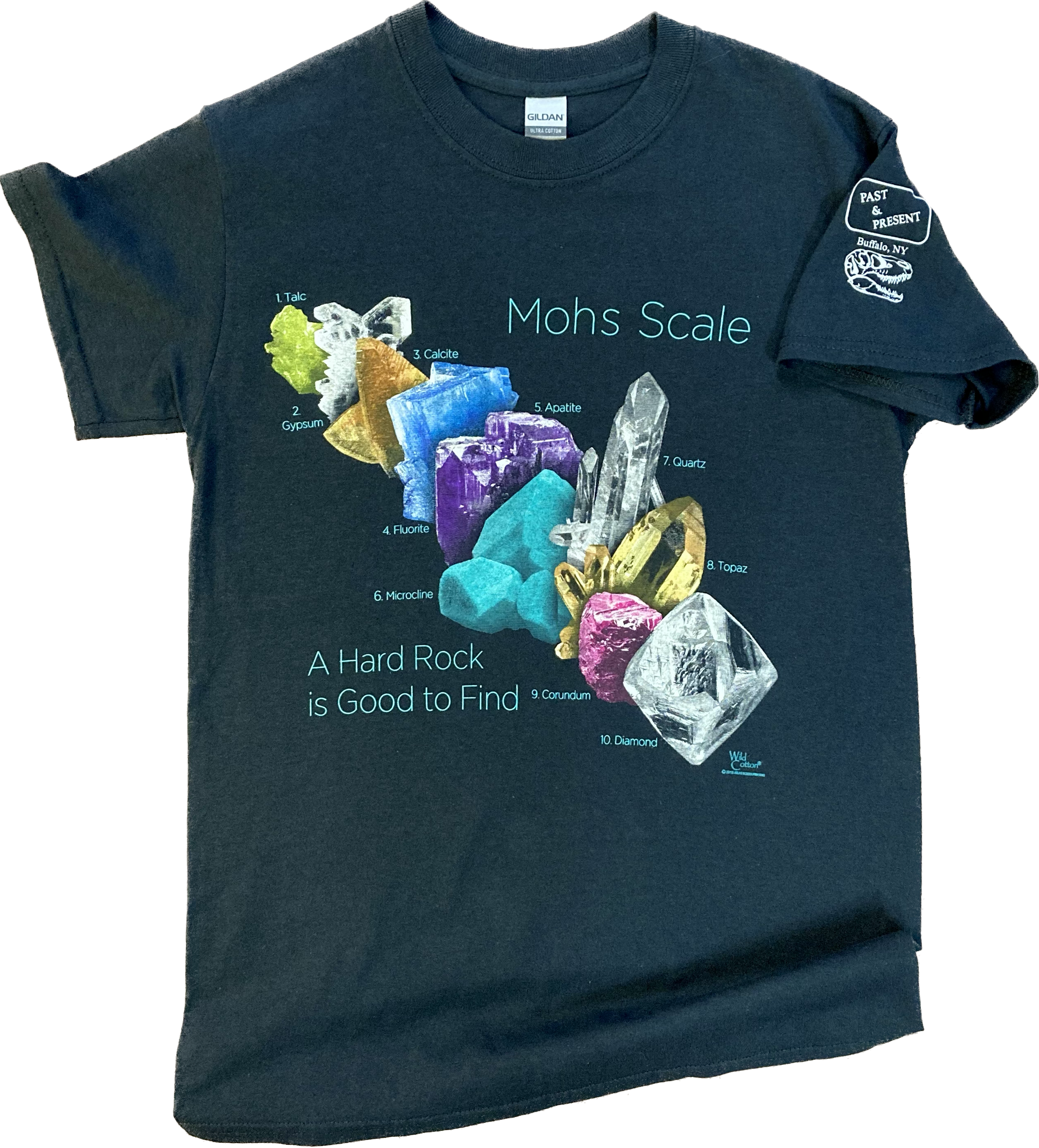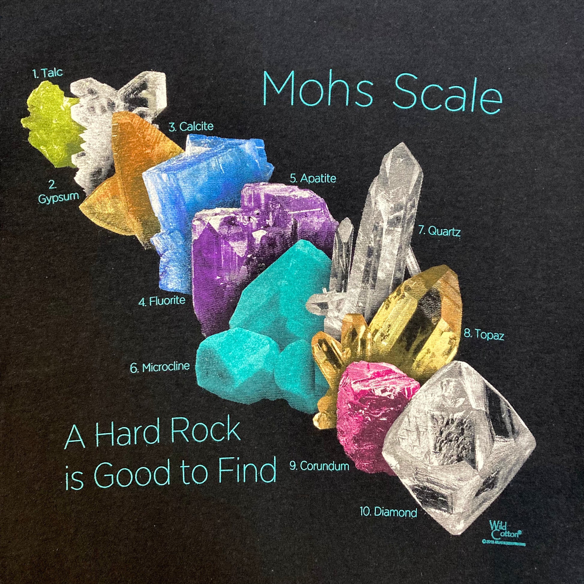 Show off your mineral knowledge with a shirt depicting the Moh's Hardness Scale. This scale is a helpful way to determine a mineral's identity based on the mineral's resistance to scratching, ie its hardness. 1 is the softest and 10 is the hardest.