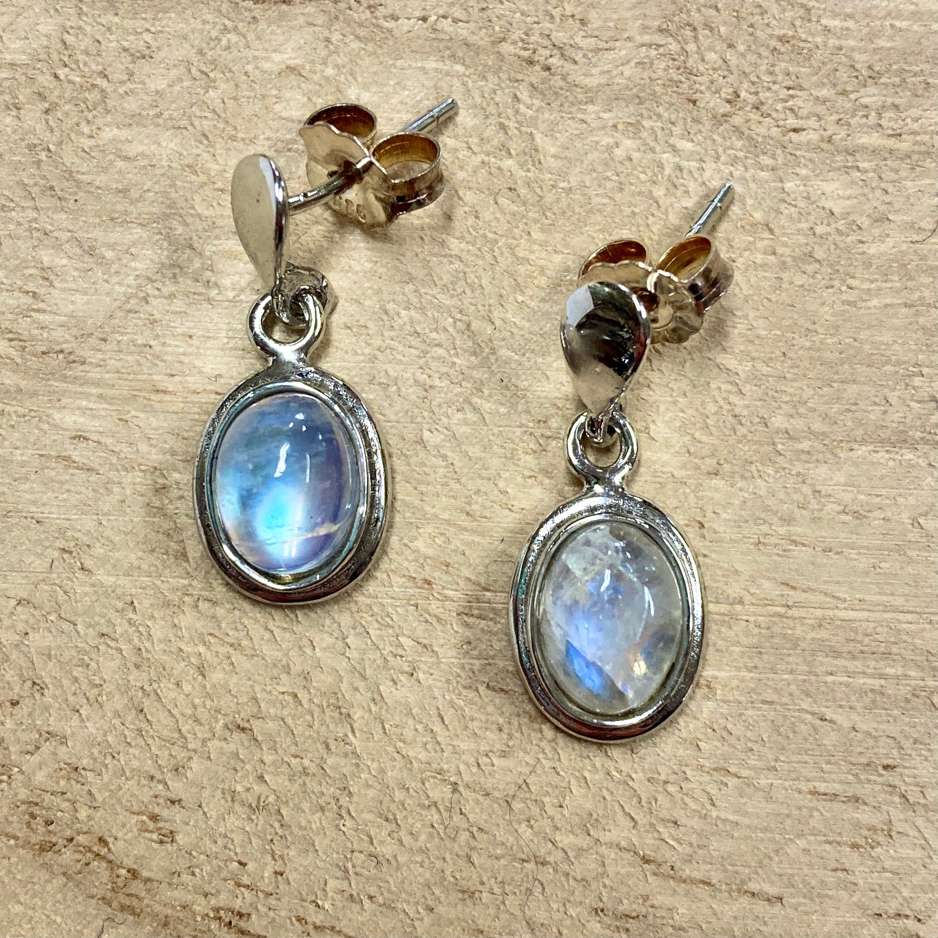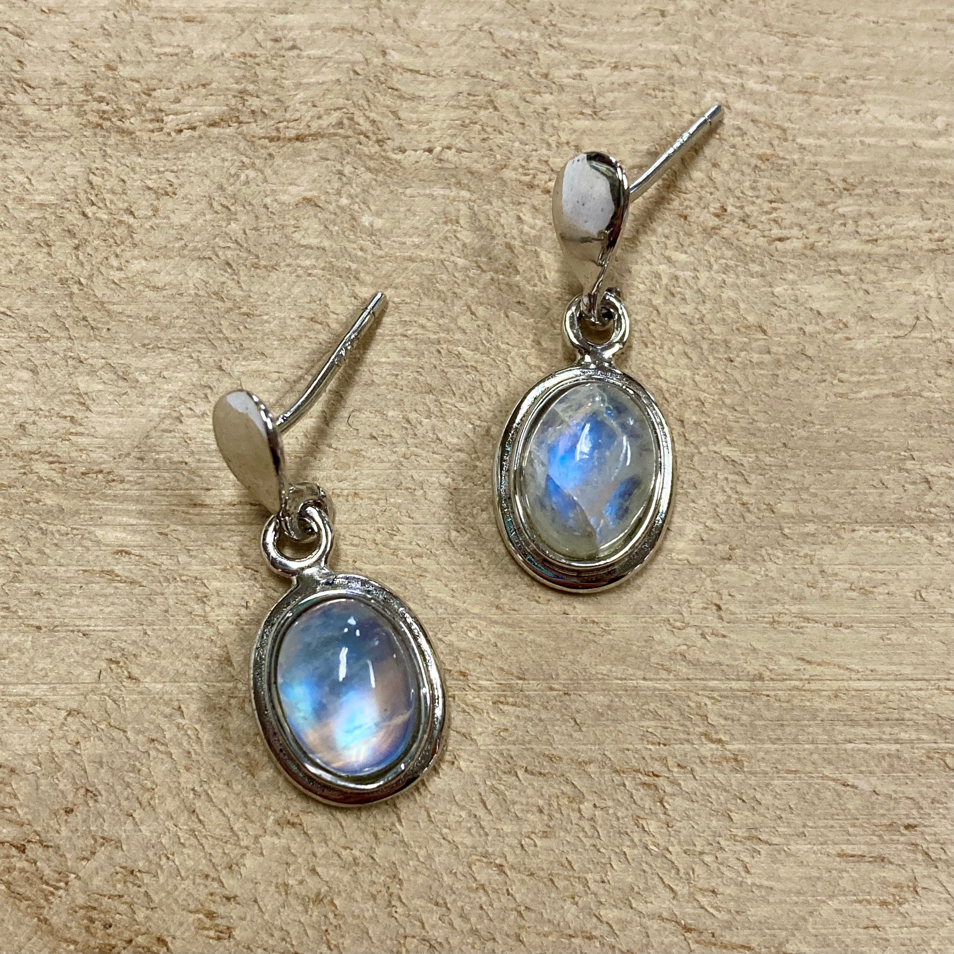 These beautiful moonstone earrings will shine bright for all to see. The smooth and polished stones are set into sterling silver. Showcasing its famous opalescent sheen, the soft blues, creams and purples create an ethereal glow from every angle.