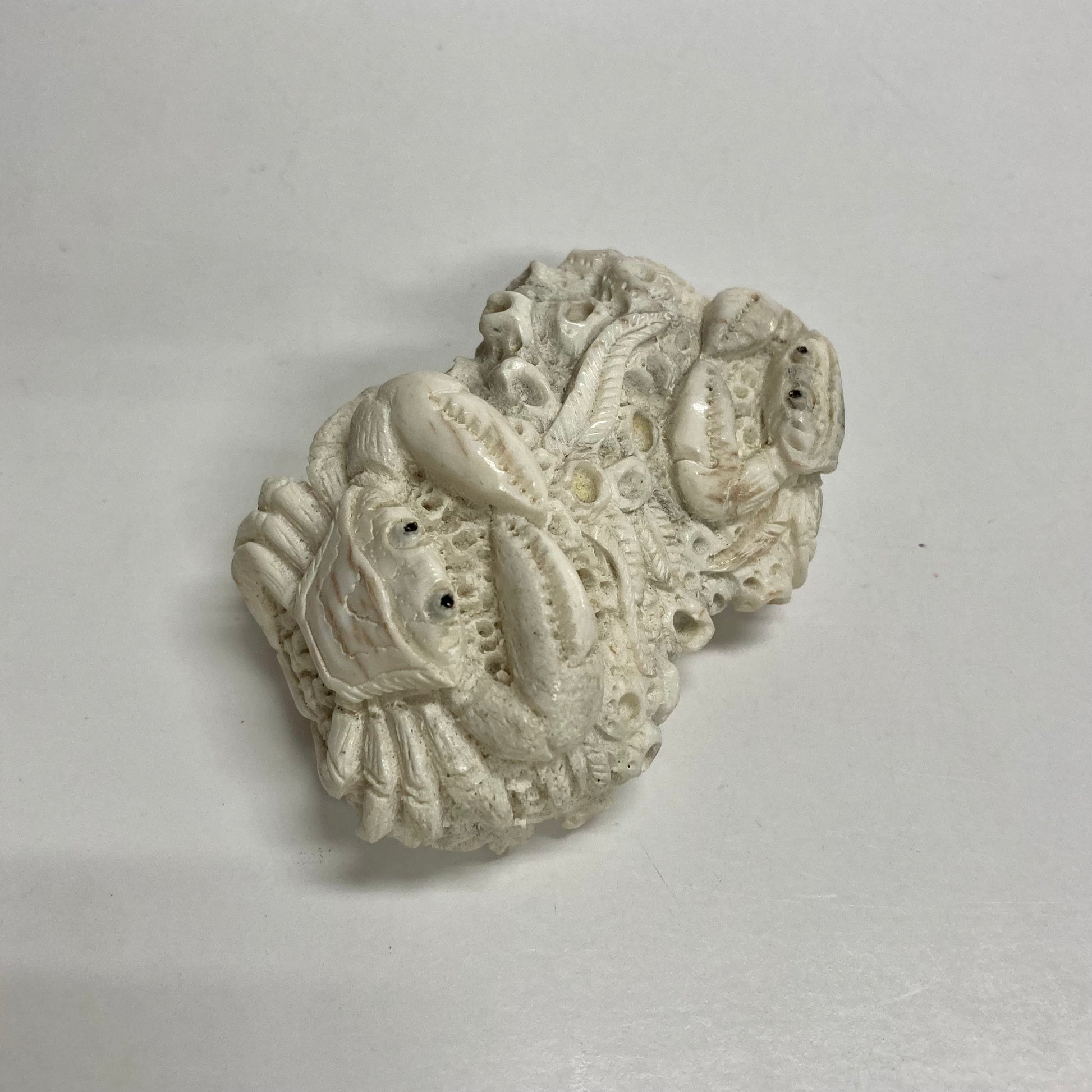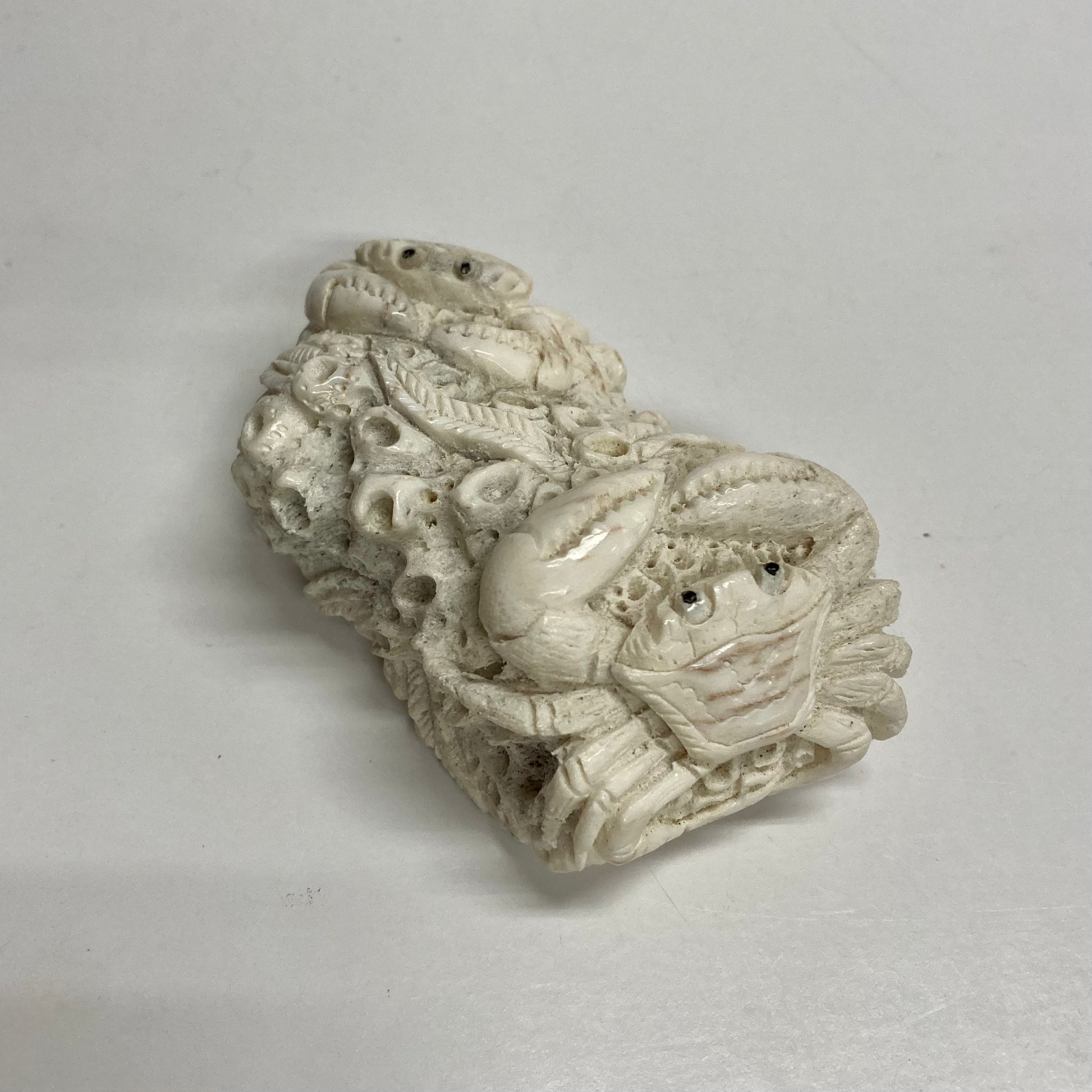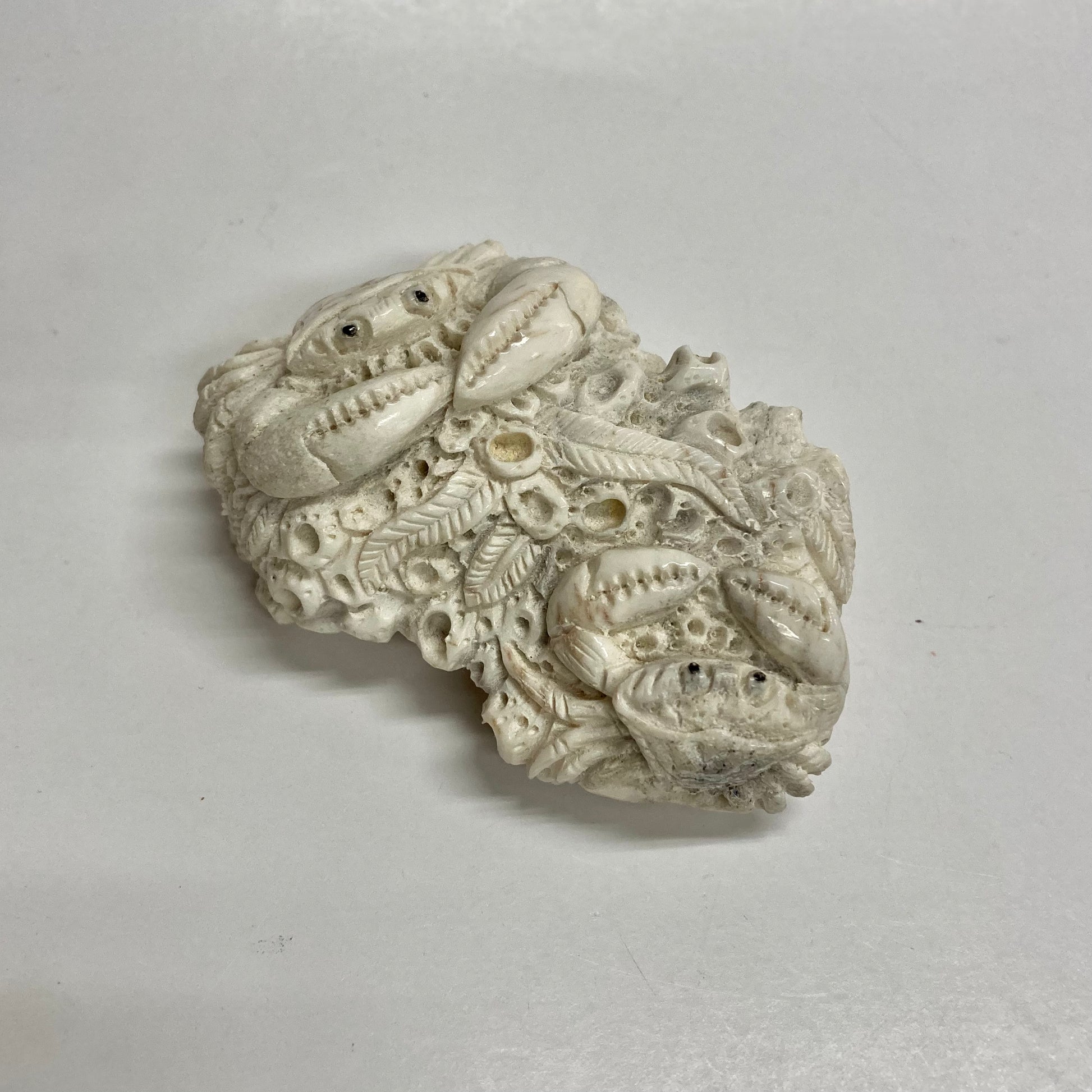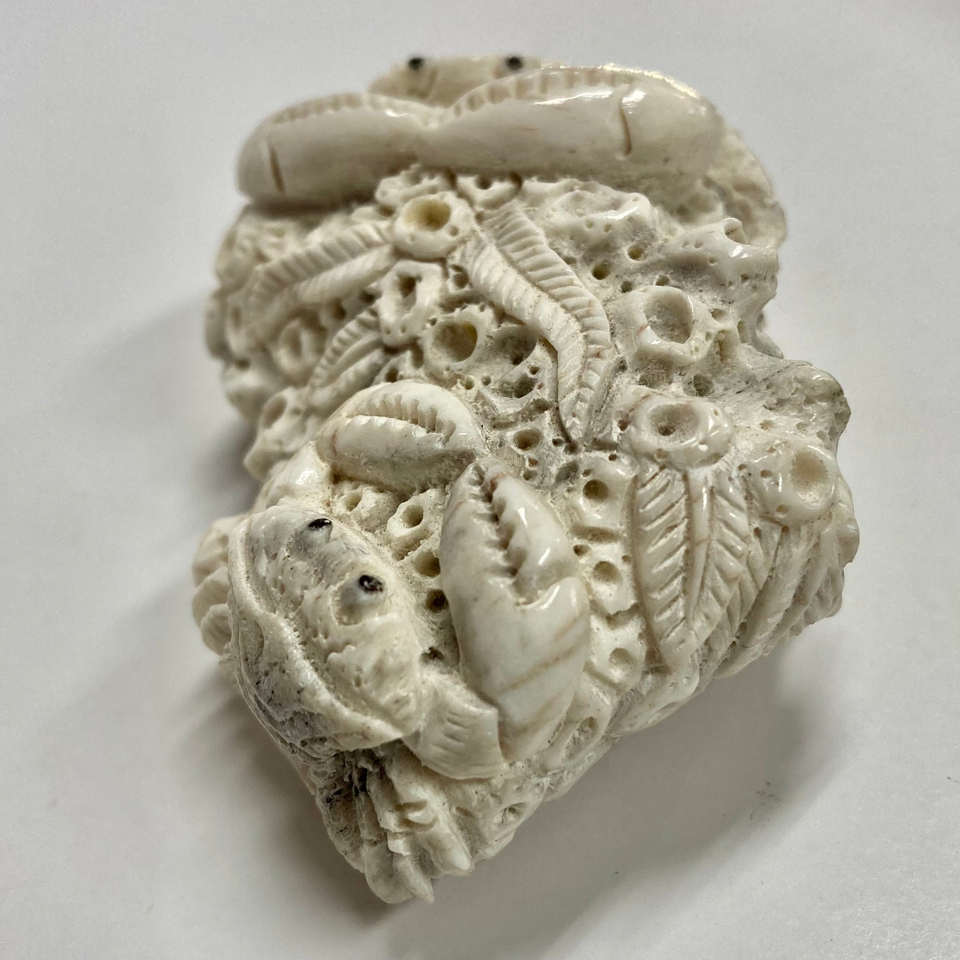 Two curious crabs are set atop a bed of barnacles and sea plants in this delicate display of exquisite carving techniques.
