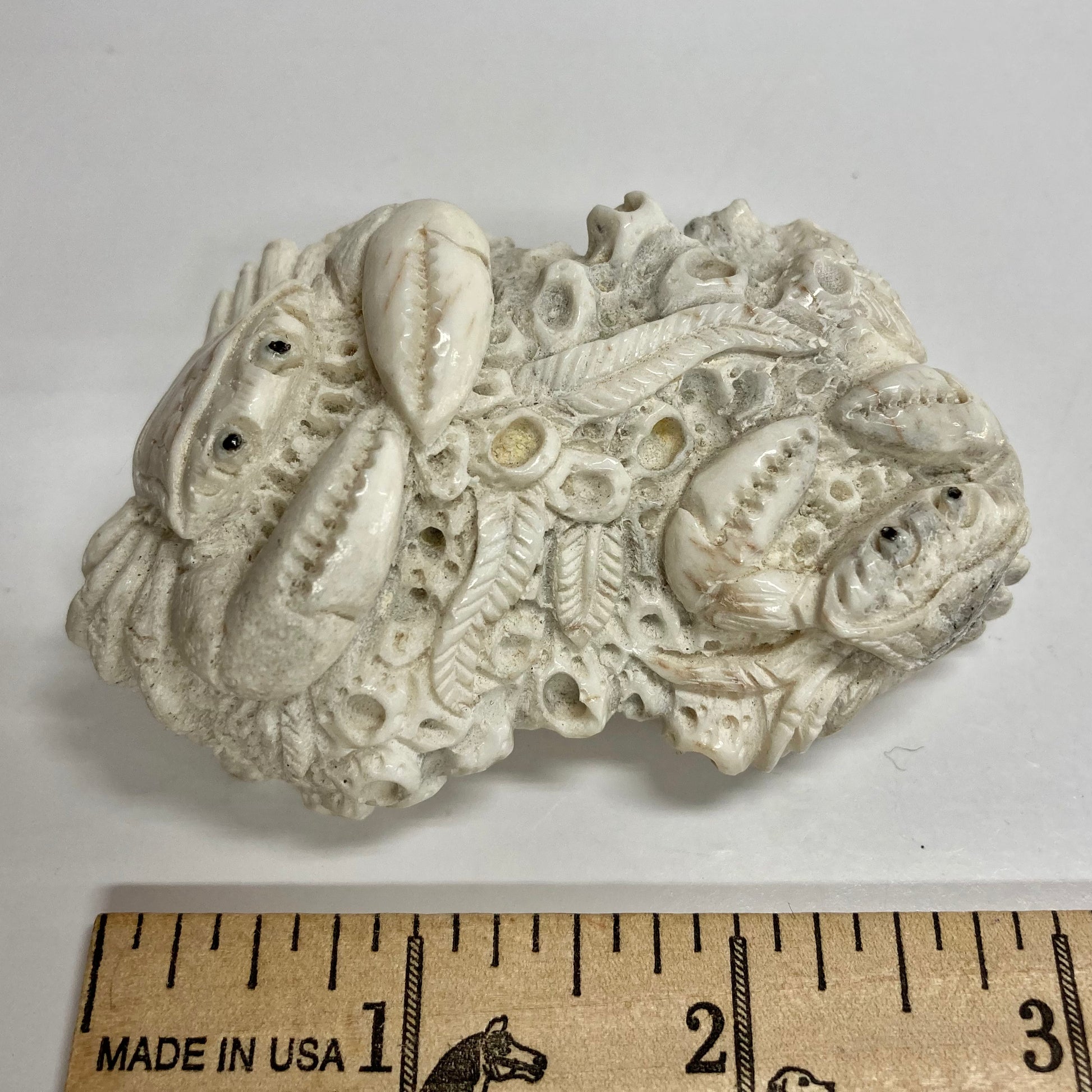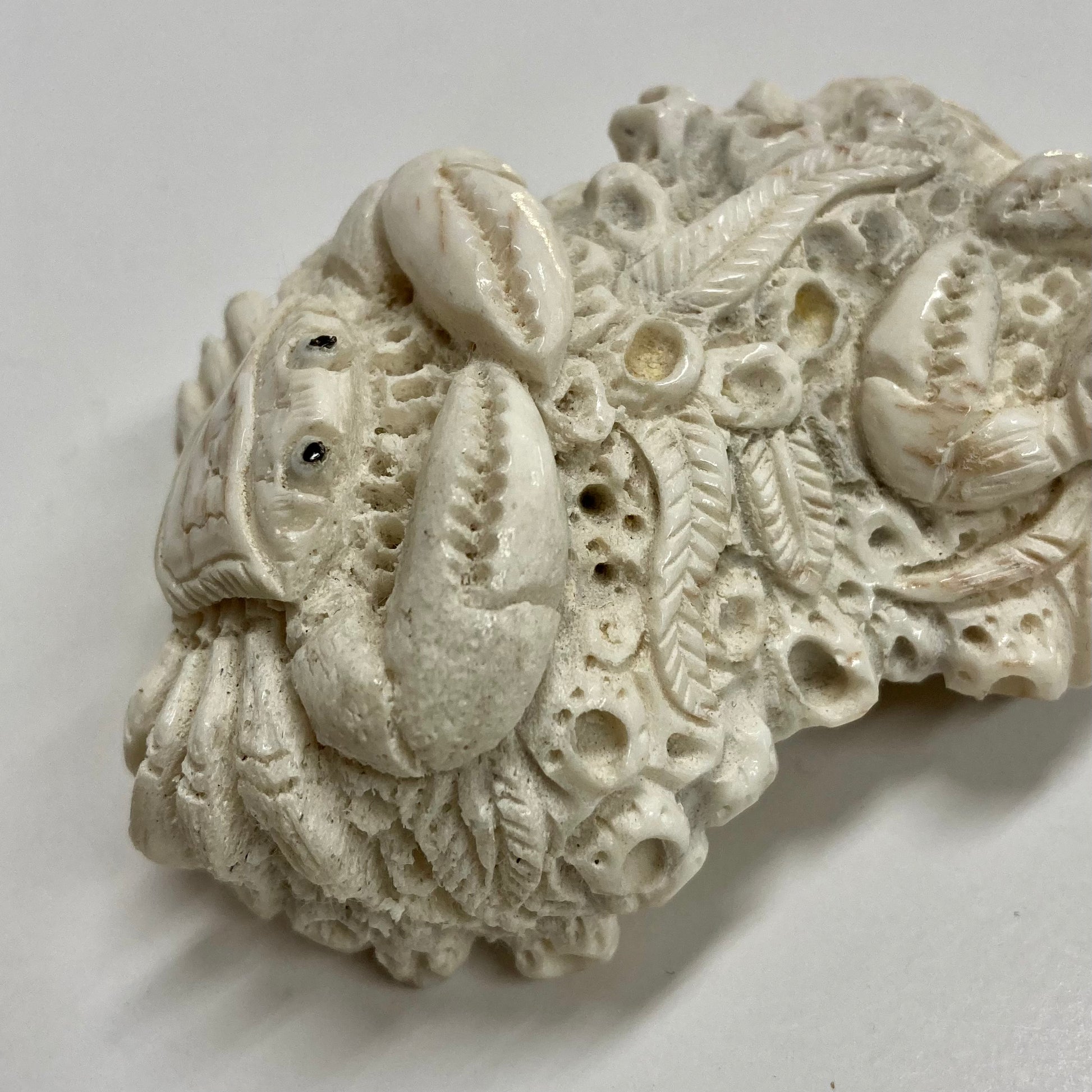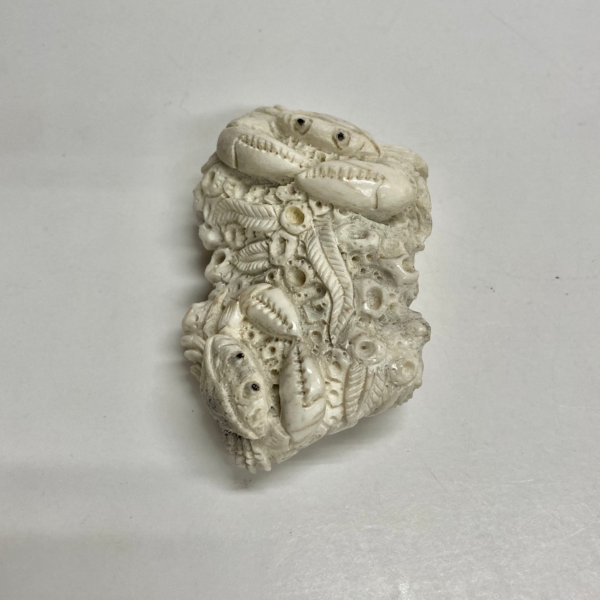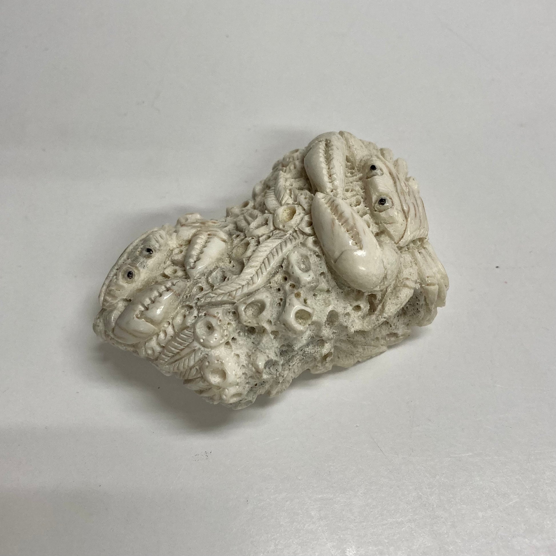 Two curious crabs are set atop a bed of barnacles and sea plants in this delicate display of exquisite carving techniques.