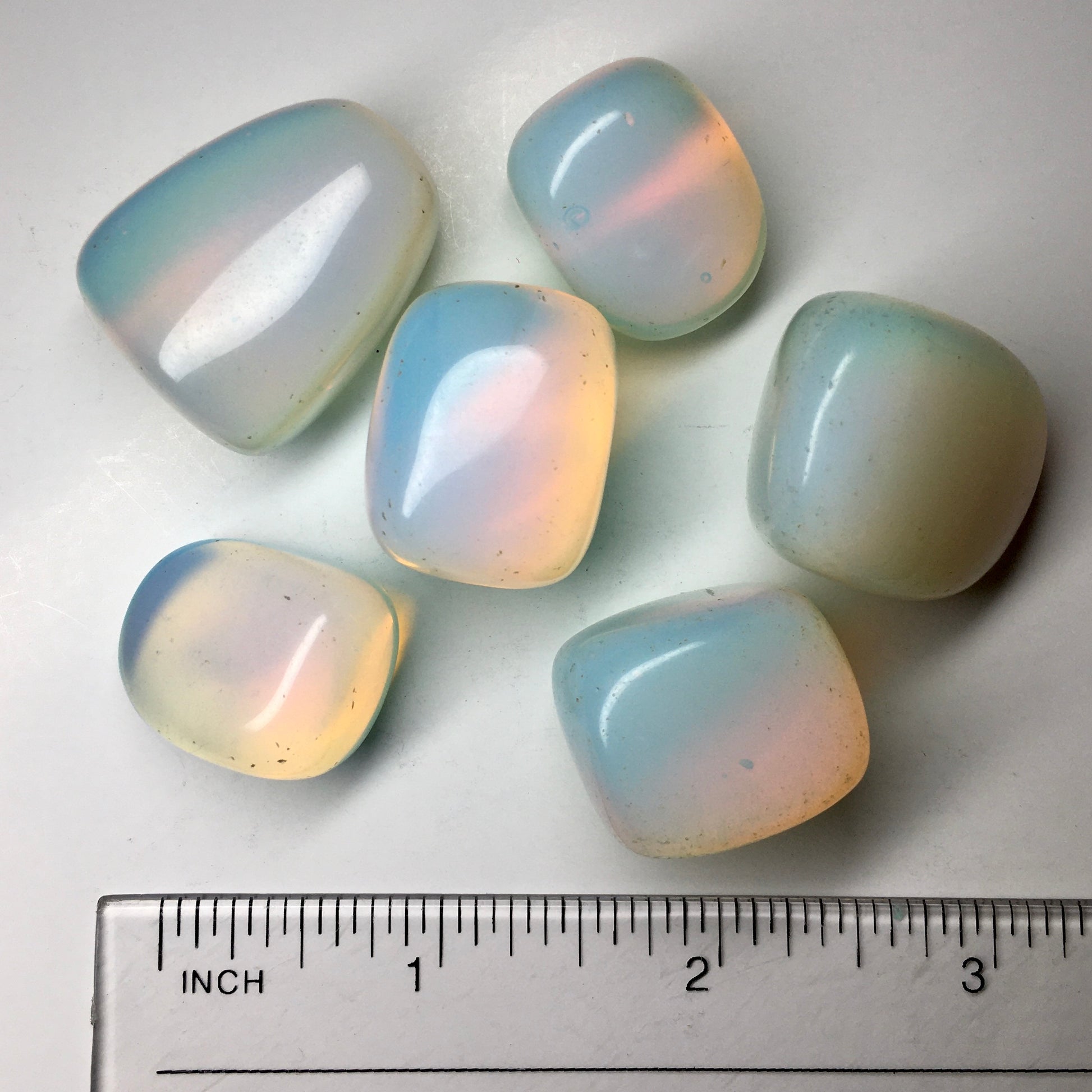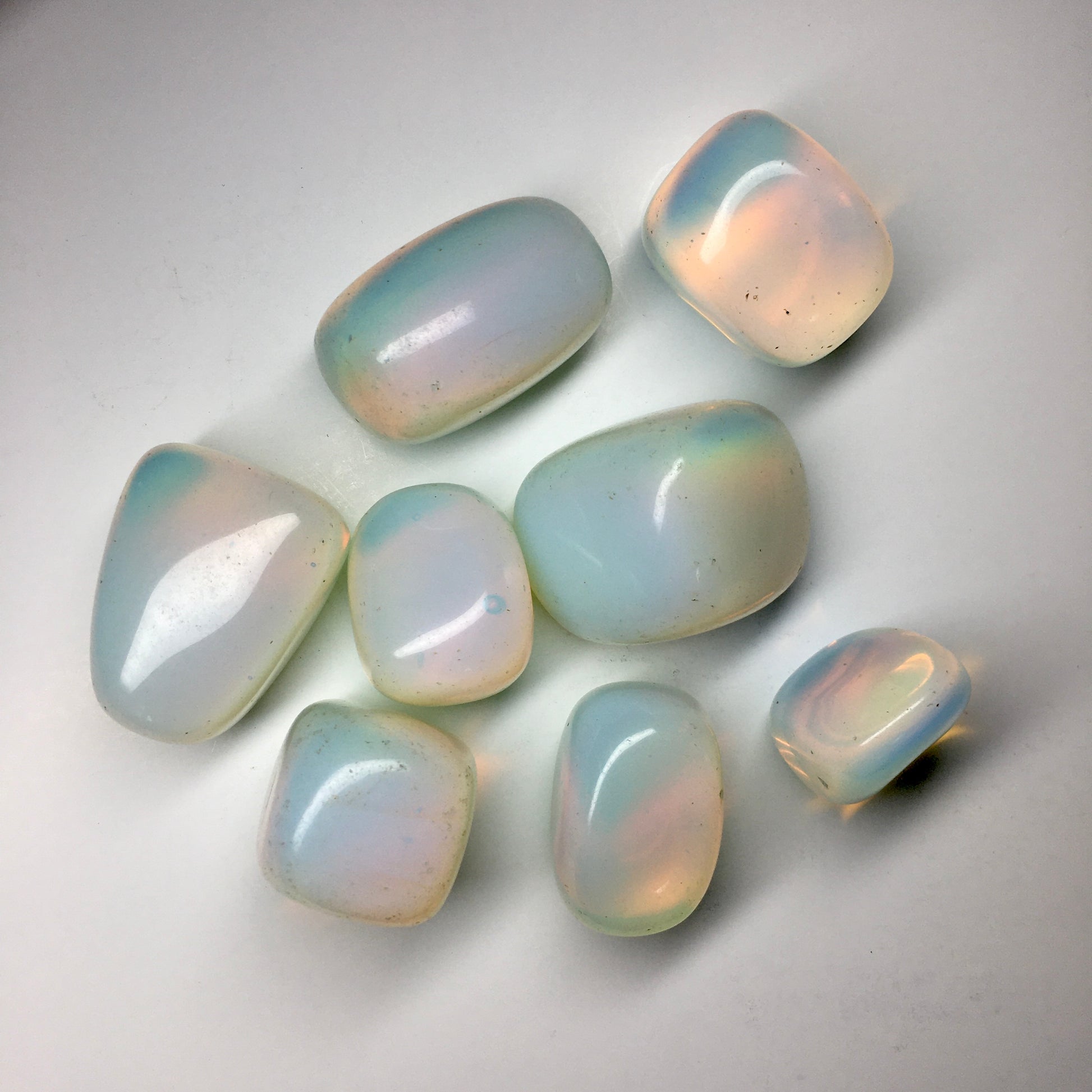 This man-made synthetic glass, nicknamed Tiffany's Stone and the Ice Cream Stone, appears to have a blue color when placed against a black background, yet gleams a milky white with pinks, yellows, and oranges when on a white background. This opalescent glass is translucent so it is generally possible to see through. It is a glass-resin mostly made of dolomite and metal, which creates the beautiful colors. Natural Opalite is rare and forms from opalized volcanic ash, generally found in Africa and Brazil.