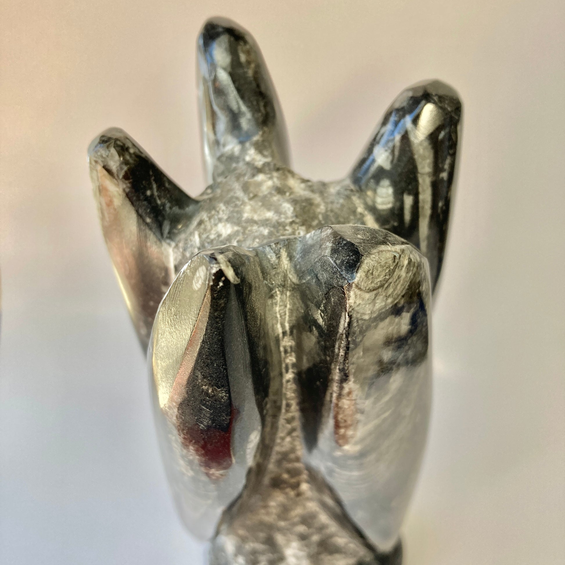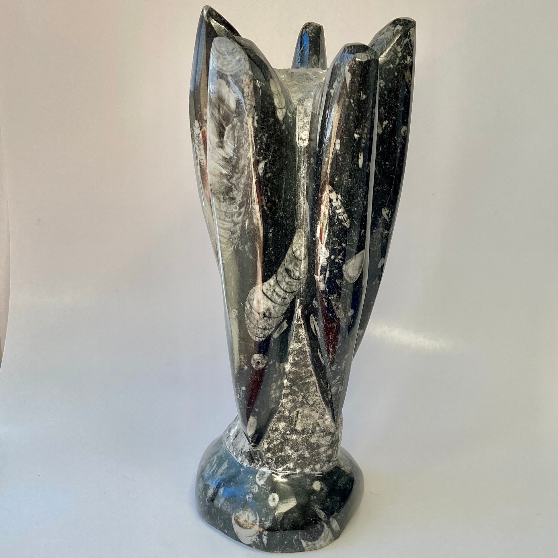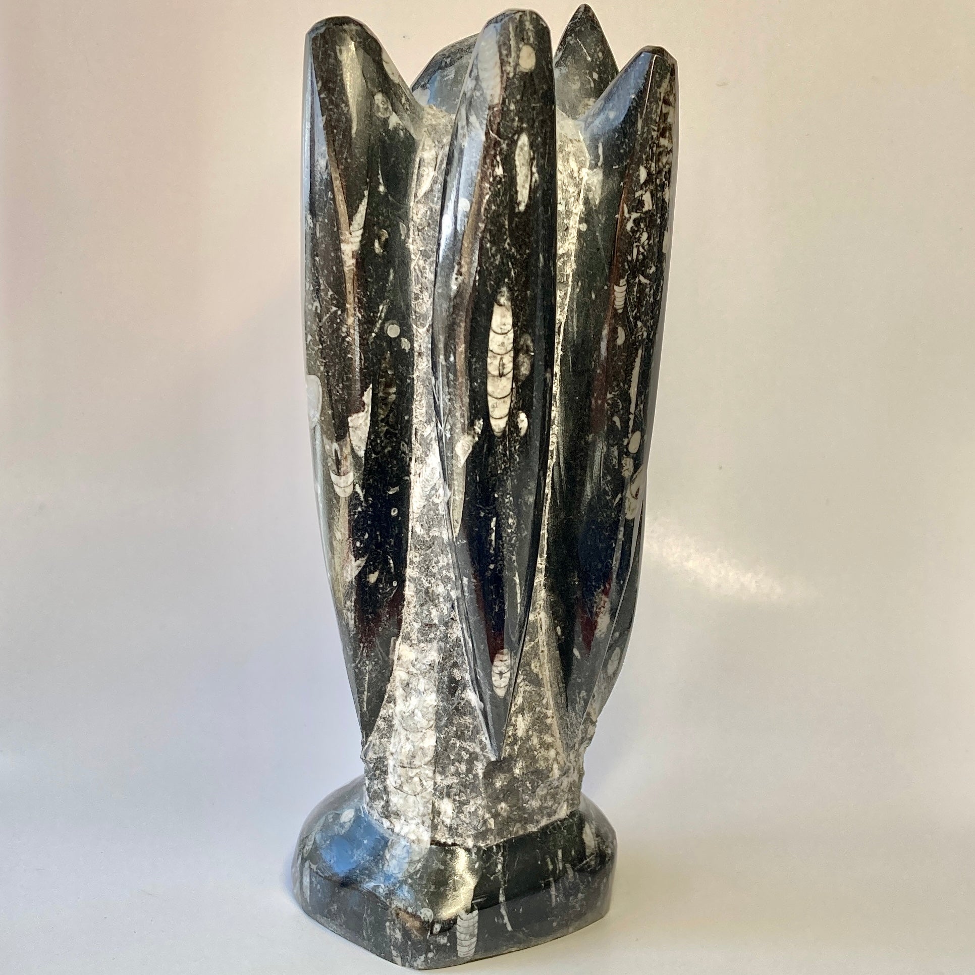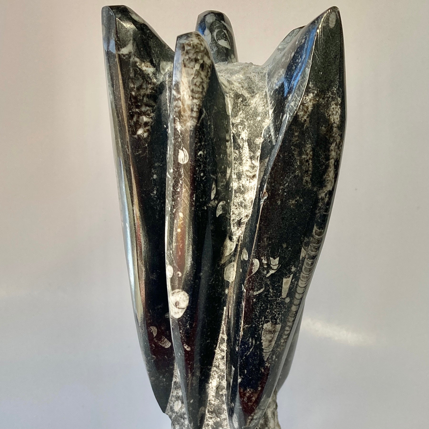 This stunning, millions-of-years-old sculpture is comprised of polished orthoceras fossils on a stone base.