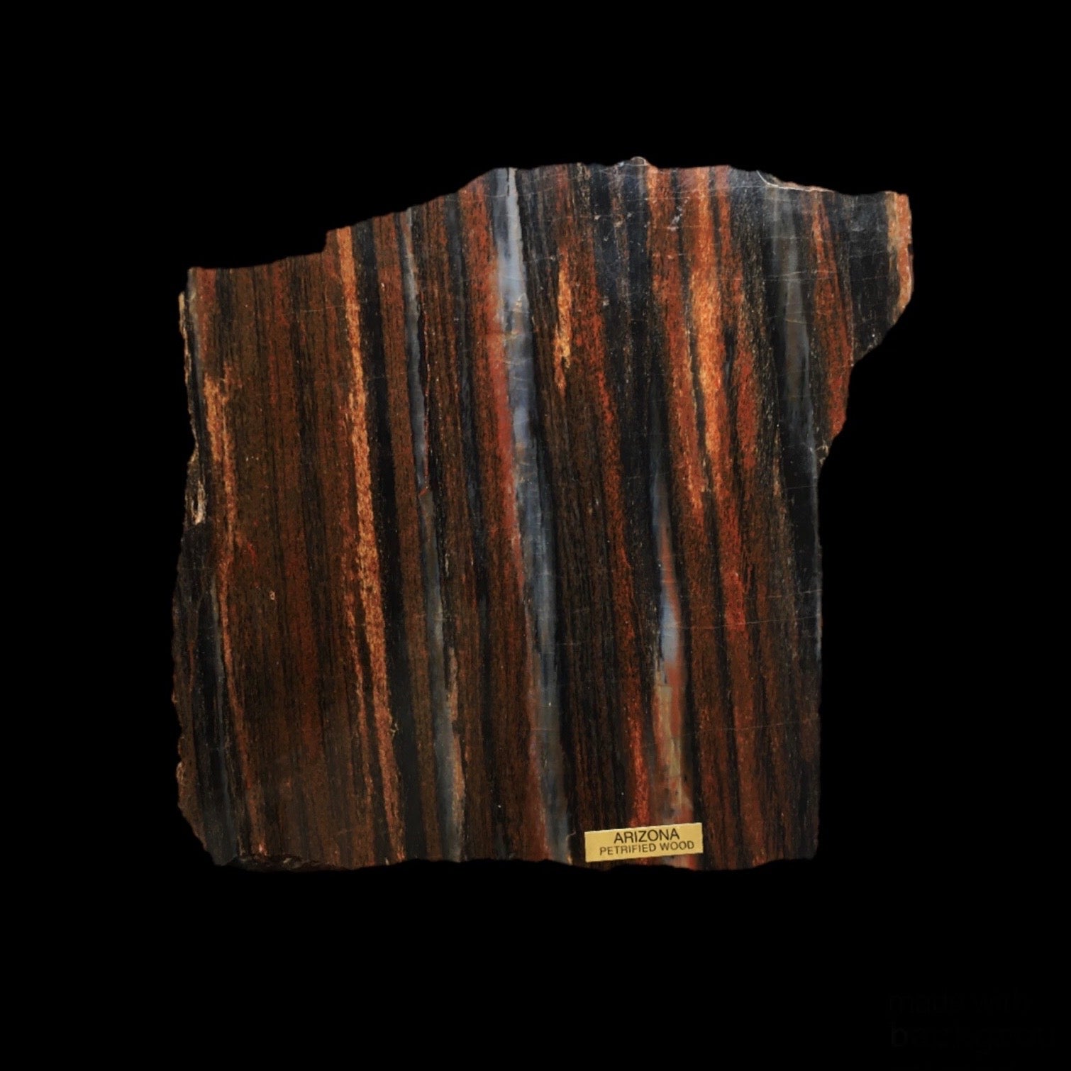 A golden sticker with the words "ARIZONA, Petrified Wood" is placed on the lower right polished face.