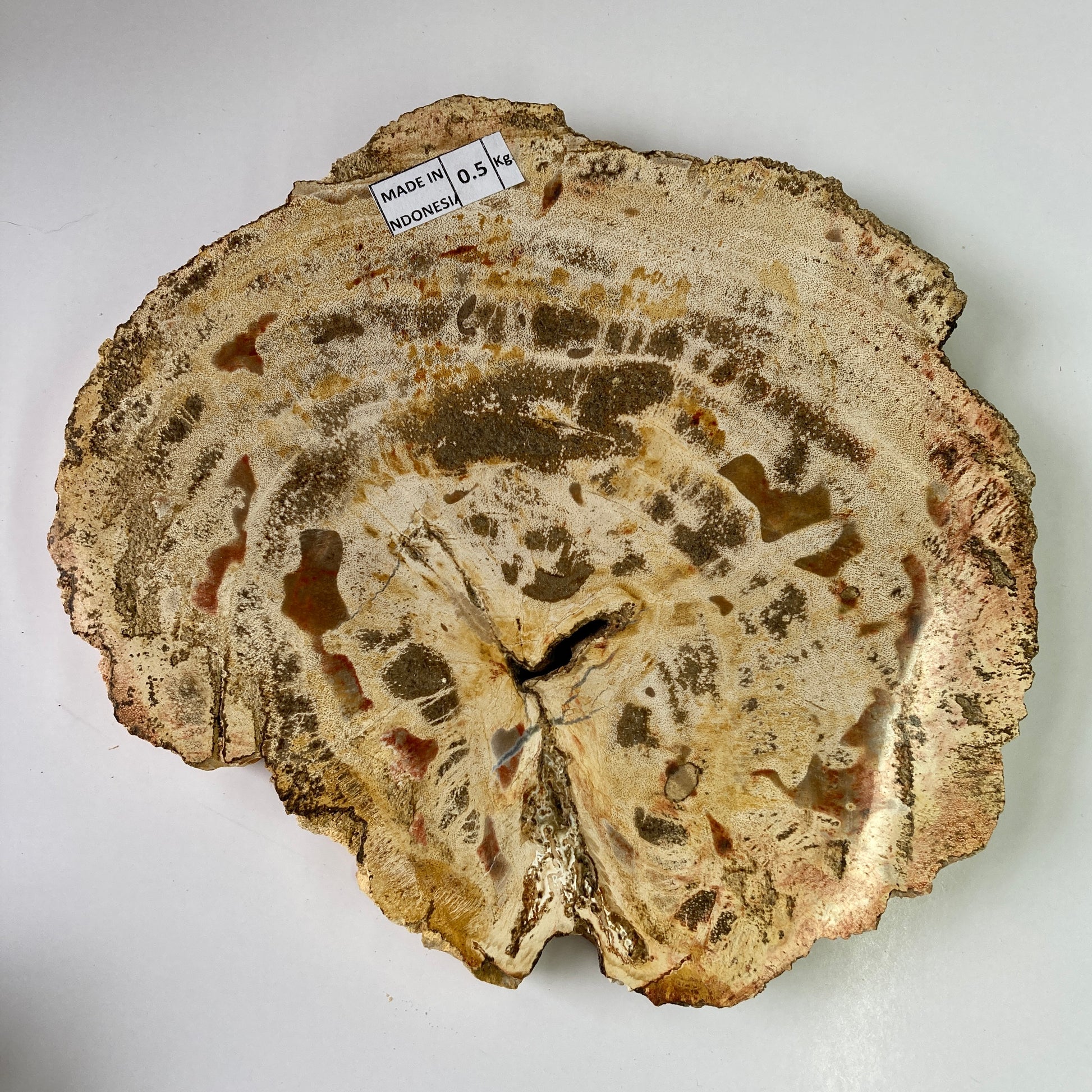 In the late Tertiary period, blankets of rainforest surrounding volcanoes were plentiful throughout Indonesia. After a volcanic eruption these trees were buried by ash and lava eliminating any microbes that would rot the wood. The wood was replaced with silica-rich minerals like chalcedony, quartz, calcite, opal and jasper. The beautiful colors in the wood come from assorted trace elements; iron creates shades of brown and orange.