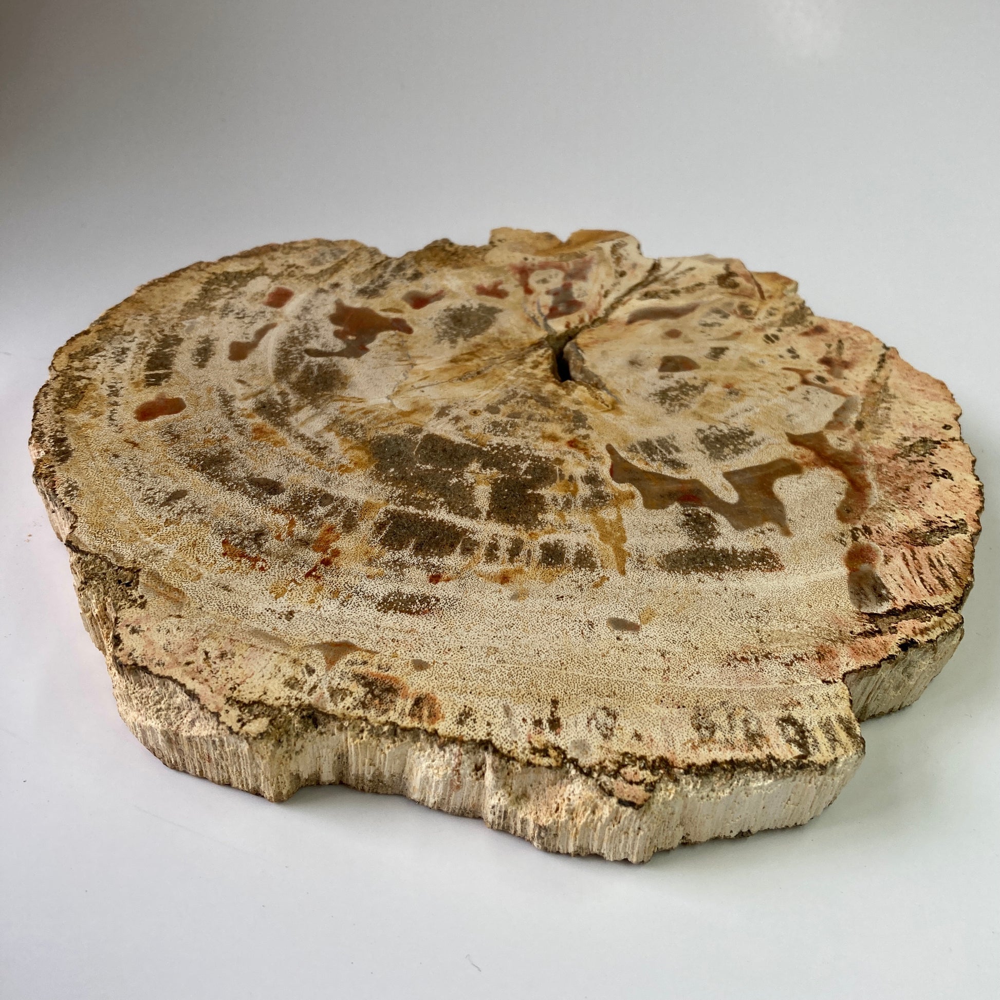 This stunning piece of petrified wood from over 2.5 million years ago is filled with warm browns, oranges and reds. The smooth, polished surface contrasts with the rough, raw outer layer to make for a beautiful specimen.