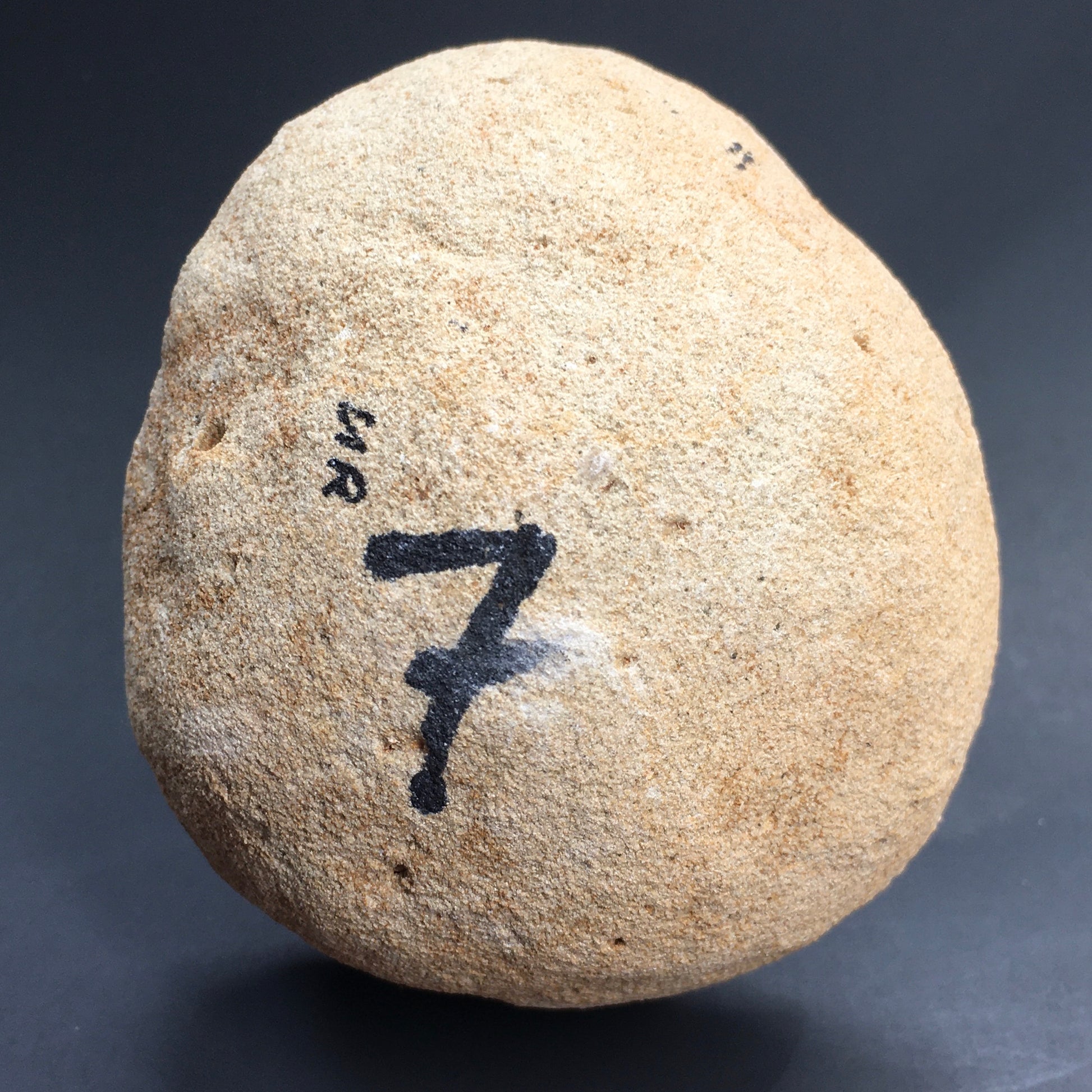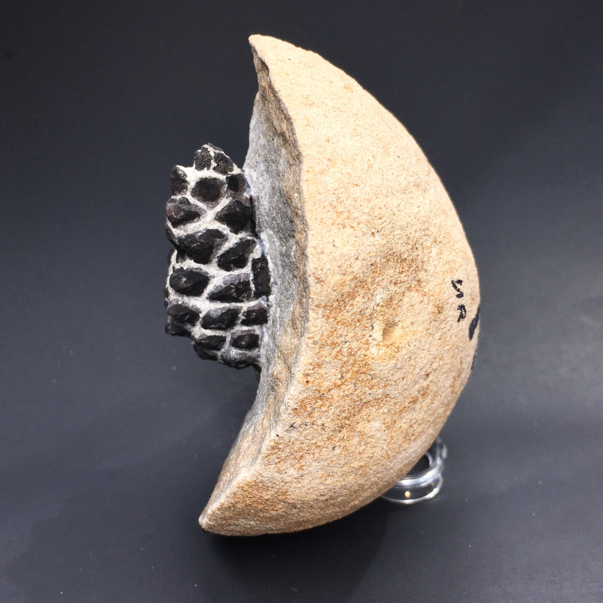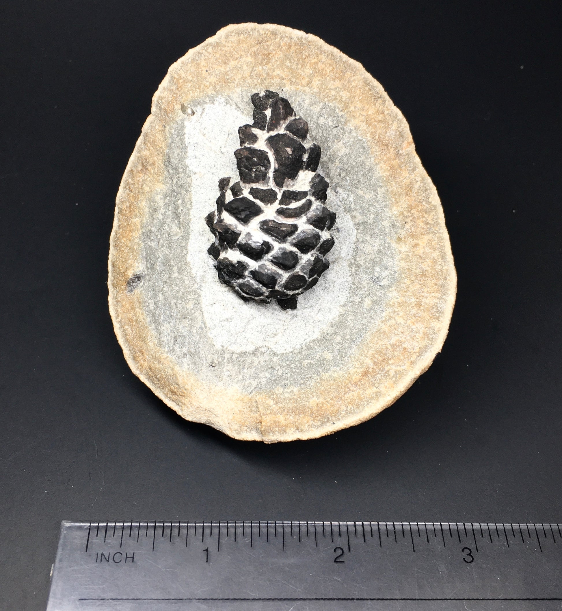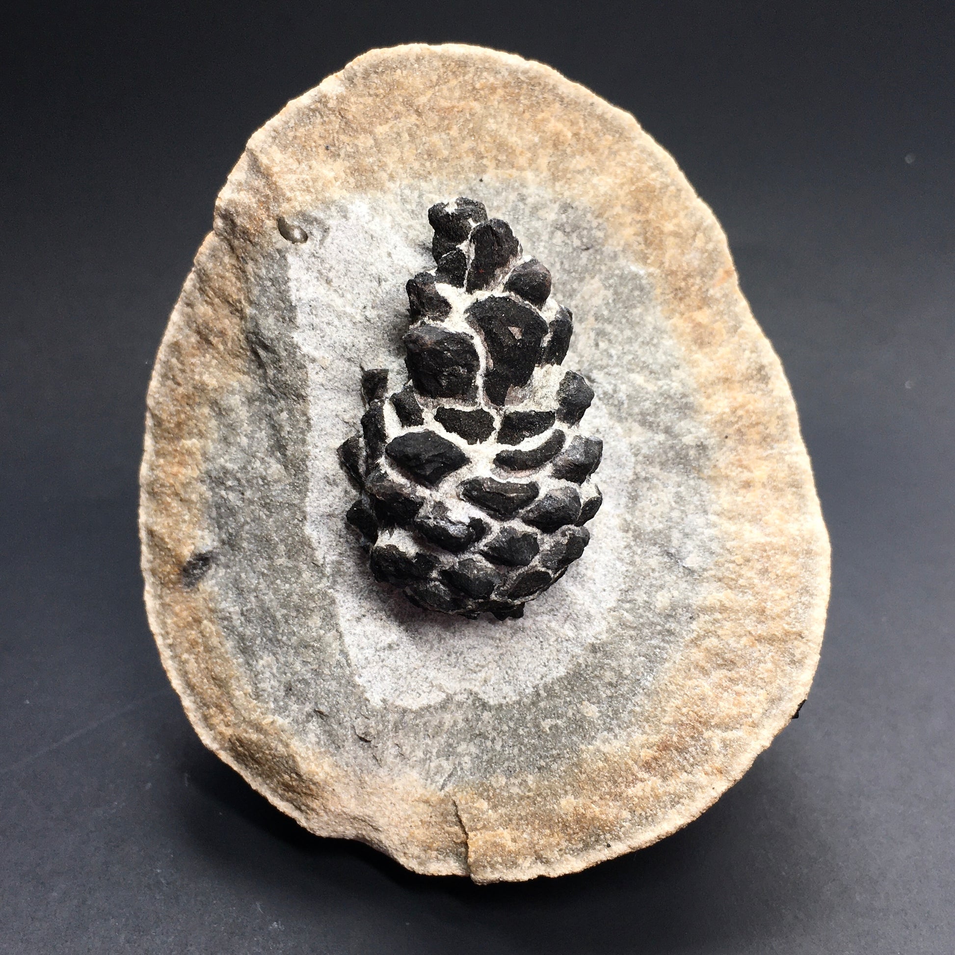 Nicknamed "Steinhardt peas," sandstone concretions formed around plant materials over 30 million years ago in the area of Steinhardt, Germany. The black of this specimen contrasting with the pale color of the sandstone indicates it is from a deposit where specimens are no longer found. The ancient coniferous Pinus trees dropped pine cones like this millions of years ago, only for us to find that the seeds from evergreens living today have remained very much the same.