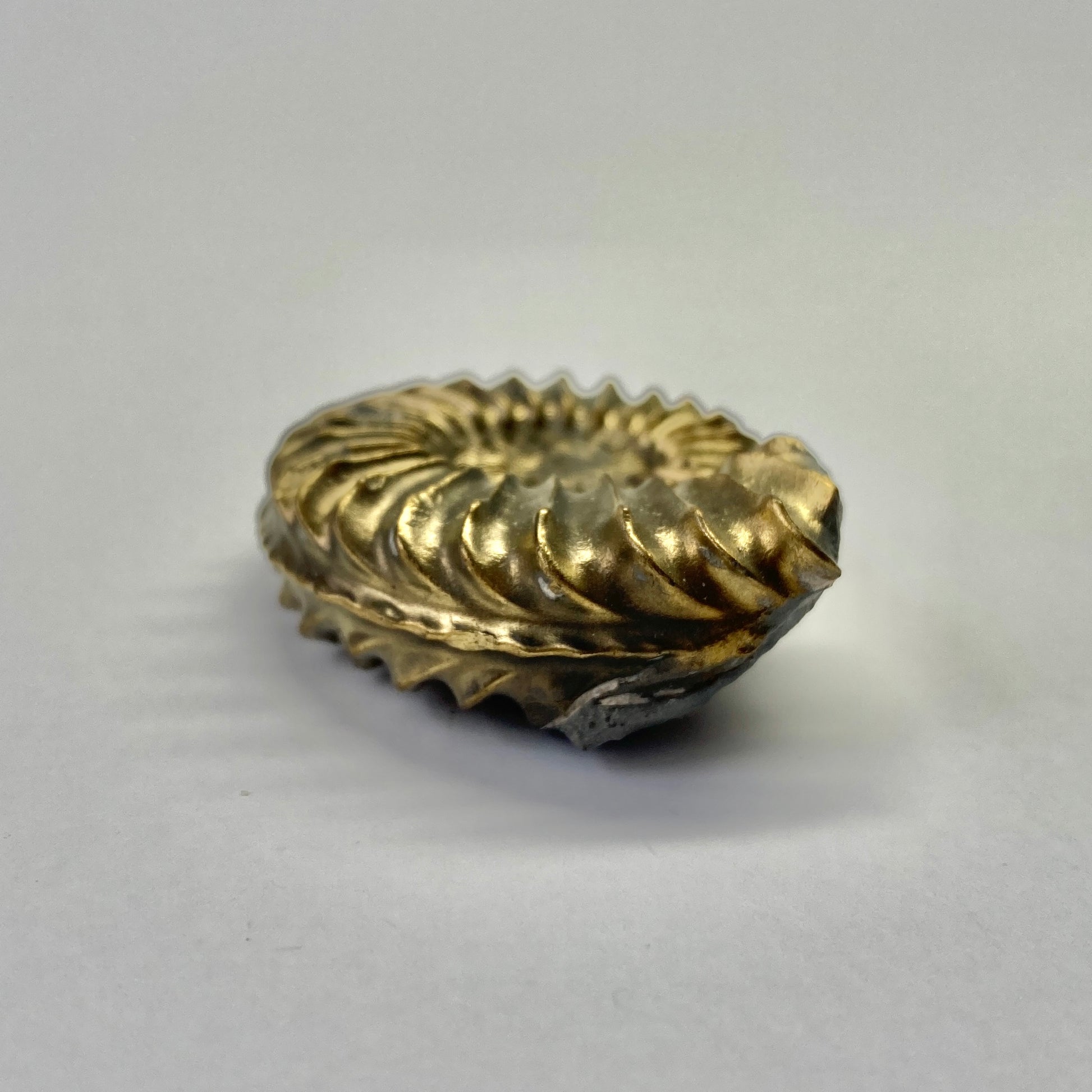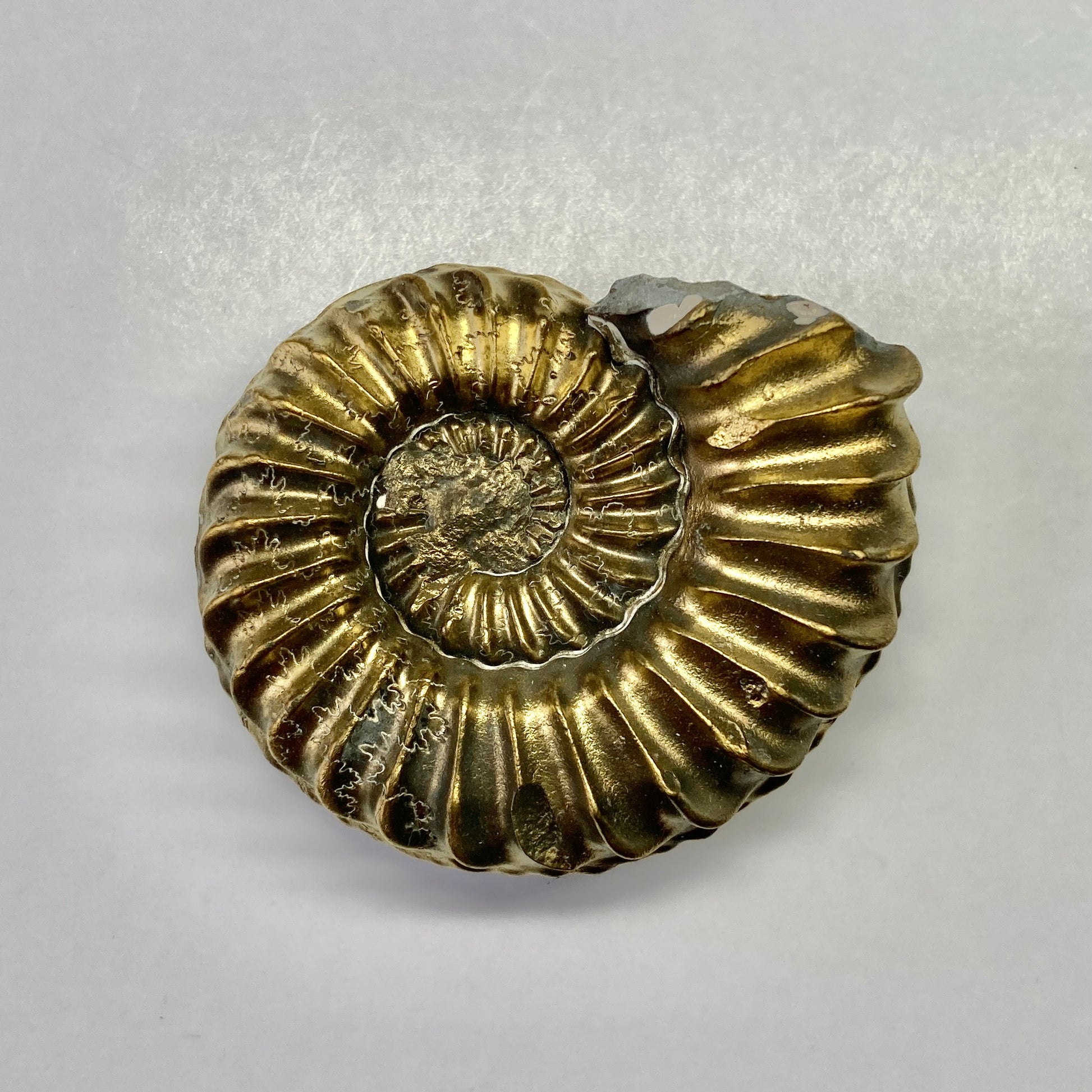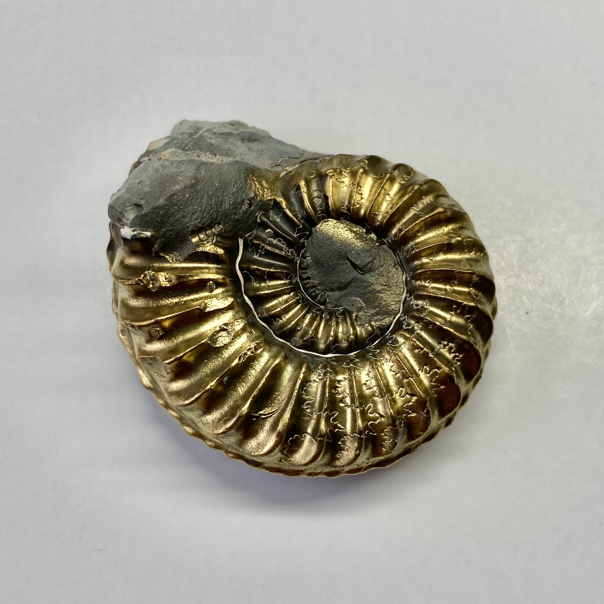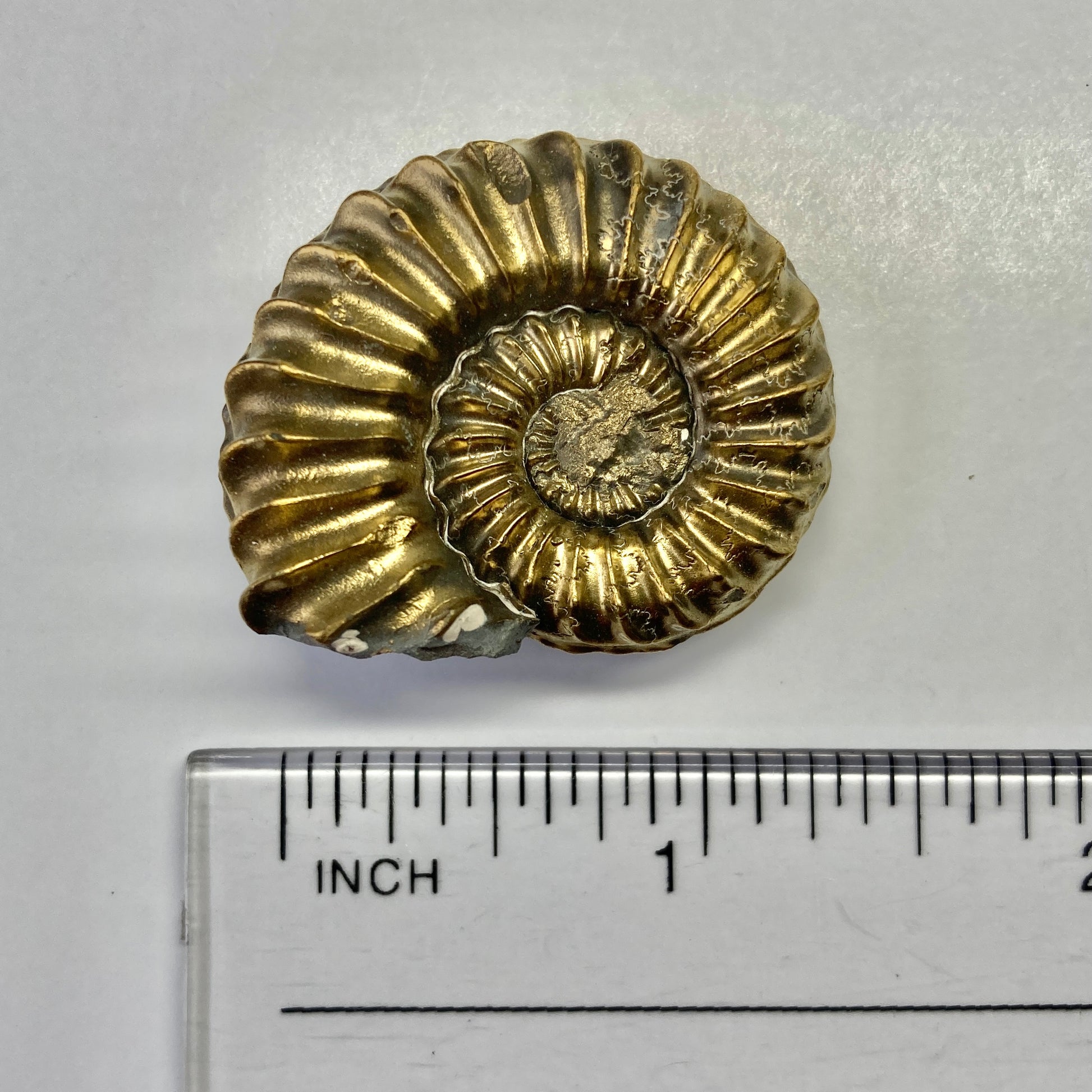 This naturally pyritized Pleuroceras ammonite was collected in Germany and is roughly 185 million years old. Despite its small size, the pyrite adds a noticeable weight to the specimen.