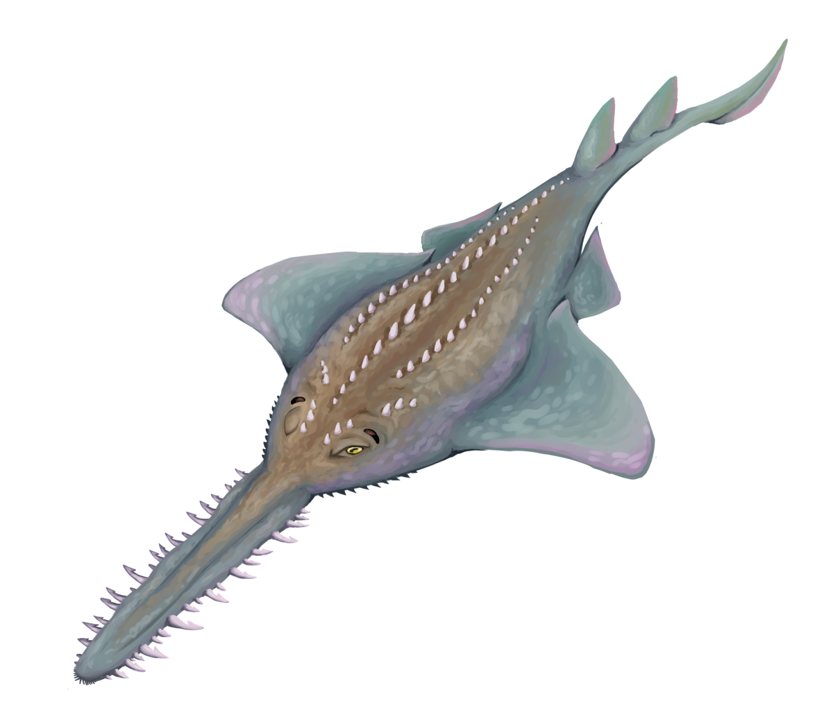 Similar to today's sawfish, it had a long rostrum saw which extended in front of the fish with rigid, tooth-like denticles. It is theorized to have been used to slash and stun prey or even predators like sharks and crocodiles. Sawfish teeth have been found embedded in Spinosaur jaws, proving these two beasts often clashed.