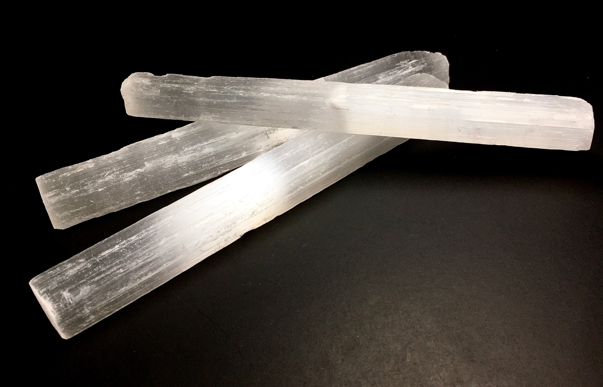 Selenite is a form of gypsum that means “stone of the moon." Gypsum can be found on every continent and can be dated as far back as 443 million years ago. Selenite satin spar is generally translucent or can exhibit some color.