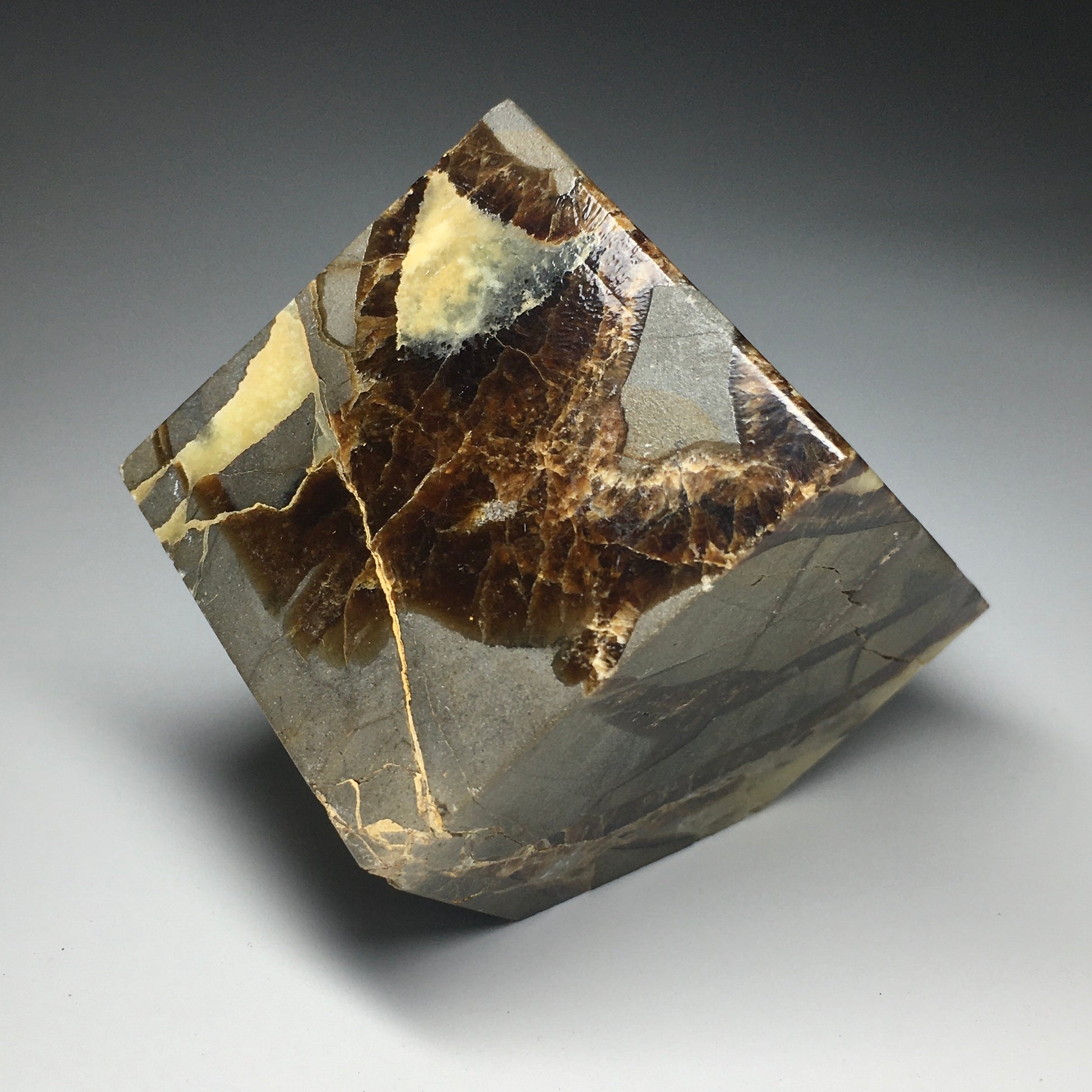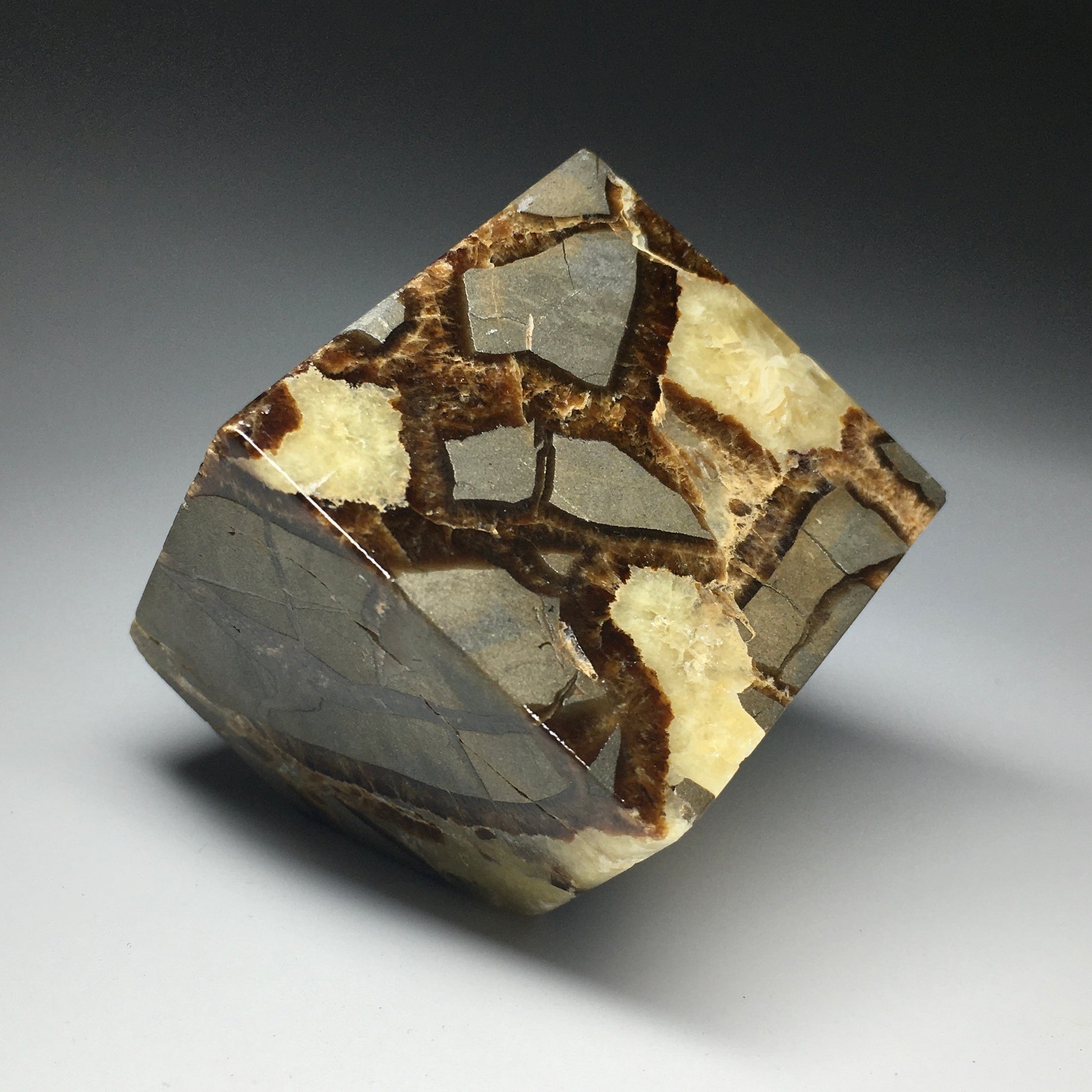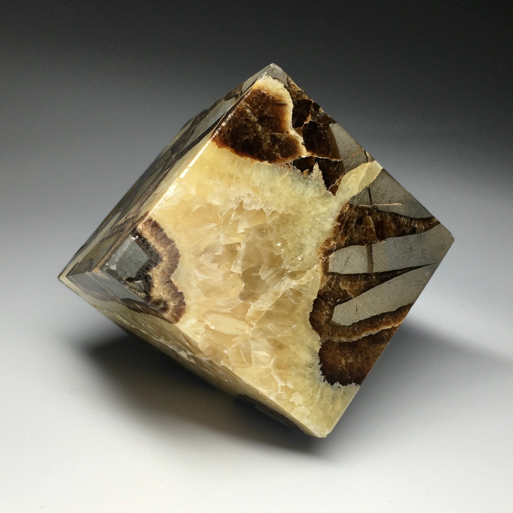 Have you ever seen such a beautiful concretion? Prop up this polished cube to see the dozens of crevices filled with crystals of yellow calcite and rivers of brown aragonite!