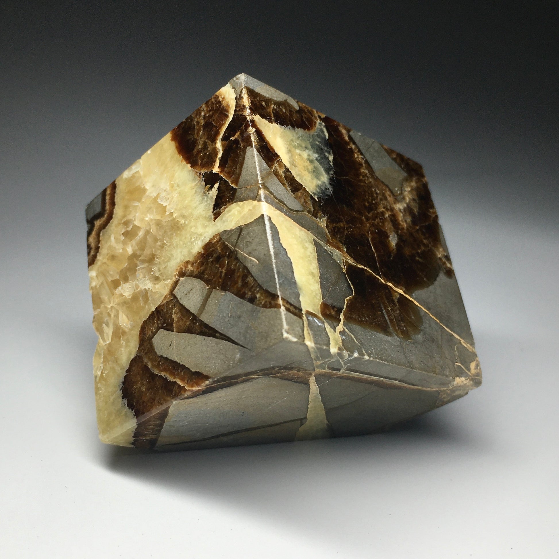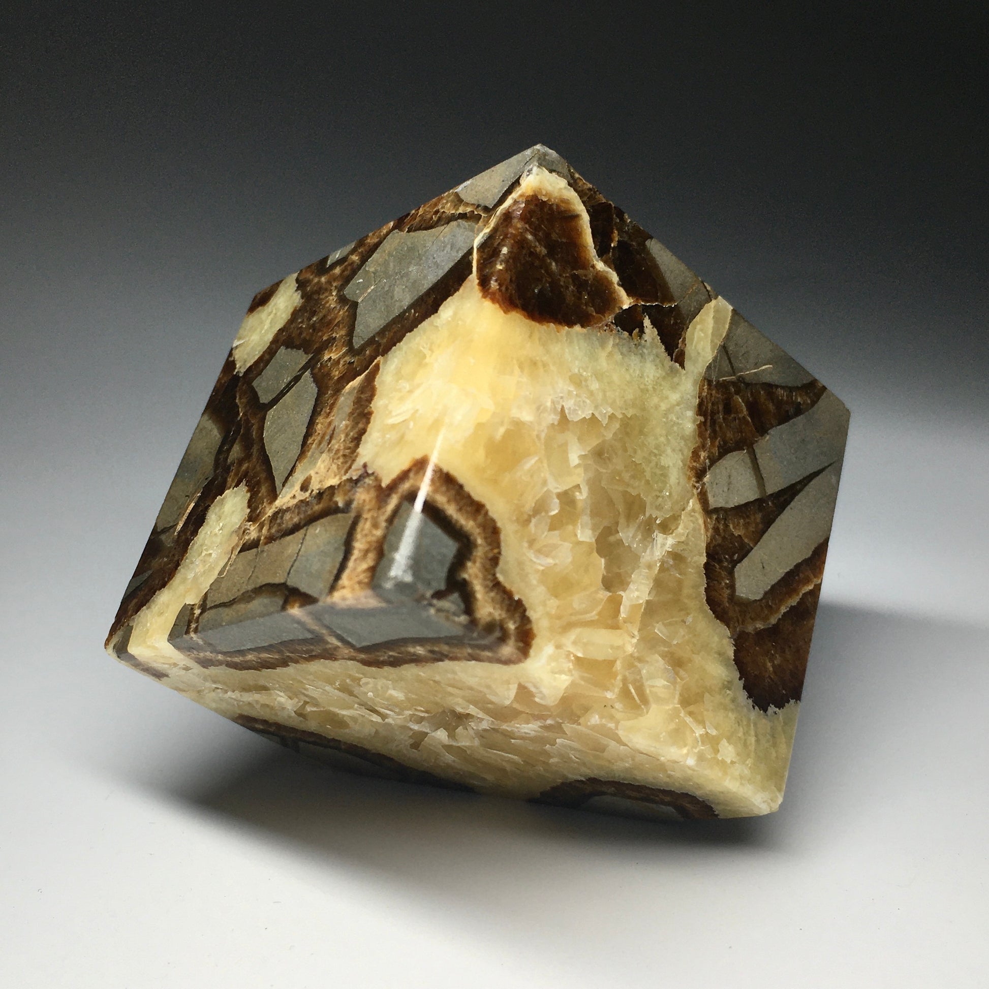 Septarians are concretions that have cracks or "septoria" filled with minerals like calcite (the yellow), aragonite (the brown) and limestone (the gray rock). Concretions were formed millions of years ago as decaying organic matter mixed with sediment. Septarian has been known to be called "dragon stone" as its cracked surface gives the allusion of the skin of a dragon.