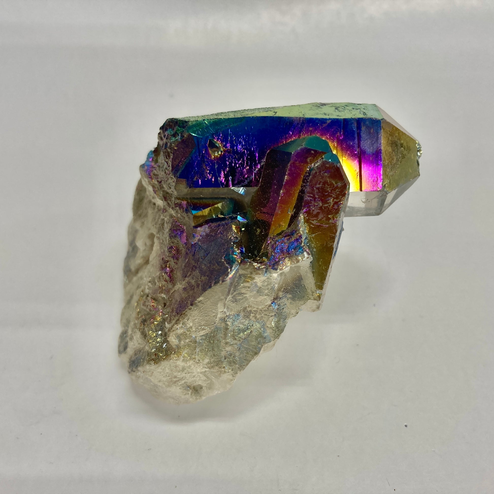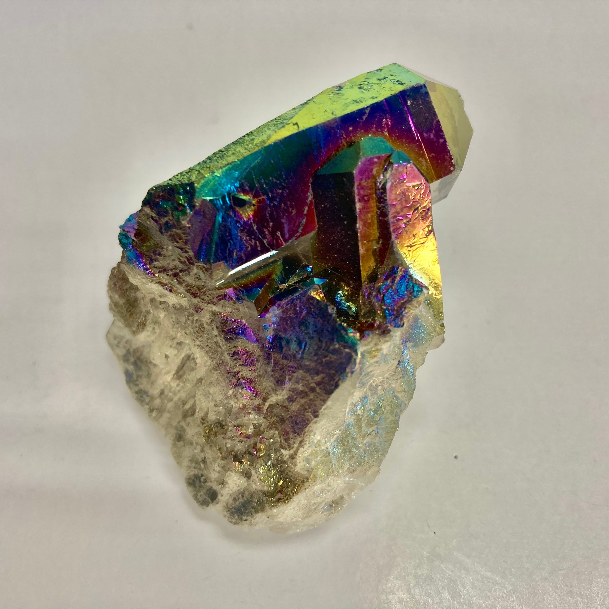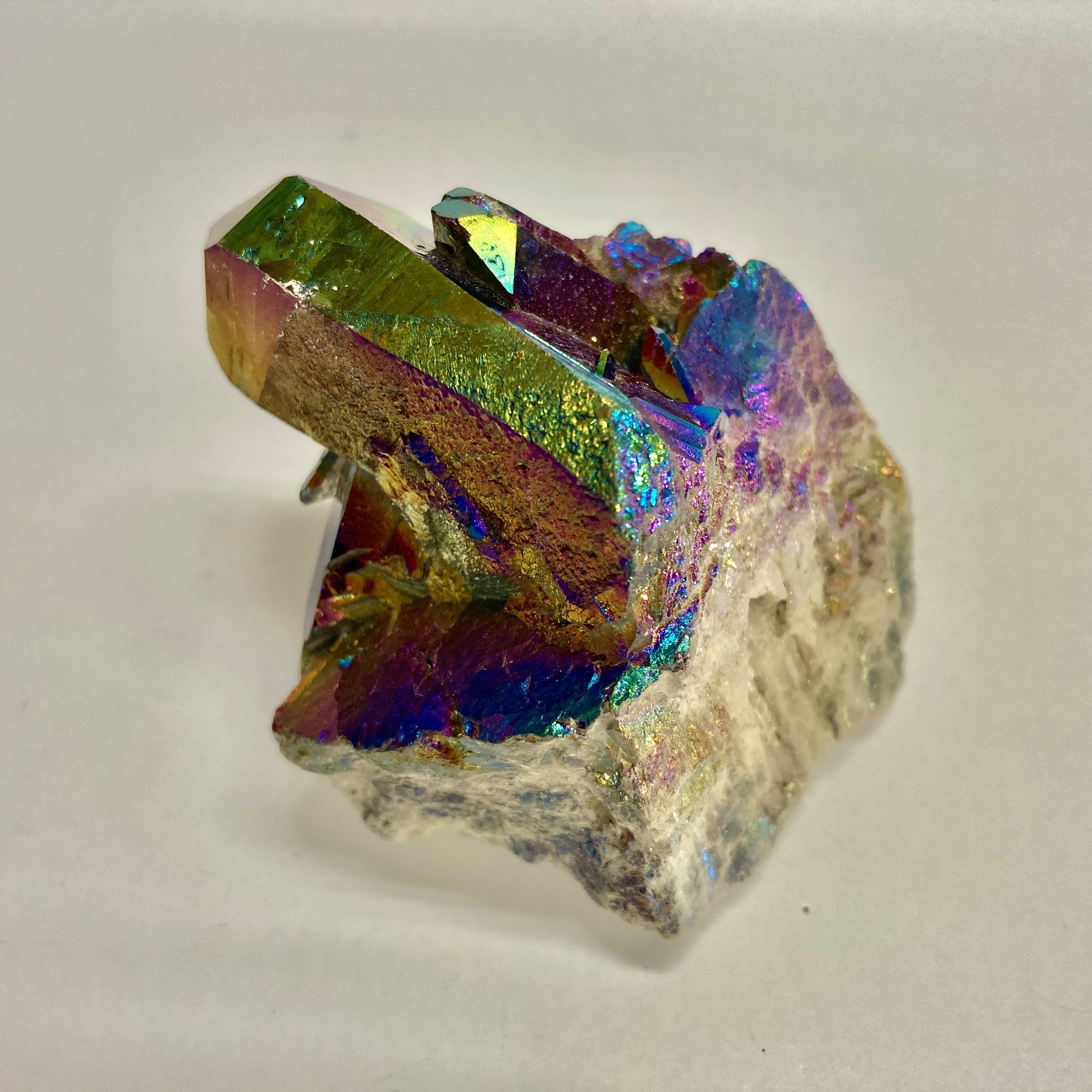 Natural quartz can be treated to fuse a layer of titanium to the surface through a process called magnetron ionization, resulting in mesmerizing coloring and a smooth metallic sheen.