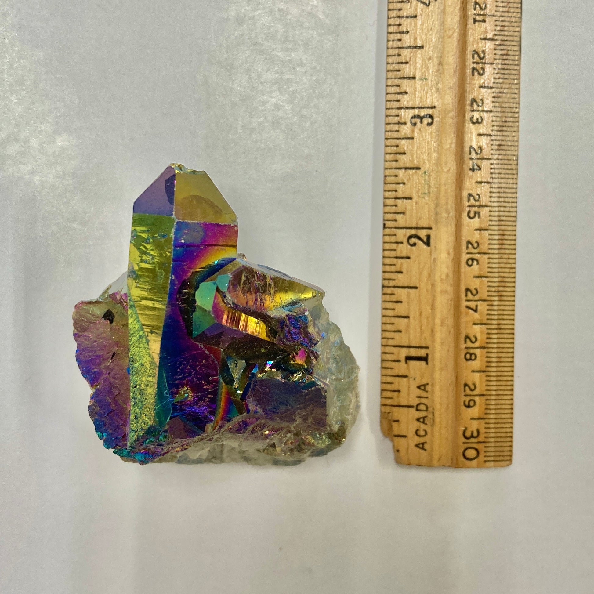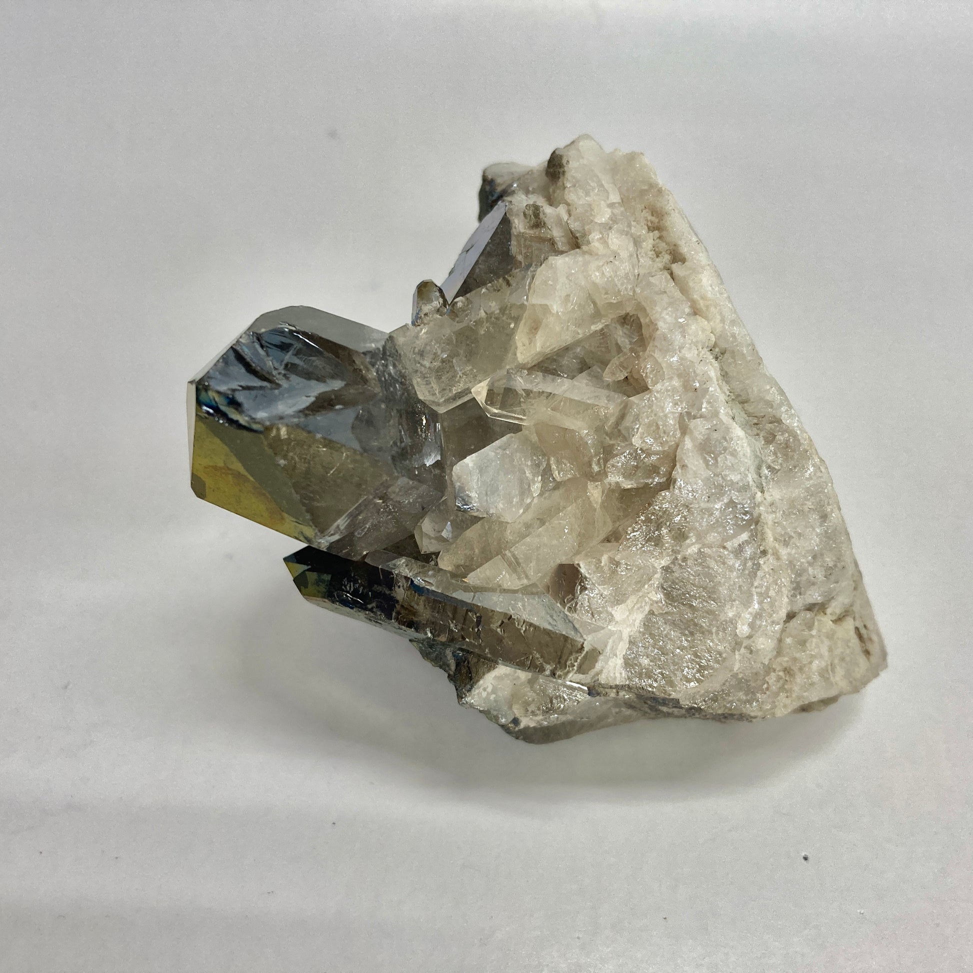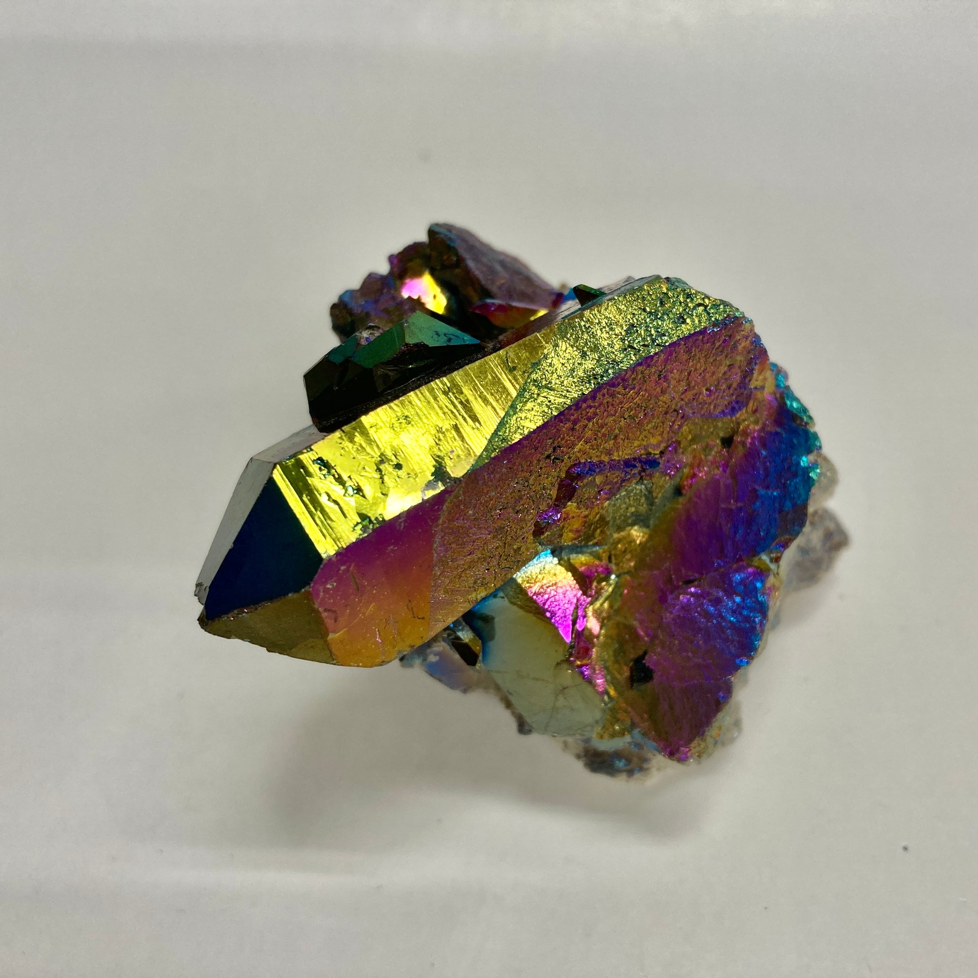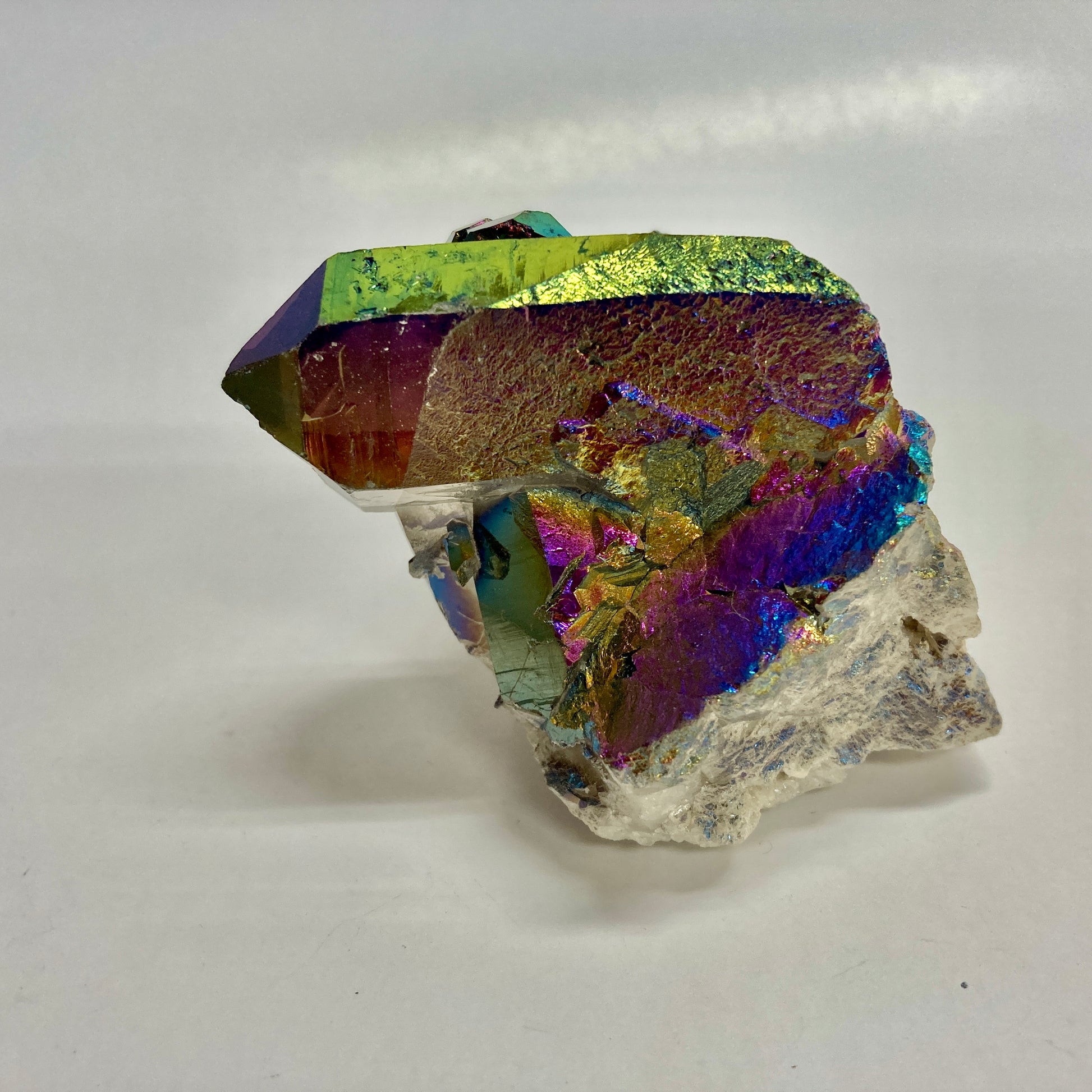 Natural quartz can be treated to fuse a layer of titanium to the surface through a process called magnetron ionization, resulting in mesmerizing coloring and a smooth metallic sheen.
