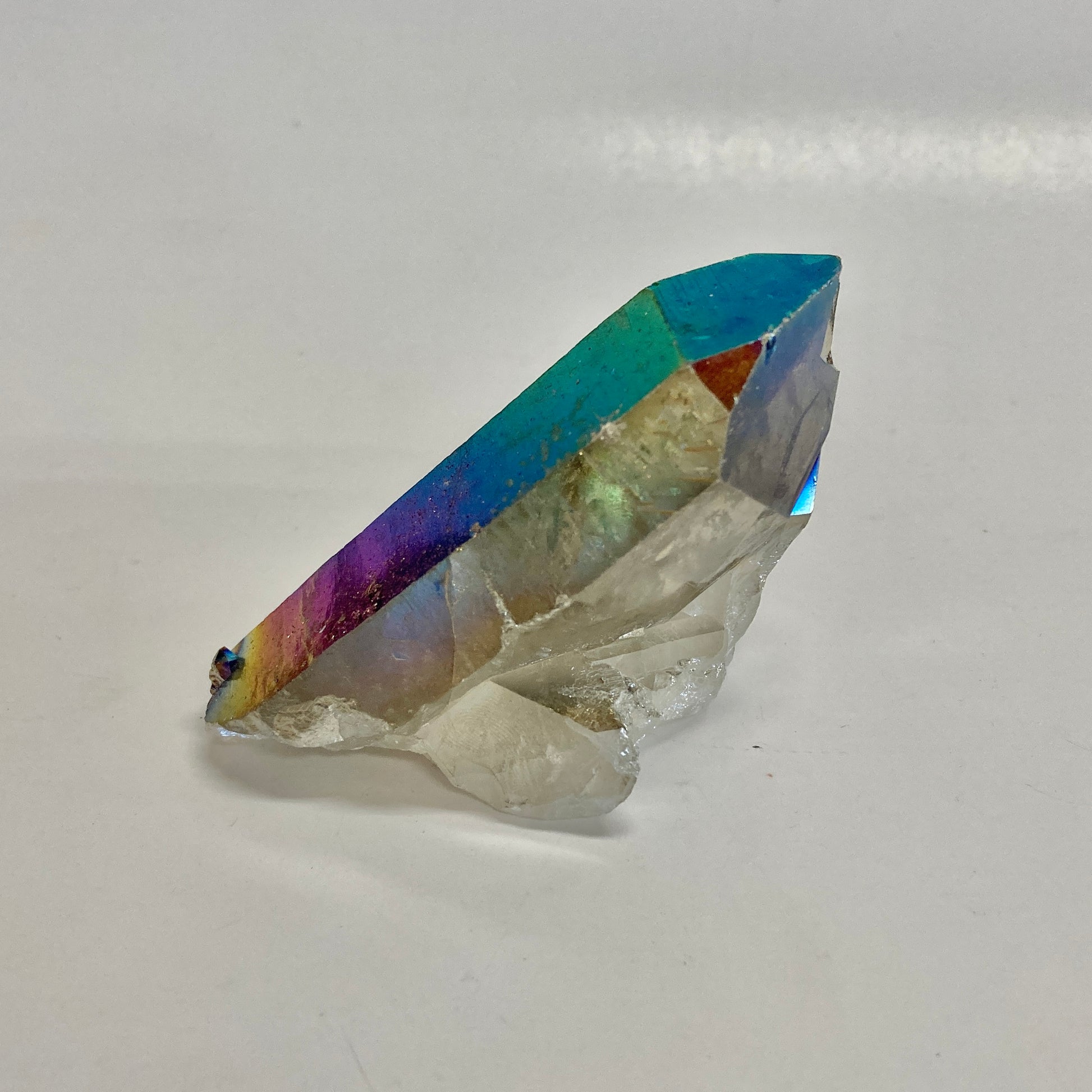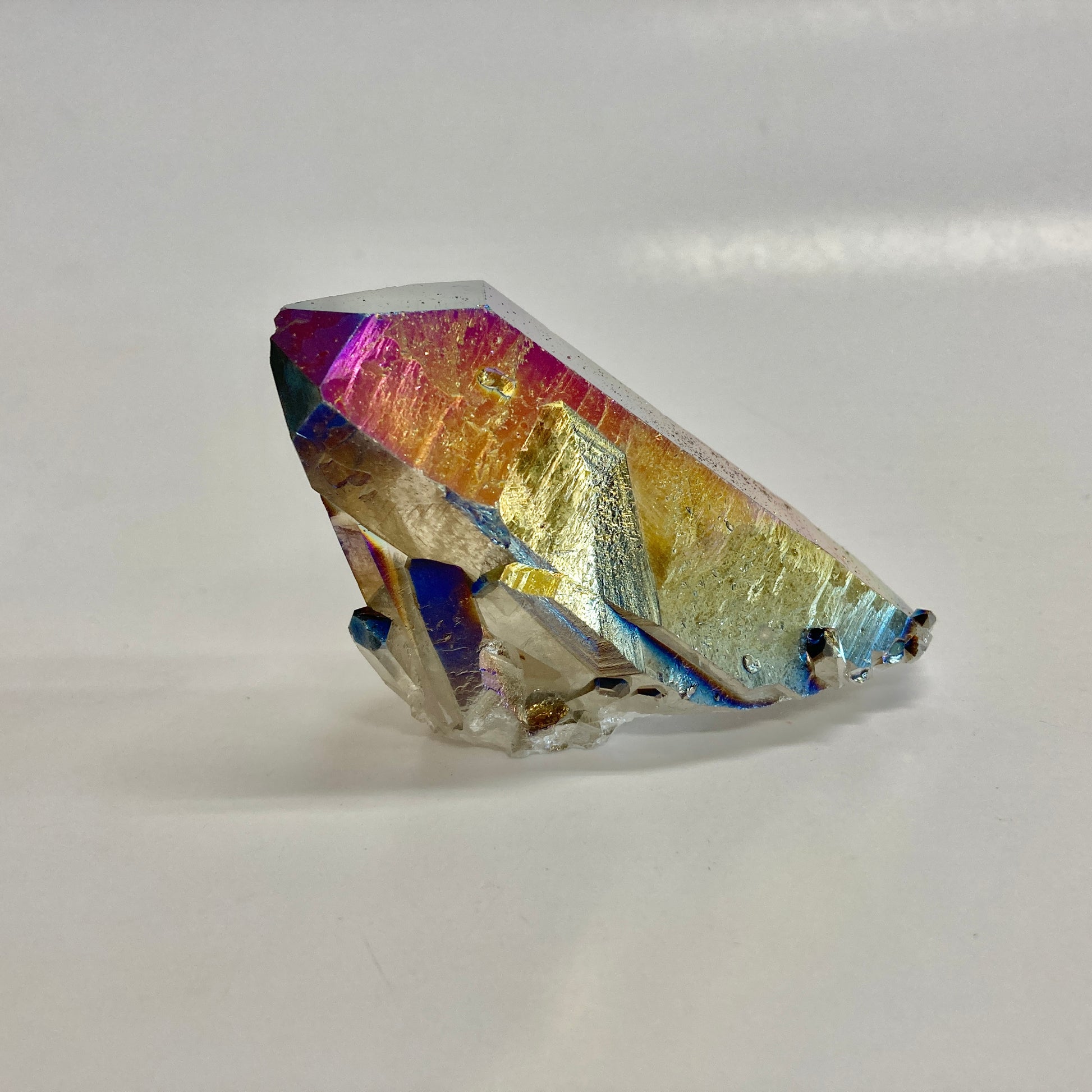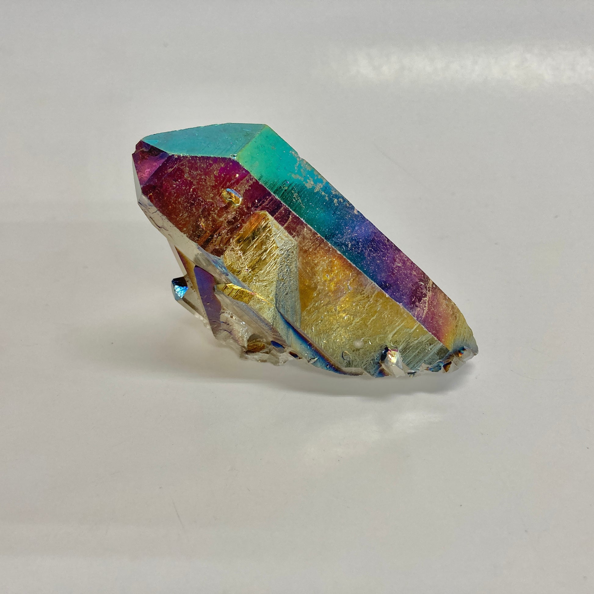 Natural quartz can be treated to fuse a layer of titanium to the surface through a process called magnetron ionization, in which vaporized titanium and other metal oxides are bonded to the quartz. This results in mesmerizing coloring and a smooth metallic sheen.