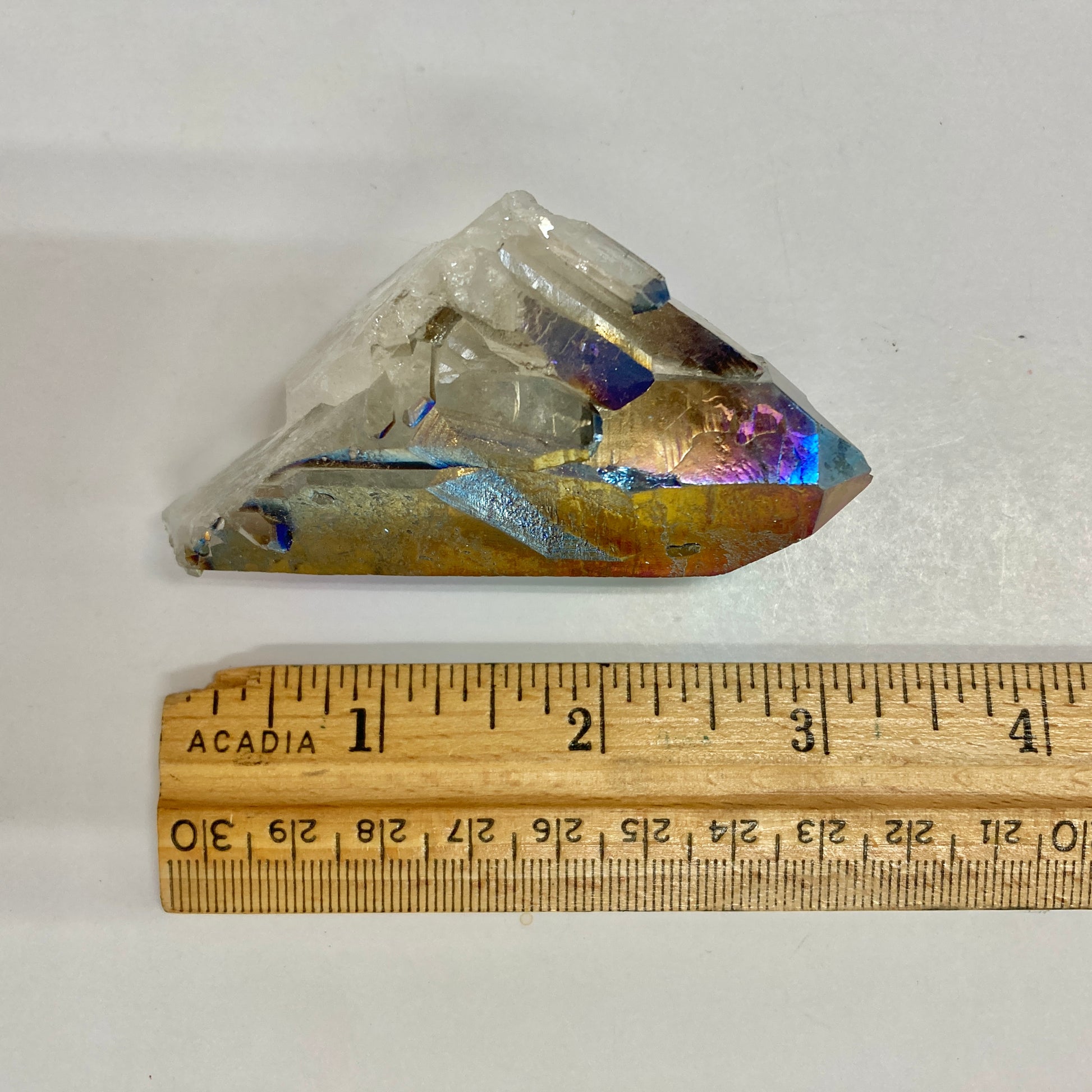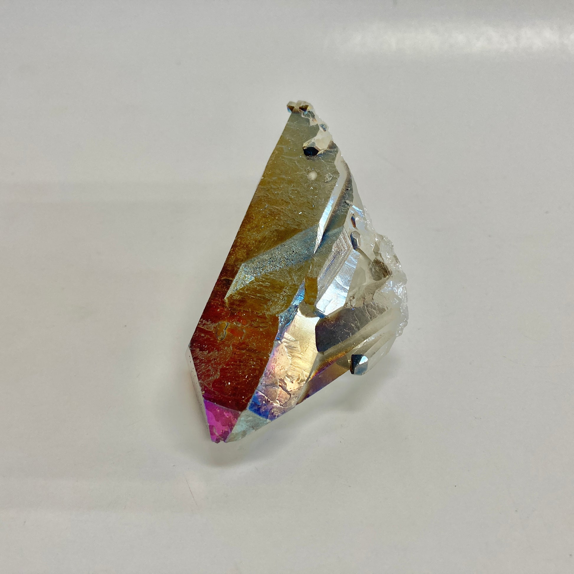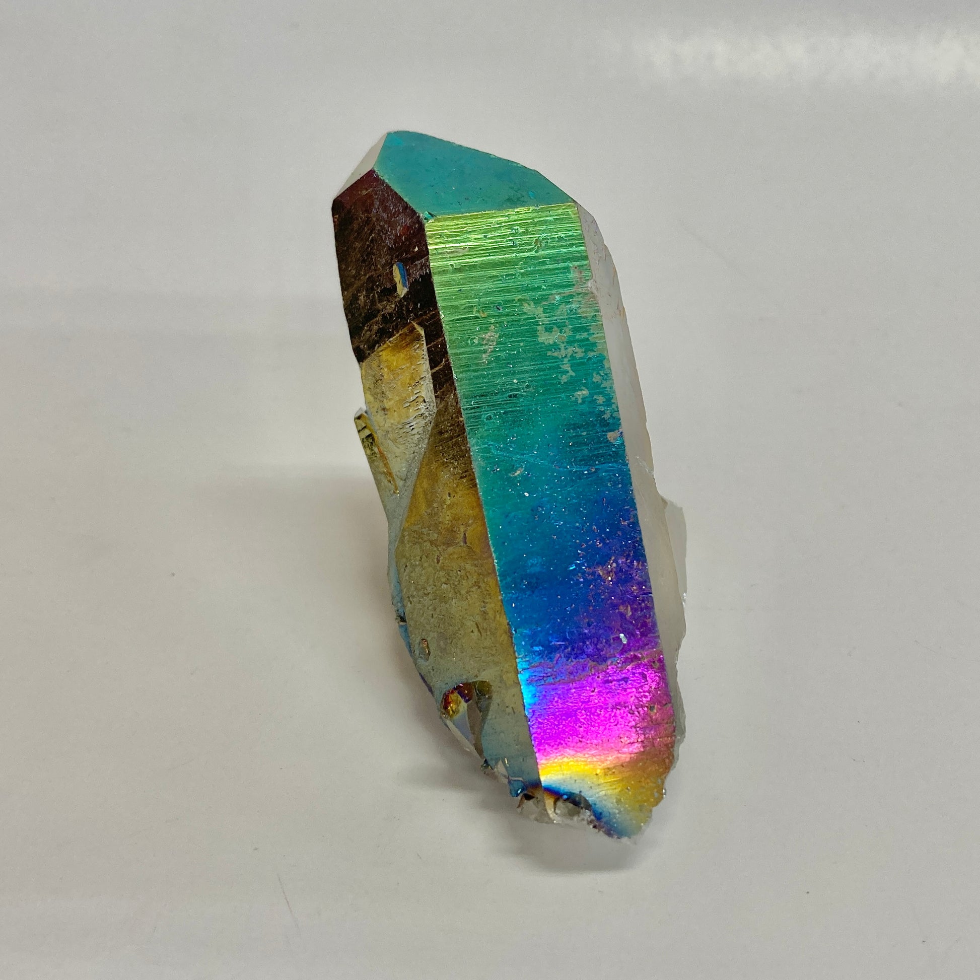 Natural quartz can be treated to fuse a layer of titanium to the surface through a process called magnetron ionization, in which vaporized titanium and other metal oxides are bonded to the quartz. This results in mesmerizing coloring and a smooth metallic sheen.