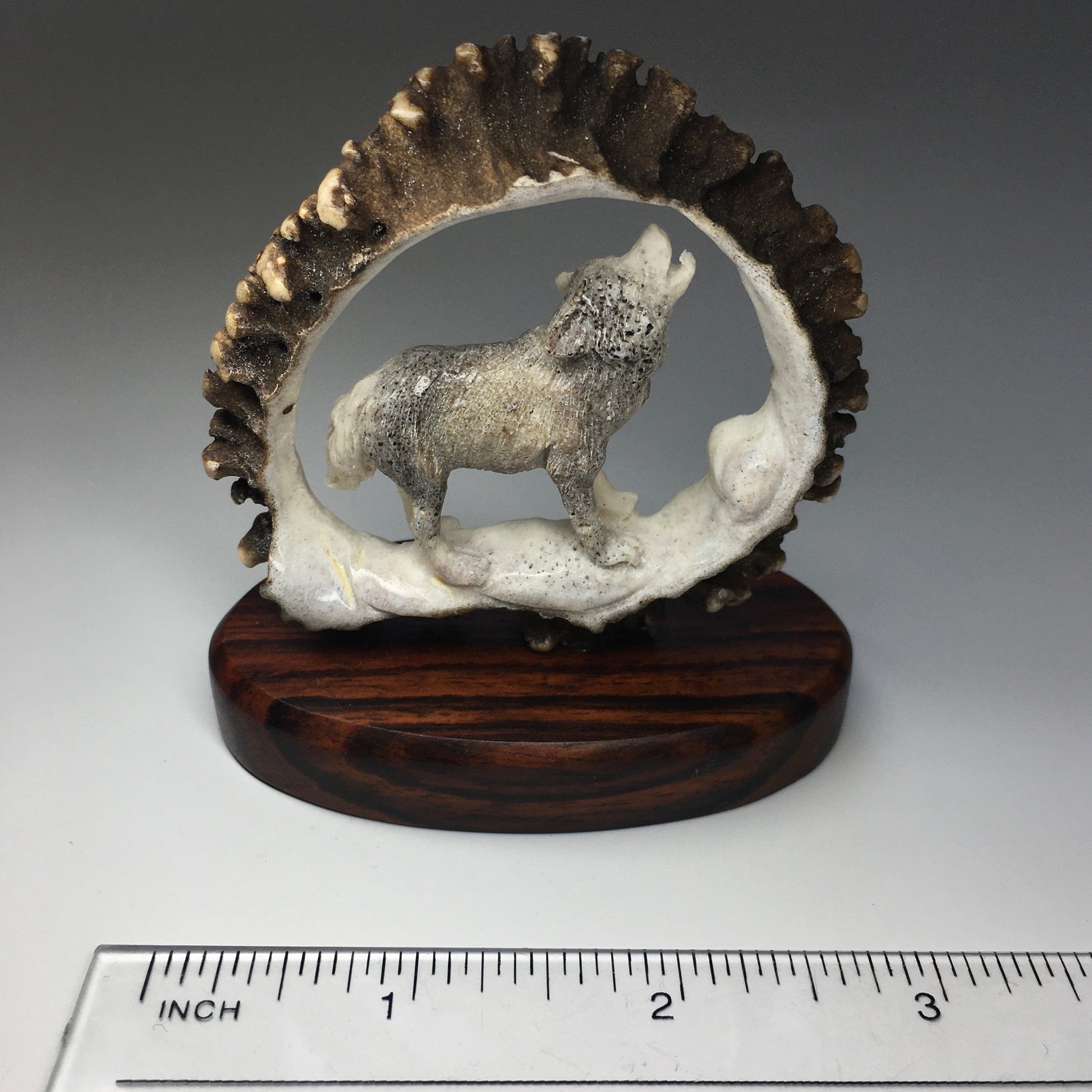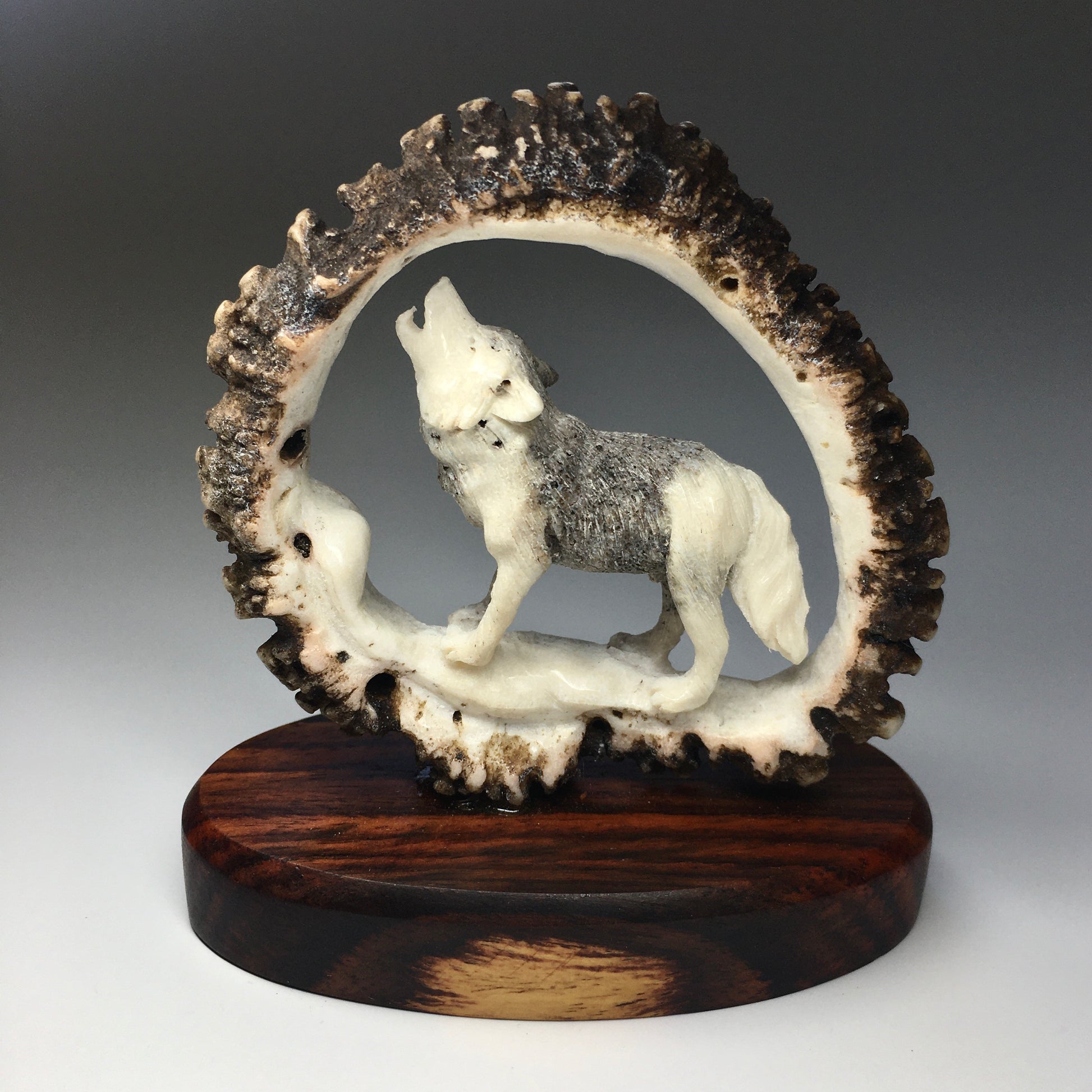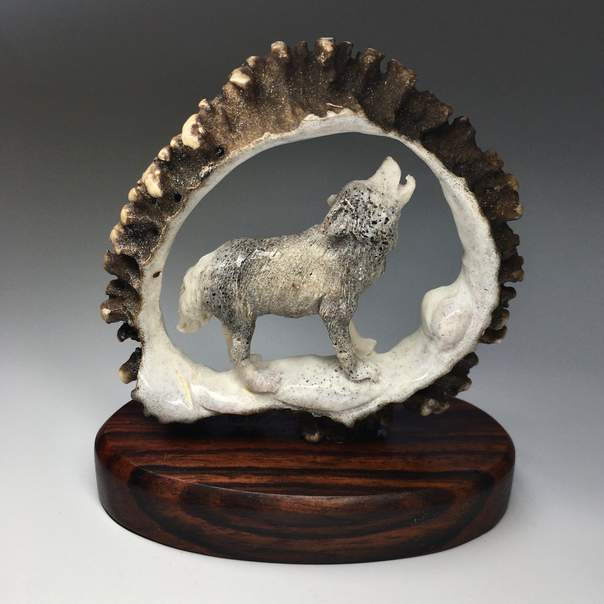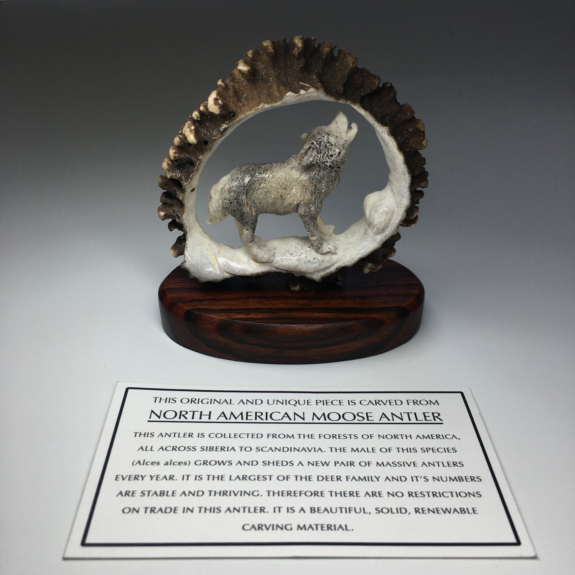 Harness the intelligence of the wolf and the strength of the moose when you have this carving! You can almost hear its doleful howl as its head is thrown back within the moon-colored interior of the moose antler.