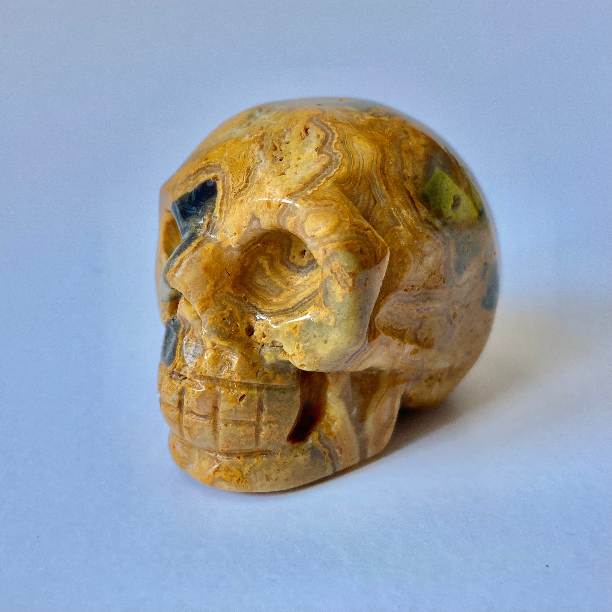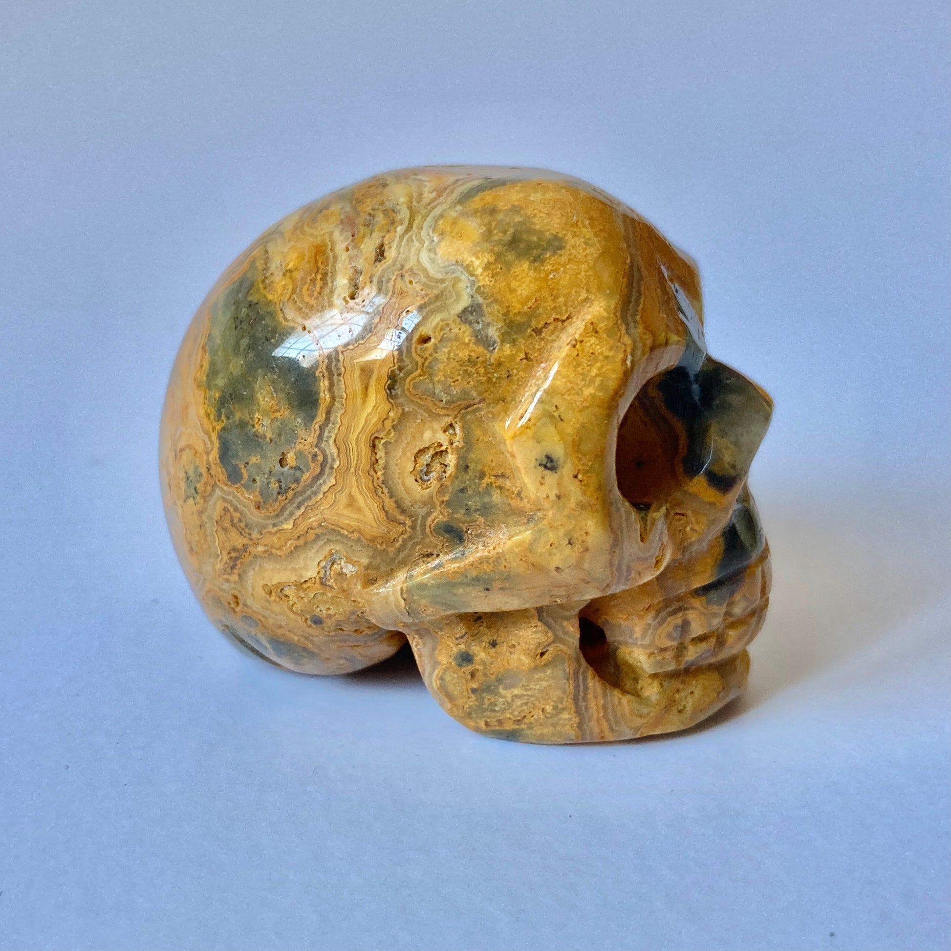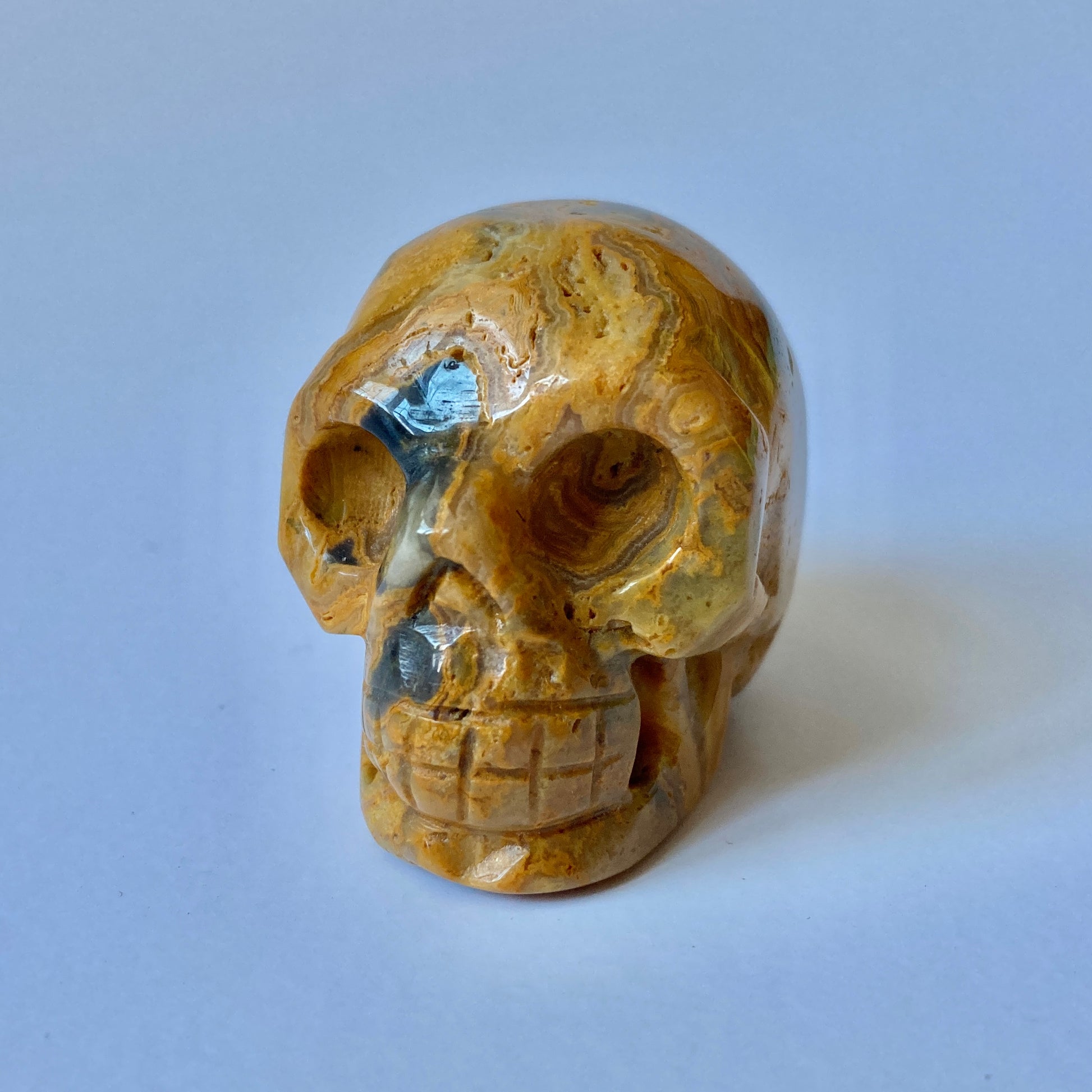 This yellow jasper skull owes much of its intrigue to the naturally intricate banding of the mineral.
