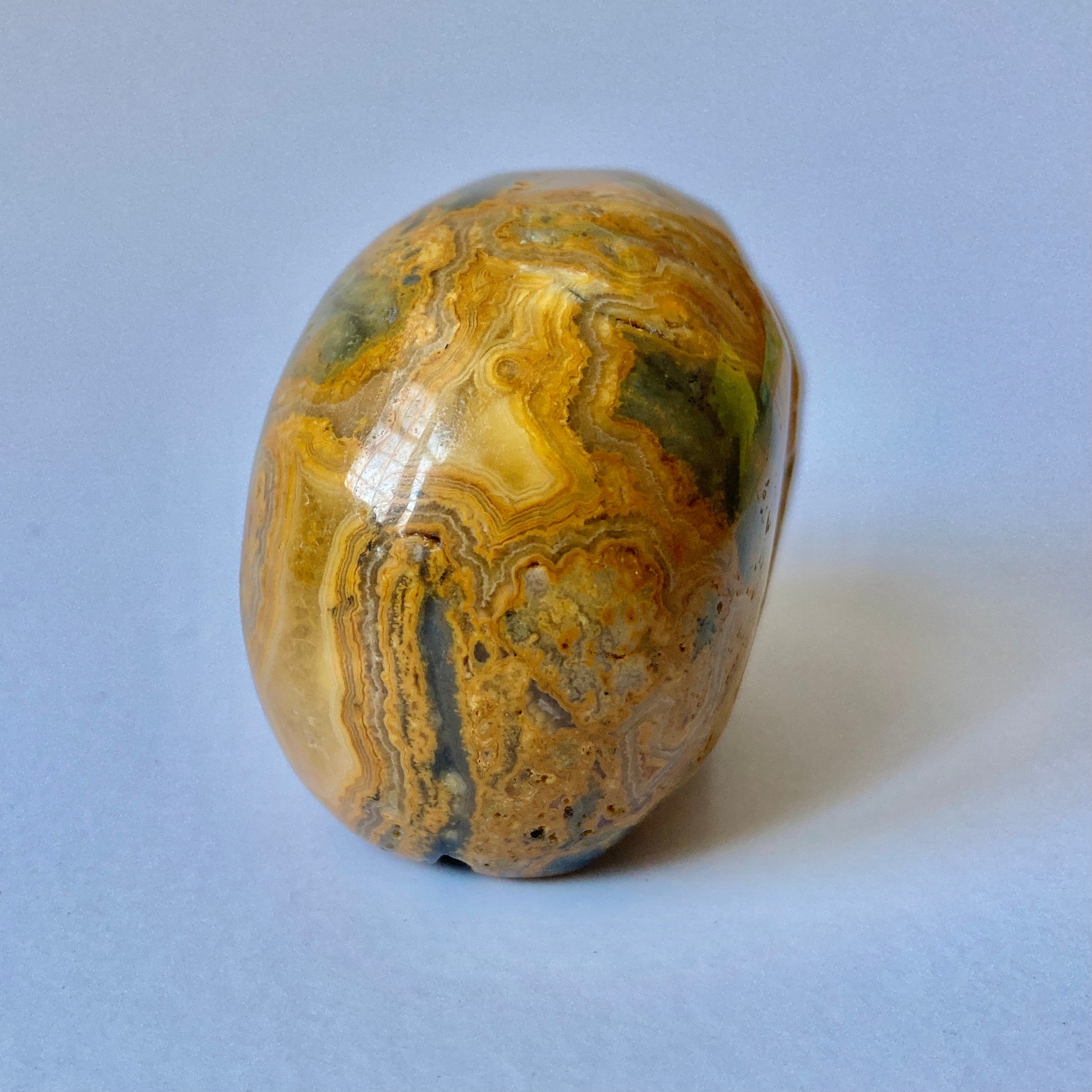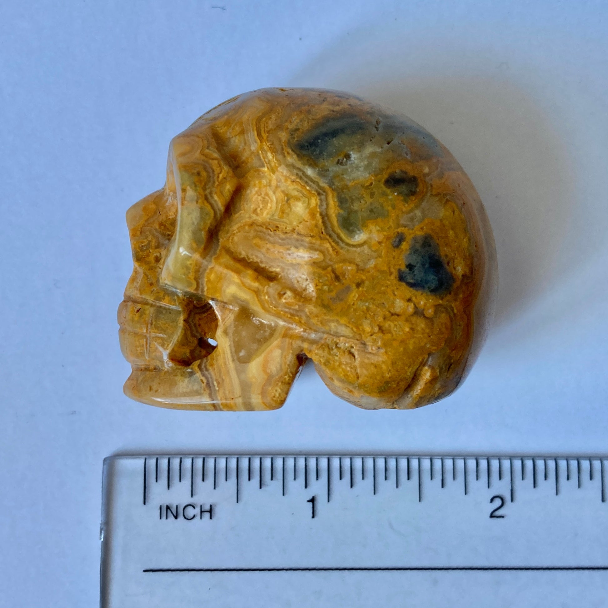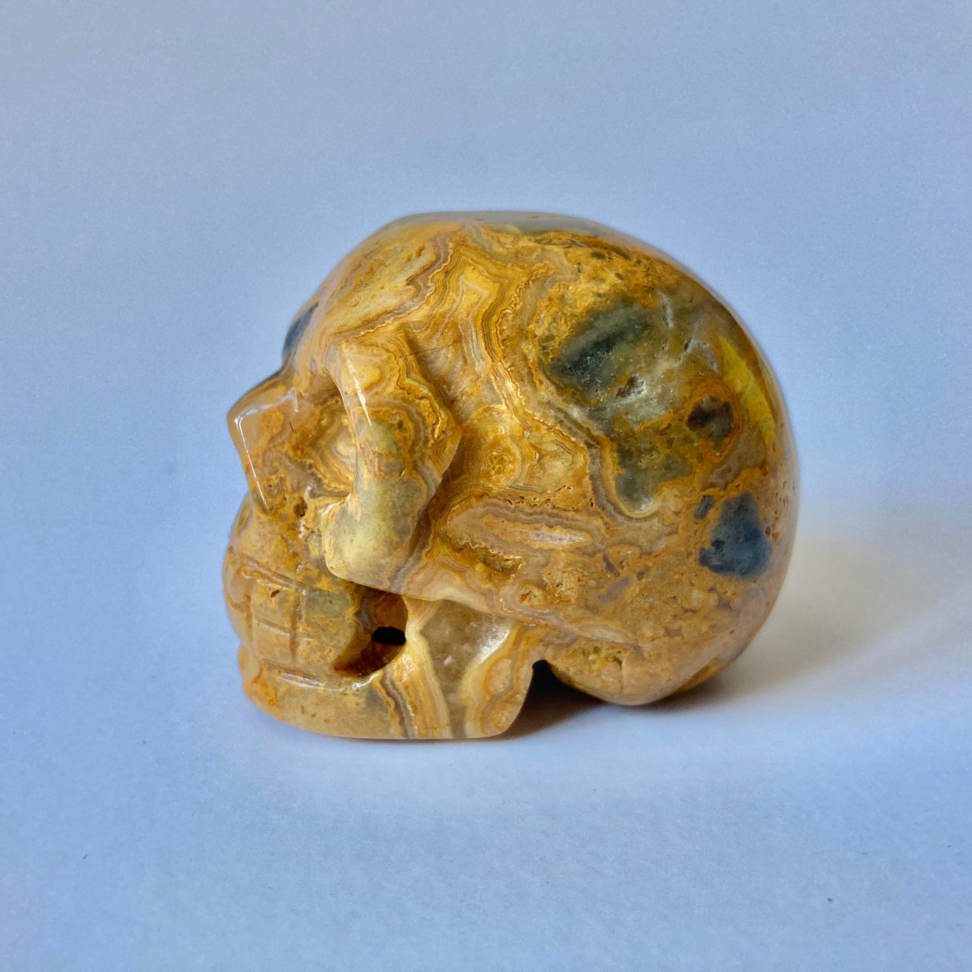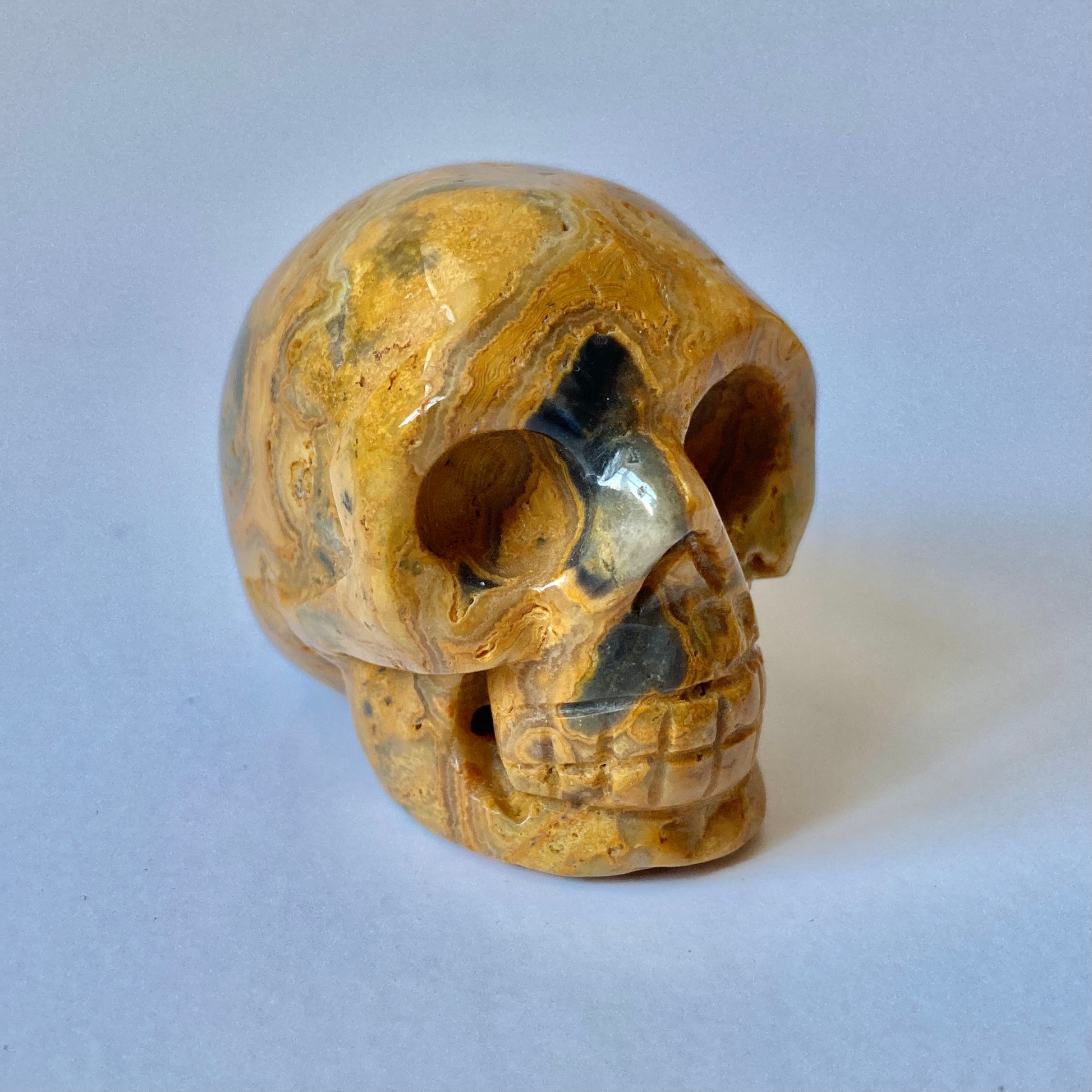 This yellow jasper skull owes much of its intrigue to the naturally intricate banding of the mineral.